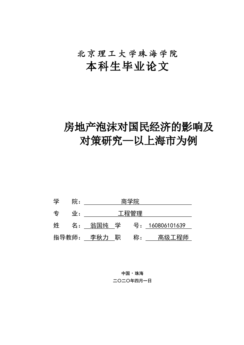 北京理工大学珠海学院本科生毕业论文房地产泡沫对国民经济的影响及对策研究一以上海市为例学商学院专业:工程管理姓名:翁国纯学号:160806101639指导教师:李秋力职称:高级工程师中国·珠海北京理工大学珠海学院2020届本科生毕业论文诚信承诺书本人郑重承诺:我所呈交的毕业论文《房地产泡沫对国民经济的影响及对策研究一以上海市为例》是在指导教师的指导下,独立开展研究取得的成果,文中引用他人的观点和材料,均在文后按顺序列出其参考文献,论文使用的数据真实可靠。承诺人签名:翁国纯日期:2020年5月4日北京理工大学珠海学院2020届本科生毕业论文摘要当前的经济模式中,房地产不但属于一种非常重要,可以在生产以及消费中直接使用的物质财富,而且其家庭财富以及企业资产的特性,使得房地产的虚拟资产特性一直在不断提升,进而房地产变成了金融资产之外的一种虚拟资产。除此之外,我国市场经济体制一直在不断地发展和完善,当前在各种资源配置方面的效率以及速度都有了很大的提升。为了追求货币资本的利益最大化实现,当前逐渐向着一些高回报的行业流动。这种背景之下,房地产本来就属于一种由资本化定价的行业,因此受到一些投机心理以及从众心理的影响,会使得整个经济系统发生紊乱,进而产生泡沫。特别是最近关于上海以及北京这样的大城市是否存在房地产泡沫,而泡沫现象破灭,就会产生主动买空以及资本出逃这些情况,既然货币就会快速的贬值,使得金融危机最终爆发。这样的争论越来越激烈,因此,针对这一问题进行讨论具有很重要的意义。关键词:房地产泡沫泡沫经济国民经济金融风险