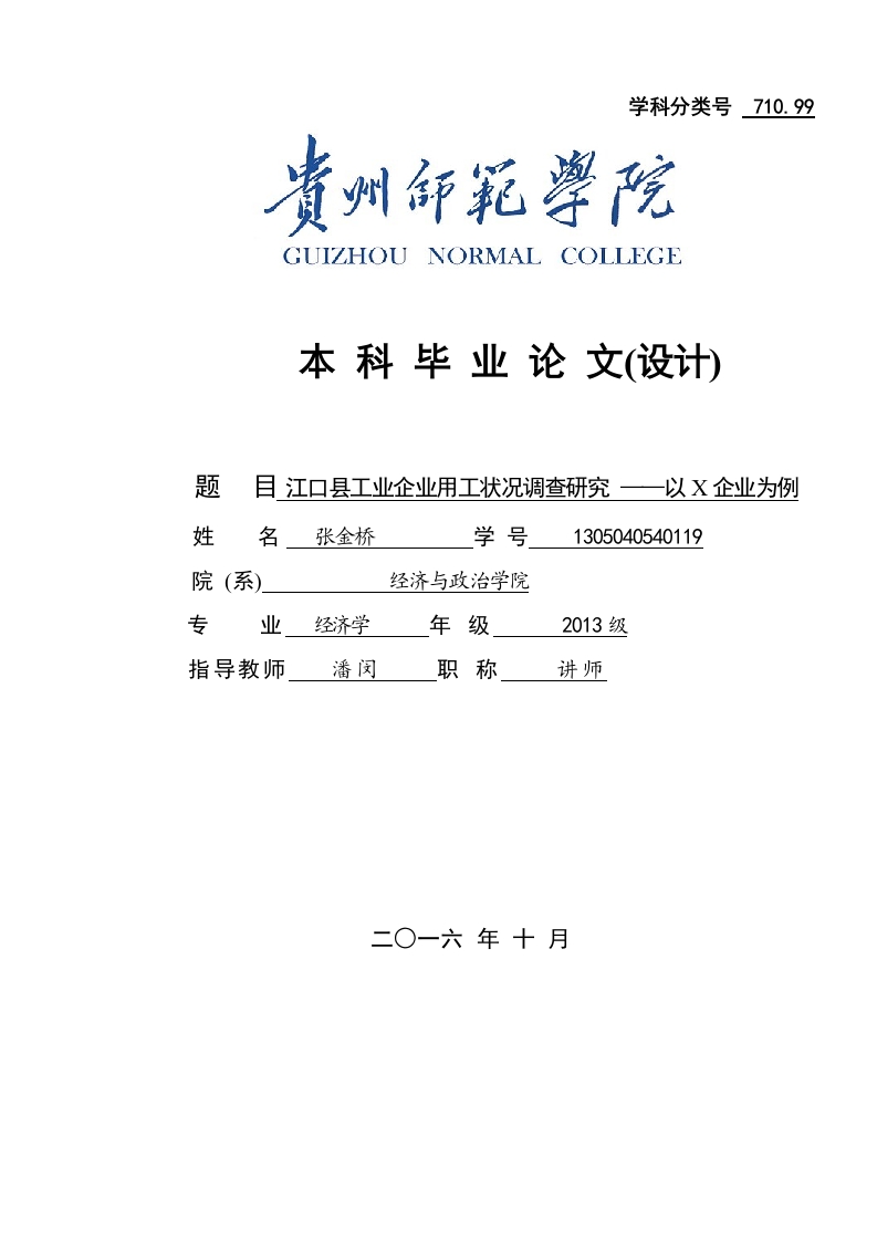 学科分类号710.99GUIZHOU NORMAL COLLEGE本科毕业论文(设计)题目江口县工业企业用工状况调查研究一以X企业为例姓名张金桥学号1305040540119院(系)经济与政治学院专业经济学年级2013级指导教师潘闵职称讲师二○一六年十月贵州师范学院本科毕业论文(设计)诚信声明本人郑重声明:所呈交的本科毕业论文(设计),是本人在指导老师的指导下,独立进行研究工作所取得的成果,成果不存在知识产权争议,除文中已经注明引用的内容外,本论文不含任何其他个人或集体已经发表或撰写过的作品成果。对本文的研究做出重要贡献的个人和集体均已在文中以明确方式标明。本人完全意识到本声明的法律结果由本人承担。本科毕业论文作者签名:张金桥2016年10月15日贵州师范学院毕业论文(设计)目录Abstract.一、江口县经济概况分析..2二、江口县经济概况分析...3(一)江口县简介33三、江口县工业企业用工的现状及特点(一)江口县工业企业的用工现状...(二)江口县工业企业用工的特点...(三)江口县工业企业用工短缺的原因分析68(一)江口县X公司用工情况调查...(二)X公司用工困境的原因分析8五、对策建议…1313(二)多种途径引进人才13(三)加强培训重视开发..13(四)完善绩效薪酬管理14(五)重视企业文化建设15参考文献