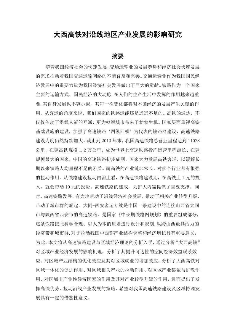 大西高铁对沿线地区产业发展的影响研究摘要随着我国经济社会的快速发展,交通运输业的发展趋势和经济社会快速发展的需求推动着我国交通运输网络的不断普及和完普。交通运输业作为我国国民经济发展中的重要力量为我国经济社会发展做出了巨大的贡献。铁路作为一个国家主要的运输方式、国民经济的大动脉,在人们的生产生活中发挥的作用越来越重要,其自身发展也不容小觑,其每一次变化都将对本国经济的发展产生关键的作用。从客运的角度来说,我们国家的铁路运能还是远远不足的。高铁的通达,不仅仅催动了沿线人流的互通,更为枢纽城市带来了勃勃生机。国家层面重视高铁基础设施的建设,加强了高速铁路‘四纵四横’为代表的铁路网建设,高速铁路建设力度仍然持续加大。截止到2013年末,我国高速铁路总营业里程达到11028公里,在建高铁规模1.2万公里,成为世界上高速铁路投产运营里程最长、在建规模最大的国家,中国的高速铁路初步成网。国家大力发展高铁客运,以缓解长期以来铁路人均里程不足的矛盾。而高铁的产业链非常长,对多个行业都有很强的拉动作用。从铁路建设拉动内需上看,在高速铁路建设期,在高铁上1元的投入,就会带动10元的投资。高速铁路的建成,为扩大内需提供了重要支撑。同时,高速铁路发展,有力地带动了沿线经济社会发展,带动了相关产业转型升级,带动了城市群的崛起。大同-西安客运专线是中国一条建设中的连接山西省大同市与陕西省西安市的高速铁路,是国家《中长期铁路网规划》的重要组成部分,这条铁路按照科学合理、以人为本的原则进行设计和规划,纵跨山西最具活力的经济带和城市群,对于拉动我国中西部产业结构调整和经济增长具有重要意义。为此,本文将从高速铁路建设与区域经济理论的分析入手,通过分析“大西高铁”对区域产业经济发展的影响机理,分析了其提升可达性的空间经济效益联系效应、对区域产业结构的优化效应及其对区域就业的增加效应,分析了大西高铁对区域一体化的促进作用、对区域相关产业的拉动作用、对区域产业集聚与扩散作用、对区域非产业性经济因素的作用及其对产业转型升级的作用,进而提出了发挥高铁优势,拉动沿线产业发展的策略,希望对我国高速铁路建设及区域协调发展具有一定的借鉴性意义。关键词:大西高铁,沿线地区,产业发展,辐射带动ABSTRACTWith the rapid development of China's economic and social,the trend of thedevelopment of transportation industry and the rapid development of economy andsociety demand driving the expansion and improvement of China's transportationnetwork.Transportation industry as an important force in the development of thenational economy made a great contribution to China's economic and socialdevelopment.Mode of transportation of the railway as a country mainly,the artery ofnational economy,in the role of more and more important in people's production andlife,do not underestimate their own development,its every change will produce keyrole on the development of its economy.From the point of view of passengertransport,railway transport capacity is far less than our country.High-speed access,suggesting not just along the flow of communication,more hub cities has broughtvitality.National level attaches great importance to the construction of high-speed railinfrastructure,strengthen the high speed railway represented been cross rail networkconstruction,high speed railway construction is still increasing.By the end of 2013,China has reached 11028 kilometers,the total mileage of high speed railway underconstruction 12000 km high-speed rail scale,become the world's longest high-speedrail operation mileage,the largest country in the construction scale,preliminary intoChina's high-speed rail network.Countries to develop high-speed railway passengertransportation,to ease the railway mileage per capita insufficient contradiction for along time.But the high-speed rail industry chain is very long,have very strong pullingeffect on multiple industries.Look from the railway construction of stimulatingdomestic demand,in the high-speed railway construction,on the high-speed rail 1yuan of investment,will drive the investment of 10 yuan.High-speed railway iscompleted,will provide an important support for expanding domestic demand.At thesame time,the high-speed railway development,effectively drive along the economicand social development,drive the related industrial transformation and upgrading,ledto the emergence of urban agglomeration.Datong xian construction of passengerdedicated line is a China connection in datong city,Shanxi Province and shaanxi