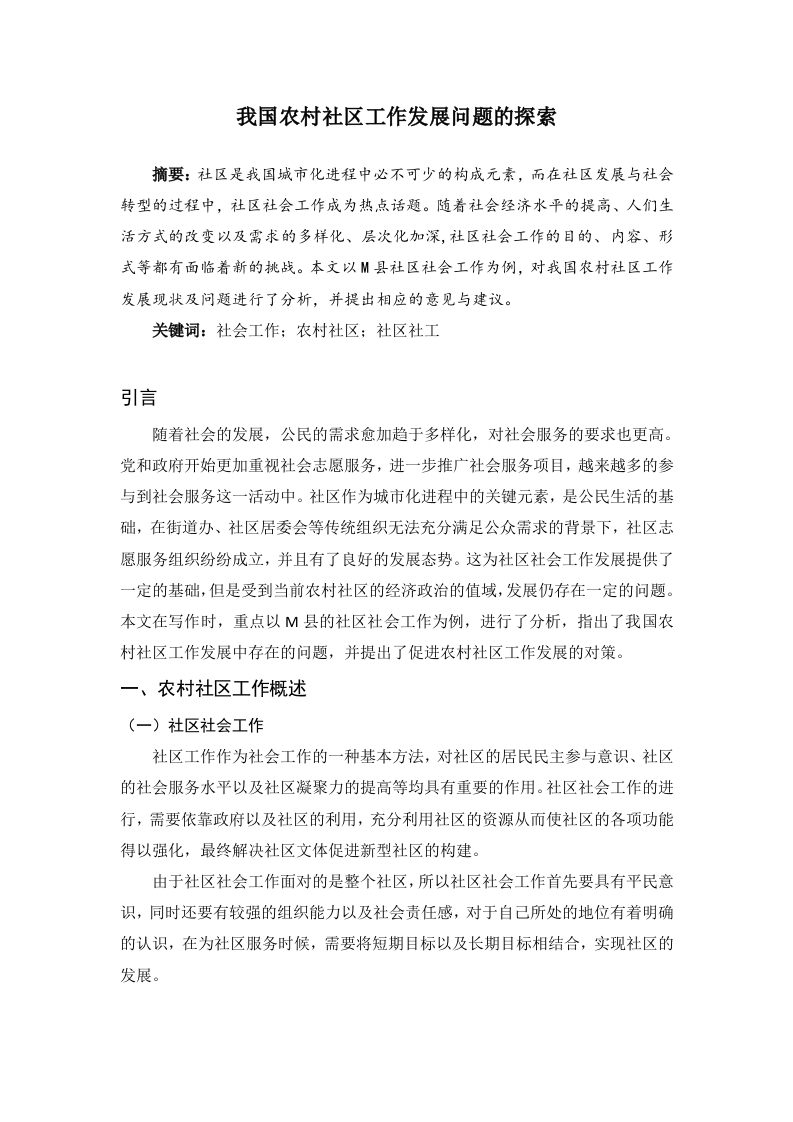 我国农村社区工作发展问题的探索摘要:社区是我国城市化进程中必不可少的构成元素,而在社区发展与社会转型的过程中,社区社会工作成为热点话题。随着社会经济水平的提高、人们生活方式的改变以及需求的多样化、层次化加深,社区社会工作的目的、内容、形式等都有面临着新的挑战。本文以M县社区社会工作为例,对我国农村社区工作发展现状及问题进行了分析,并提出相应的意见与建议。关键词:社会工作:农村社区:社区社工引言随着社会的发展,公民的需求愈加趋于多样化,对社会服务的要求也更高。党和政府开始更加重视社会志愿服务,进一步推广社会服务项目,越来越多的参与到社会服务这一活动中。社区作为城市化进程中的关键元素,是公民生活的基础,在街道办、社区居委会等传统组织无法充分满足公众需求的背景下,社区志愿服务组织纷纷成立,并且有了良好的发展态势。这为社区社会工作发展提供了一定的基础,但是受到当前农村社区的经济政治的值域,发展仍存在一定的问题。本文在写作时,重点以M县的社区社会工作为例,进行了分析,指出了我国农村社区工作发展中存在的问题,并提出了促进农村社区工作发展的对策。一、农村社区工作概述(一)社区社会工作社区工作作为社会工作的一种基本方法,对社区的居民民主参与意识、社区的社会服务水平以及社区凝聚力的提高等均具有重要的作用。社区社会工作的进行,需要依靠政府以及社区的利用,充分利用社区的资源从而使社区的各项功能得以强化,最终解决社区文体促进新型社区的构建。由于社区社会工作面对的是整个社区,所以社区社会工作首先要具有平民意识,同时还要有较强的组织能力以及社会责任感,对于自己所处的地位有着明确的认识,在为社区服务时候,需要将短期目标以及长期目标相结合,实现社区的发展。(二)开展农村社区工作的必要性社区社会工作是以社区为主要活动范围,社会工作者基于个人的责任感与奉献精神等,自发为他人提供帮助。包括物质上的、精神上的扶持的一种服务。农村社区工作作为与街道办、社区居委会服务同等重要的社区服务力量,为社区的安全、稳定、协调等作出这重要贡献,对和谐社区建设、缓解社区矛盾有着不可或缺的作用。当前我国农村“城市化”现象严重,加之当前多元文化的影响,农村社区中存在明显的结构性缺陷,如行政色彩过于浓厚造成的“单位化社区”等等,这些均需要开展农村社会工作。笔者通过查阅相关资料以及咨询M县不同民众,了解了当前农村情况,认为当前环境下,农村社区社会工作的构建是极为必要的。二、我国农村社区工作发展现状及问题(一)我国农村社区工作发展情况1.我国农村社区工作发展历程我国农村社区工作发展时间较短,但是总体也经历了初步推广、逐步常态化以及提升的过程。以M县为例,受到城镇化率以及经济水平等因素的影响,M县社会工作起步较晚,最早的启动是在2005年M县“学雷锋”活动举办之时在M镇N社区成立的“党员先锋志愿服务队”,该服务队共有17人,本着社会工作“助人自助”的理念在M县开展社会工作。该服务队工作内容主要是社区来访登记、为社区内老弱病残家庭的帮助。此后,类似的社区志愿组织纷纷成立,如青云社区便民服务队、社区志愿服务点等。逐渐的,M县政府开始加大了对社区志愿者服务活动的关注与支持,设立了“优秀社区志愿者”、“社区志愿者先队”等奖项进行鼓励。自2005年M县第一个社区志愿者组织成立以来,越来越多的人参与其中,但是这些人多不是专业的社工人才,虽然M县服务的项目内容、服务方式、组织管理模式等都随之完善。例如就工作方式来说,就有一对一扶助模式、一对多互助模式、站点集中模式等,社区工作模式在成熟的同时也开始固化,工作内容缺乏创新,资源分配出现不均衡问题等,社区社会工作遇到瓶颈期。在此情况下,M县社区志愿者服务组织开始结合社区服务实际情况,寻求转型升级新路径,例如将街道和社区居委会的“街居制”转为“社区制”,为社区志愿者组织进行社区服务提供了更大的自由度与更多的资源。然而没有专业社工的引导,M县的社区社会工作仍存在不少的问题。尤其是在新形势下,传统的社区工作方式已经难以满足人们越来越多元的需求,稳中求变已经成为趋势。2.我国农村社区工作发展现状当前我国农村社会工作发展水平仍然较低,虽然不少农村社区开始进行调整,但是受到社会经济的限制,仍然存在较多矛盾。例如M县自转型以来,社区工作的规范性与长效性有了一定的提升,同时服务的范围、内容得到了充实,服务效率得以提高。但是在社区的不断变化与发展之下,人们对社区的要求不断升高,另一方面,受制于M县城市化水平、公共设施完善程度以及传统社区管理模式等因素的影响,M县专业的社会工作人数不多,导致其在工作中常出现矛盾或者其他需要改进的部分。当然,也有一些发展较好的,例如M县L社区,该社区位于城乡接合部,经济发展整体水平并不高,全区共有1016户3175人,人口众多,矛盾协调难度大,但社区的相关志愿队很多,如围绕亲老敬老、关爱留守儿童、社区环境保护为中心的“邻里计划”,以及其他不定期的社区服务,甚至还定出了“社区服务月”,建立了相对成熟的社区机制。但是该社区的组织成员只有42