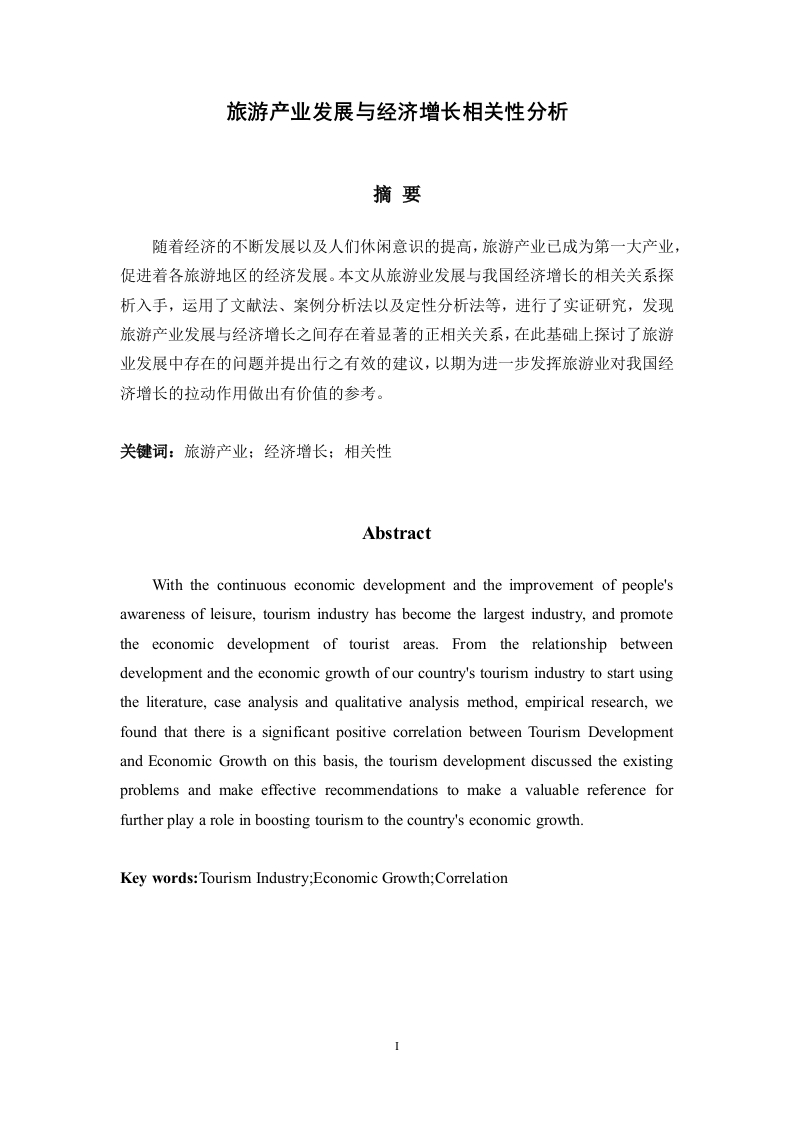 旅游产业发展与经济增长相关性分析摘要随着经济的不断发展以及人们休闲意识的提高,旅游产业已成为第一大产业,促进着各旅游地区的经济发展。本文从旅游业发展与我国经济增长的相关关系探析入手,运用了文献法、案例分析法以及定性分析法等,进行了实证研究,发现旅游产业发展与经济增长之间存在着显著的正相关关系,在此基础上探讨了旅游业发展中存在的问题并提出行之有效的建议,以期为进一步发挥旅游业对我国经济增长的拉动作用做出有价值的参考。关键词:旅游产业:经济增长;相关性AbstractWith the continuous economic development and the improvement of people'sawareness of leisure,tourism industry has become the largest industry,and promotethe economic development of tourist areas.From the relationship betweendevelopment and the economic growth of our country's tourism industry to start usingthe literature,case analysis and qualitative analysis method,empirical research,wefound that there is a significant positive correlation between Tourism Developmentand Economic Growth on this basis,the tourism development discussed the existingproblems and make effective recommendations to make a valuable reference forfurther play a role in boosting tourism to the country's economic growth.Key words:Tourism Industry;Economic Growth;Correlation1引言经济发展新态势下,转变经济发展方式,推动产业结构升级成为众人关注的焦点。现下,随着经济的不断发展以及人们休闲意识的提高,旅游产业已成为第一大产业,促进着各旅游地区的经济发展,我国“十三五”规划也体现着政府对旅游业的重视,旅游业依然处于巨大的机遇期。旅游业属于服务行业,它区别于化工、机械等生产制造重工产业,不会大量消耗资源,不会排放废气废水,并且还能可持续发展。此外还具备自身的一些特征优势,如投资少、获利多、见效快等,所以旅游业被称之为“无烟产业”,发展旅游业对当今社会的影响深远,本文从旅游业发展与我国经济增长的相关关系探析入手,进行了实证研究与问题及对策的提出,以期为进一步发挥旅游业对我国经济的拉动作用做出有价值的参考。本文的内容结构如下:在绪论部分对研究背景及意义做出描述,第二部分是国内外研究现状与研究假设的提出,第三部分为旅游产业和经济增长的相关性分析,第四部分以丽江旅游业为例,实证旅游产业发展对经济增长的作用,第五部分结合实证分析丽江旅游业发展对丽江的积极作用以及存在的问题,最后提出了行之有效的对策。本文采用的研究方法主要包括:文献法、举例论证法、定量分析与定性分析相结合的方法等,笔者在运用经济学相关理论进行分析的基础上,阐述当下旅游业对经济增长的作用,以及旅游业现在存在的问题并提出相关意见和建议。2问题的提出与假设随着社会的不断进步,经济的不断发展,人类文明逐步向前推进,旅游几乎逐渐走进了每一个人的生活中。同时人们可支配收入的增高使得其对旅游服务及产品的购买欲望与购买力不断增强。旅游的出现也经历了一个从无到有的历程,并且旅游一开始也只是上层人员和社会精英才能享受到的休闲活动。然而时至今日,旅游业己经形成了一个欣欣向荣的新兴产业,提高了人们的生活水平与生活质量,让人们享受到自然和人文风景所带来的休闲、舒适和娱乐感。旅游自从其产生与发展的开始人们就不断增加这对它的关注与研究。2.1文献综述与问题提出2.1.1民俗旅游与经济发展都培田学者根据体验营销的5E组合理论,提出旅游和体验营销结合,从而提高旅游体验,且注重到社会主义新农村的政策,打造”一镇一色、一村一景"和对非物质文化遗产的保护。王丽芳学者从现实存在的问题入手分析,认为应该从突出民俗文化的特色、深度挖掘乡村民俗文化蕴涵和保持其原生态可持续发展等三方面发展乡村民俗旅游。赵建昌学者认为乡村民俗旅游社区旅游者空间感知要素主要有"远景式"空间、日常生活空间、农事空间、"神的世界"空间和心理空间等。目前乡村民俗旅游发展存在的问题就是过度城市化和乡村特色的淡化,旅游者乡村民俗旅游体验较差。李玲学者认为民俗文化旅游应注重民俗文化保护基础上进行市场推广。否则容易造成民俗文化价值观的退化,同化现象越来越严重,民俗风情商业化氛围过浓,对民俗文化资源造成破坏。2.1.2旅游的大众化与经济开发旅游最初是属于上层社会才能享受到的,到20世纪旅游逐步大众化和普遍化。随着国民经济的发展,旅游逐渐对社会、经济和文化等产生了巨大的影响。旅游的存在有其经济根源,旅游的发展与经济学联系紧密。学者们对旅游的研究首先始于经济学相关理论。意大利学者Mariotti(1927)出版了《旅游经济讲义》(Lezionidi economiz)一书,第一次从经济学的角度对旅游现象。紧接着,专家学者从时间禀赋、工资率与财富收入的关系对旅游进行了深入的研究。人们在生活中是否选择旅游会根据工作和旅游的时间相对价值进行评判。如果旅游闲暇的时间价值低或工作时间报酬高,则会增加闲暇时间去进行旅游,反之,则会增加工作时间以获取更高的工作报酬。通过大量的静态研究表明,短期内根据工资率变化,可以得出对应于不同工资率的闲暇时间轨迹:长期看,闲暇曲线呈S型,存在所谓的经济学意义上的“闲暇悖论”:随着工资率的增加,工作时间有可能反而减少作了系统剖析和论证。2