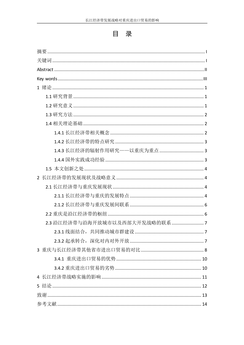 长江经济带发展战略对重庆进出口贸易的影响目录摘要关键词Abstract.Key words....1绪论1.1研究背景.…1.2研究意义…11.3研究方法21.4相关理论基础.…1.4.1长江经济带相关概念21.4.2长江经济带的特点研究.…1.4.3长江经济的辐射作用研究一一以重庆为重点…1.4.4国外实践成功经验.31.5本文创新之处…2长江经济带的发展现状及战略意义42.1长江经济带与重庆发展现状.42.1.1长江经济带与重庆的发展特点…42.1.2长江经济带与重庆发展间联系.62.2重庆是沿江经济带的枢纽…2.3沿江经济带与沿海开放城市以及西部大开发战略的联系2.3.1线面结合,共同推动城市群建设…72.3.2起承转合,深化对内对外开放3重庆与长江经济带其他省市进出口贸易的对比3.4.1重庆进出口贸易的优势3.4.2重庆进出口贸易的劣势.…4长江经济带战略实施的影响.1113.14摘要由于中国进入到了一个追求更高质量的中高速增长阶段,仅仅依靠沿海城市来拉动中国经济已经难以达到经济增长的目标,必须开辟新的经济带,2014年9月25日,我国出来了《长江经济带发展指导意见》,这是长江经济带建设正式上升为国家战略的标志,长江经济带在协调区域关系、缩小东中西地区的经济差距有着非常重要的意义。重庆自设立为直辖市以来,经济得到迅猛的发展,在我国将长江经济带的发展提高到国家战略以后,重庆的进出口贸易亦得到飞速发展,在未来区域社会经济发展中,长江经济带将扮演着重要角色,作为长江经济带枢纽的重庆,也将在其中发挥更为重要的作用。进出口贸易也称为世界贸易,反应着世界各国或地区在经济上的关系是相互依赖的,是各国或地区在国际分工的基础上互相联系的主要形式,进口贸易在经济增长、技术进步、产业结构优化等方面都有很大的作用,在一定范围内的贸易顺差,对贸易顺差地区的经济发展有促进作用。本文在绪论中将从沿江省市的发展以及重庆的枢纽位置和发展现状出发,引出沿江经济带战略,继而将沿江经济带与沿海开放城市和西部大开发战略相联系,分析出长江经济带的战略意义。本文以重庆为重点分析对象,从进出口贸易上来对重庆过去与现在的经济进行对比,接着使重庆与沿江经济带周边省市做对比,分析出在新的机遇下,重庆发展的优劣势。最后用互动机理理论来分析长江经济带对重庆发展的作用以及重庆队长江经济带发展的助益。最后笔者将对长江经济带的发展提出建议并进行展望,希望可以对研究沿江流域省市发展起到一定的借鉴。关键词:长江经济带进出口贸易经济发展AbstractSince China entered the high-speed pursuit of a higher quality growth phase,relying solely on coastal cities to boost the Chinese economy has been difficult toachieve economic growth targets,we must develop new economic belt,September 25,2014,our country out of the "Yangtze River economic development with guidance,"this is the Yangtze River economic belt construction officially marked increase in thenational strategy,the Yangtze River economic belt in coordinating regionalrelationship,to narrow the economic gap between the region's three regions has a veryimportant significance.Chongqing municipality since inception,has been the rapid economic developmentin China will enhance the development of the Yangtze River economic belt to thenational strategy after the import and export trade of Chongqing has developedrapidly in the future regional socio-economic development in the Yangtze Rivereconomic belt will play an important role as the hub of Chongqing Yangtze Rivereconomic belt,will also play a more important role.Import and export trade,also known as the world's trade,and the reaction of therelations among the countries or regions in the world economy are interdependent,countries or regions are the main form of international division of labor on the basisof mutual contact,import trade and economic growth,technological progress,optimization of industrial structure and other aspects have a significant role in a rangeof trade surplus,trade surplus with the economic development of the region canpromote.Based on the introduction of the departure from the provinces along the YangtzeRiver as well as the development of the location and status of development ofChongqing hub,leads along the Yangtze River Economic Belt strategy,then theeconomic belt along the Yangtze River and the coastal cities and the westerndevelopment strategy linked to analyze the Yangtze River economic belt strategicsignificance.This article focuses on an object in Chongqing,Chongqing from theimport and export trade up past and present economic comparison,then makeeconomic belt along the Yangtze River in Chongqing and neighboring provinces to docomparative analysis of the new opportunities,advantages and disadvantages of thedevelopment of Chongqing.Finally,the interaction mechanism theory to analyze thebeneficial effect on the development of Chongqing Yangtze River economic belt and
