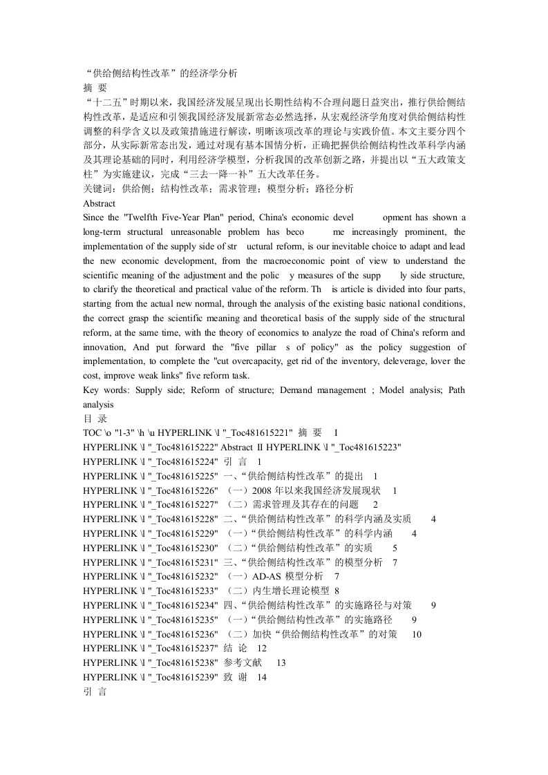 “供给侧结构性改革”的经济学分析摘要“十二五”时期以来,我国经济发展呈现出长期性结构不合理问题日益突出,推行供给侧结构性改革,是适应和引领我国经济发展新常态必然选择,从宏观经济学角度对供给侧结构性调整的科学含义以及政策措施进行解读,明晰该项改革的理论与实践价值。本文主要分四个部分,从实际新常态出发,通过对现有基本国情分析,正确把握供给侧结构性改革科学内涵及其理论基础的同时,利用经济学模型,分析我国的改革创新之路,并提出以“五大政策支柱”为实施建议,完成“三去一降一补”五大改革任务。关键词:供给侧:结构性改革:需求管理:模型分析:路径分析AbstractSince the "Twelfth Five-Year Plan"period,China's economic development has shown along-term structural unreasonable problem has beco me increasingly prominent,theimplementation of the supply side of str uctural reform,is our inevitable choice to adapt and leadthe new economic development,from the macroeconomic point of view to understand thescientific meaning of the adjustment and the polic y measures of the supp ly side structure,to clarify the theoretical and practical value of the reform.Th is article is divided into four parts,starting from the actual new nommal,through the analysis of the existing basic national conditions.the correct grasp the scientific meaning and theoretical basis of the supply side of the structuralreform,at the same time,with the theory of economics to analyze the road of China's reform andinnovation,And put forward the "five pillar s of policy"as the policy suggestion ofimplementation,to complete the "cut overcapacity,get rid of the inventory,deleverage,lover thecost,improve weak links"five reform task.Key words:Supply side;Reform of structure;Demand management Model analysis;Pathanalysis目录TOCo"1-3"h u HYPERLINK1"Toc481615221"摘要IHYPERLINK VI "_Toc481615222"Abstract II HYPERLINK VI"_Toc481615223"HYPERLINK1"Toc481615224"引言1HYPERLINK1"Toc481615225"一、“供给侧结构性改革”的提出1HYPERLINK1"Toc481615226"(一)2008年以来我国经济发展现状1HYPERLINK1"Toc481615227"(二)需求管理及其存在的问题2HYPERLINK1"Toc481615228"二、“供给侧结构性改革”的科学内涵及实质4HYPERLINK1"Toc481615229"(一)“供给侧结构性改革”的科学内涵4HYPERLINK1"Toc481615230"(二)“供给侧结构性改革”的实质5HYPERLINK1"Toc481615231"三、“供给侧结构性改革”的模型分析7HYPERLINK1"Toc481615232"(一)AD-AS模型分析7HYPERLINK1"Toc481615233"(二)内生增长理论模型8HYPERLINK1"Toc481615234"四、“供给侧结构性改革”的实施路径与对策9HYPERLINK1"Toc481615235"(一)“供给侧结构性改革”的实施路径9HYPERLINK1"Toc481615236"(二)加快“供给侧结构性改革”的对策10HYPERLINK1"Toc481615237"结论12HYPERLINK1"Toc481615238"参考文献13HYPERLINK1"Toc481615239"致谢14引言供给侧结构性改革是2015年11月10日中央财经领导小组第十一次会议上首次提出,并明确指出“供给侧改革”“在适度扩大总需求的同时(javascript::;),着力加强供给侧结构性改革,着力提高供给体系质量和效率,增强经济持续增长动力”(javascript:;[1]。此后,国家领导人在多种场合中提出,不断强调“供给侧改革”重要意义(javascript:;),要把这次改革做好做实。指出:“推进供给侧结构性改革,是我国处于新常态形式下的必然要求(javascript::;)。去年1月27日,中央财经领导小组第十二次会议上,进一步研究了供给侧结构性改革方案(javascript:;)。明确指出供给侧结构性改革的根本目的是提高社会生产力水平,满足人民的物质文化需求(javascript::;)。十三次会议上又明确了改革的重点、任务和具体方向。三次会议都是围绕供给侧结构性改革展开,因此,供给侧结构性改革的实施是我国经济政策方向和结构转型升级的关键,在适度扩大总需求的同时,去产能、去库存、去杠杆、降成本、补短板(javascript:;),这些改革都是全面的,具体的。本文试图从宏观经济理论出发,分析“供给侧结构性改革”的实施原理,以明晰“供给侧结构性改革”的科学内涵,进而提出加快改革的对策与建议,使其在理论上不断深化,在实践中不断前进。一、“供给侧结构性改革”的提出(一)2008年以来我国经济发展现状2008年金融危机以来,随着全球经济的缓慢复苏,我国经济开始从“旧常态”向“新常态”转型,心的矛盾又不断凸显。从现有的国情看,中国正处于三重压力下,企业面临的问题不断增多,例如企业成本居高不下、供求平衡不稳、资本的投资回报率下降等。突出表现为:1增长速度换挡期,下行压力大近年来,由于国际金融危机的影响,整个世界经济形势不容乐观,市场疲软,我国产品出口也出现形势低迷的局面。据统计,2015年,全国对外贸易总额为24.58万亿元,和2014年相比下降了7%(javascript:;).其中,出口14.14万亿元,同比下降1.8%:进口10.45万亿元,同比下降13.2%。2014年我国GDP增速下降到7.3%,2015年进一步下降到6.9%。在2016年政府工作报告中,“十三五”期间我国设定的GDP增速是6.5%。尽管增长速度逐年下降,但和很多其他国家相比,我国的经济增长速度仍处于前列。这对于我国全面迈入小康社会的决胜时期来说,经济下行的巨大压力(javascrip:;)是我们面临的巨大挑战。2结构调整阵痛期,产业升级不足改革开放30多年来,我国推行的经济运行摸式在现阶段出现了严重的结构性问题(javascript:;)。即旧的结构不适应现有的经济发展需求,导致部分产能过剩,新的结构没有及时形成,而原有的僵尸企业己经无法满足新的消费需求。(javascr