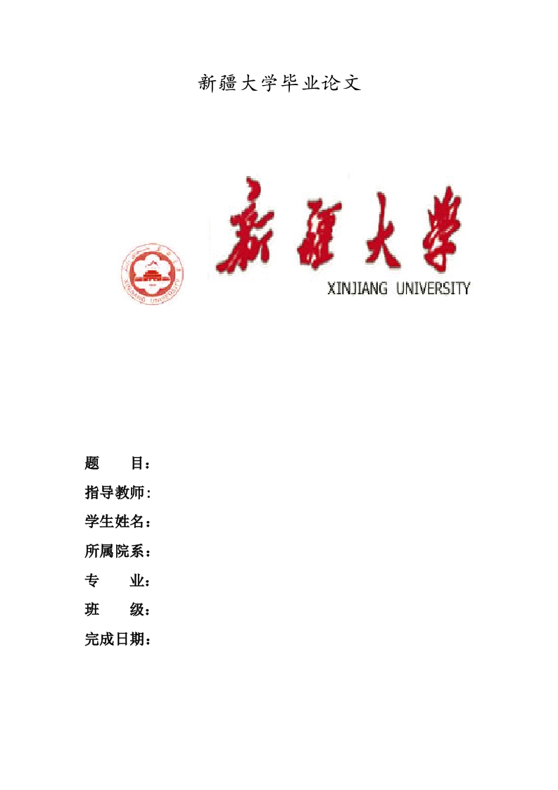 新疆大学毕业论文XINJIANG UNIVERSITY题目:指导教师:学生姓名:所属院系:专班级:完成日期:声明本人声明,所呈交的学位论文系本人在导师指导下独立完成的研究成果。文中依法引用他人的成果,均已做出明确标注或得到许可。论文内容未包含法律意义上已属于他人的任何形式的研究成果,也不包含本人已用于其他学位申请的论文或成果。本人如违反上述声明,愿意承担由此引发的一切责任和后果。论文作者签名:日期:年月日新疆大学毕业论文(设计)任务书班姓名:论文(设计)题目:要求完成的内容:发题日期:年月日完成日期:年月日实习实训单位:论文页数:图纸张数:指导教师:教研室主任:院