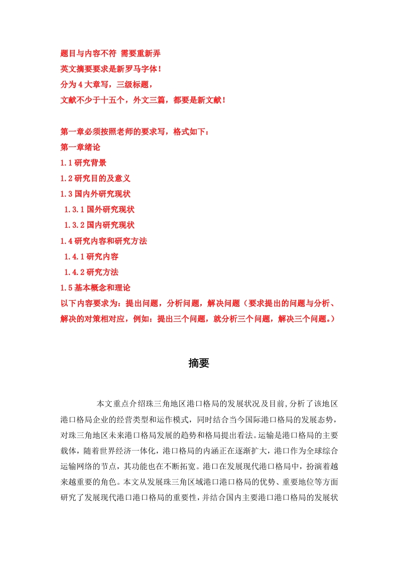 题目与内容不符需要重新弄英文摘要要求是新罗马字体!分为4大章写,三级标题,文献不少于十五个,外文三篇,都要是新文献!第一章必须按照老师的要求写,格式如下:第一章绪论1.1研究背景1.2研究目的及意义1.3国内外研究现状1.3.1国外研究现状1.3.2国内研究现状1.4研究内容和研究方法1.4.1研究内容1.4.2研究方法1.5基本概念和理论以下内容要求为:提出问题,分析问题,解决问题(要求提出的问题与分析、解决的对策相对应,例如:提出三个问题,就分析三个问题,解决三个问题。)摘要本文重点介绍珠三角地区港口格局的发展状况及目前,分析了该地区港口格局企业的经营类型和运作模式,同时结合当今国际港口格局的发展态势,对珠三角地区未来港口格局发展的趋势和格局提出看法。运输是港口格局的主要载体,随着世界经济一体化,港口格局的内涵正在逐渐扩大,港口作为全球综合运输网络的节点,其功能也在不断拓宽。港口在发展现代港口格局中,扮演着越来越重要的角色。本文从发展珠三角区域港口港口格局的优势、重要地位等方面研究了发展现代港口港口格局的重要性,并结合国内主要港口港口格局的发展状况论述了珠三角区域港口港口格局发展方面存在的主要问题。结合世界大港港口格局的发展研究了珠三角区域港口港口格局的发展趋势,对把握珠三角区域港口港口格局的发展起着重要的指导意义。随着世界经济和国际贸易的发展,海运量的增大,集装箱运输方式在各国国民经济发展中的地位和作用越来越突出,其中危险品的运量也在逐年增加。由于危险品本身的特殊性质以及集装箱特殊的包装运输形式,在集装箱运输危险品时,如何保障货物和周围环境的安全将成为运输过程中至关重要的一环。本文重点对港口陆域设施建设和有关集装箱堆场管理进行研究,以集装箱堆场为研究对象,结合港口的规划建设,对其管理体系,以及存在的风险有害因素进行了分析。同时针对存在的问题以及风险有害因素提出了具体的措施和建议,这对于提高集装箱后方堆场危险品库的运作效率,增加企业的经营收益,提升港口整体竞争力具有重要的现实意义。关键词:港口规划港口格局发展分析Abstractthis paper mainly introduces the development situation of logistics industry in thepearl river delta and the current logistics enterprises in the area of operation type andoperation mode,at the same time,combined with today's international pavilions flowindustry development situation,the development of logistics industry in the pearl riverdelta region in the future the trend and pattern of views are put forward Transportationis the main carrier of logistics,with the integration of the world economy,logisticsconcept is gradually expanding,the port as a global integrated transportation networknode,its functions are also constantly expanding.Port in the development of modernlogistics,plays a more and more important role.The importance of this study on maincarrier of logistics,with the integration of the world economy,logistics concept isgradually expanding,the port as a global integrated transportation network node,itsfunctions are also constantly expanding.Port in the development of modern logistics,plays a more and more important role.The importance of this study on thedevelopment of modern port logistics from the aspects of the development of Xiamenport logistics industry advantage,important status,development status and combinedwith the major domestic port logistics industry of the main problems in thedevelopment of Xiamen the development of modern port logistics from the aspects ofthe development of Xiamen port logistics industry advantage,important status,development status and combined with the major domestic port logistics industry ofthe main problems in the development of Xiamen port logistics.The developmenttrend of the research on Xiamen port logistics industry with the development of worldport logistics industry,plays an important guiding significance for the development ofthe Xiamen port logistics industry.Keywords:Port planning port configuration development analysis