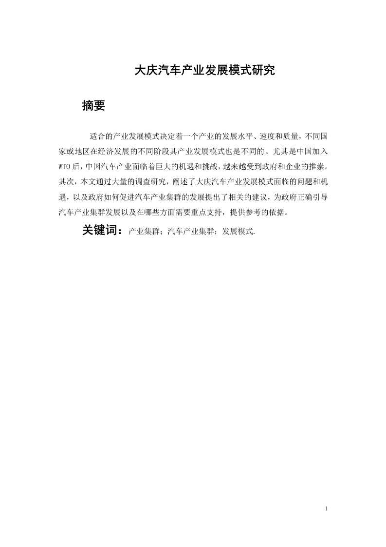 大庆汽车产业发展模式研究摘要适合的产业发展模式决定着一个产业的发展水平、速度和质量,不同国家或地区在经济发展的不同阶段其产业发展模式也是不同的。尤其是中国加入WT0后,中国汽车产业面临着巨大的机遇和挑战,越来越受到政府和企业的推崇。其次,本文通过大量的调查研究,阐述了大庆汽车产业发展模式面临的问题和机遇,以及政府如何促进汽车产业集群的发展提出了相关的建议,为政府正确引导汽车产业集群发展以及在哪些方面需要重点支持,提供参考的依据。关键词:产业集群:汽车产业集群;发展模式AbstractSuitable for industrial development model determines the level of developmentof an industry the speed and quality of different countries at different stages ofeconomic development of its industrial development model is different.Especiallyafter China's accession to WTO,China's auto industry is facing great opportunitiesand challenges,along with full access to foreign auto giants China's marketuncertainty increased significantly,operational risks faced by the automotive industryhas gone beyond the capacity of individual enterprises.Thus,a form of organizationbetween enterprises and between markets -automotive industry cluster morerespected by the government and enterprises.Secondly,through a lot of research toexplain the advantages of the development of the automobile industry in Daqing,weaknesses,opportunities and threats,on this basis,the proposed auto industrydevelopment model should adopt the。American model。and the。Spanish model。government-led combination,to the advantage of leading enterprises as the core,shaft wheel development according to Michael Porter's theory of competitiveadvantage,found that the industrial development path by analyzing differentperspectives and input-output method using relevant indicators sensitivitycoefficient to analyze its industry ripple effect,influence coefficient.Finally,theproblems and opportunities facing the development model for and the Government onhow to put forward relevant proposals for the government to correctly guide theautomobile industry cluster development and the need to focus on what support toprovide reference basis.Keywords industrial clusters automobile industry clusterdevelopment model.目录31.1论文研究意义及目的...1.2国内外研究现状...1.2.1国外研究现状..1.2.2国内研究现状62.1战略管理相关理论.·2.3产业集群理论...72.3.1外部经济性....2.3.3制度效应.…92.4价值链理论3、大庆汽车产业外部环境分析.·3.1全球汽车产业发展现状及趋势1111153.2.3中国汽车产业与全球汽车产业链...16174.1大庆汽车产业发展概况....171741.2大庆汽车零部件企业…18