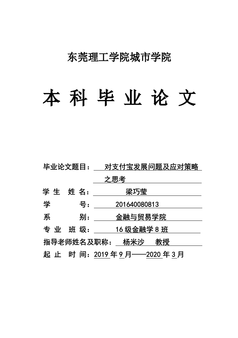 东莞理工学院城市学院本科毕业论文毕业论文题目:对支付宝发展问题及应对策略之思考学生姓名:梁巧莹学号:201640080813系别:金融与贸易学院专业班级:16级金融学8班指导老师姓名及职称:杨米沙教授起止时间:2019年9月—2020年3月摘要支付宝是国内的第三方支付平台。随着支付宝自身的发展以及其他第三方支付平台的崛起,支付宝自身的缺陷逐渐显现出来。近年来,国内外学者围绕支付宝发展问题及应对策略的研究成果甚丰,但是随着近年来其他支付平台的崛起以及支付宝自身缺陷的显露,特别是从支付宝内部及外部多角度看待支付宝发展问题更值得研究与分析。本文集中阐述了支付宝的发展现状,围绕支付宝发展现状做了相应的分析,从现状出发剖析了支付宝发展特点,讨论了支付宝发展存在的问题,就相关问题提出了应对策略。全文分3个部分:第一部分是通过数据以及图表讲述支付宝发展概况,从支付宝用户规模及发展程度、自身拓展能力、发展环境等方面描述支付宝的发展概况。第二部分提出支付宝发展现面临的问题,用户规模、金融产品多样,深入产业体系中全面发展,但造成网络安全问题、支付宝市场空间受到制约、社会诚信体系不健全,面对此等问题,我们理应正视并改善。第三部分是论文重点内容,针对第二部分分析得出的问题提出解决策略。首先应该降低网络风险,确保用户安全。支付宝要将与银行的竞争关系转化为合作关系,并进行综合整理,得出全面的观点。最后在保障网络安全基本的前提下,然后建立高效社会信用体系,使社会信用体系得到完善。关键词:支付宝发展策略可持续发展ABSTRACTAlipay is the third party payment platform in China.With the development ofAlipay and the rise of other third party payment platforms,Alipay's own flaws aregradually emerging.In recent years,domestic and foreign scholars have focused onAlipay's development issues and coping strategies.However,with the rise of otherpayment platforms in recent years and the emergence of Alipay's flaws,especiallyfrom Alipay's internal and external perspectives,it is worth studying and analyzingAlipay's development.This article concentrates on the current development of Alipay,analyzes thedevelopment status of Alipay,analyzes the characteristics of Alipay developmentfrom the current situation,discusses the problems existing in Alipay development,andputs forward countermeasures for related problems.This paper is a thematic analysis using XX method.The full text is divided into 3parts:the first part is about the development of Alipay through data and charts,anddescribes the development of Alipay from the aspects of Alipay user scale anddevelopment level,its own expanding capabilities and development environment.Thesecond part puts forward the problems faced by Alipay's development,such as thesize of users,the diversity of financial products,and the comprehensive developmentin the industrial system.However,we should face up to and improve the problems ofnetwork security,the restriction of Alipay market space and the imperfect social creditsystem.The third part is the key content of the paper,aiming at the problems in thesecond part,the paper puts forward solutions.First of all,we should reduce thenetwork risk and ensure the safety of users.Alipay should transform its competitiverelationship with banks into cooperative relations and make a comprehensivearrangement to get a comprehensive view.Finally,on the premise of ensuring thebasic network security,we should establish an efficient social credit system toimprove the social credit system..Key words:AlipayDevelopment strategySustainable development