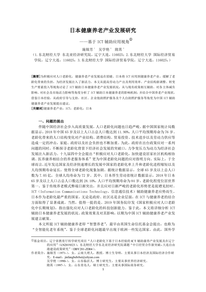 日本健康养老产业发展研究基于ICT辅助应用视角@(1.东北财经大学东北亚经济研究院,辽宁大连,116025:2.东北财经大学国际经济贸易学院,辽宁大连,116025:3.东北财经大学国际经济贸易学院,辽宁大连,116025:)[摘要]为积极应对人口老龄化,健康养老产业发展迫在眉睫。日本将ICT应用到健康养老产业,缓解了老龄化带来的负担,为经济发展注入了新活力。本文从提高劳动力产出及利用效率、产业结构新调整、转变生产要素投入等视角讨论了ICT辅助日本健康养老产业发展状况:从与现有政策相互辅助、对各主体减负影响、对社会及市场活力影响等角度分析了ICT辅助日本健康养老的影响机制:并结合中国养老产业现状,借鉴日本经验,从政府引导与支持,社区、企业他助照护服务及个人自助照护服务等角度为中国ICT辅助健康养老产业发展提出建议。[关键词]健康养老产业:ICT:老龄化:日本一、问题的提出伴随中国经济社会步入高质量发展,人口老龄化问题也日趋严峻。据中国国家统计局数据显示,2018年中国65岁及以上人口占总人口数达到11.90%,人口平均预期寿命为76岁。老龄化带来的人口结构变化对产业结构、消费结构、贸易投资、技术进步以及劳动力供应等造成一定的冲击,家庭、政府以及社会负担也不断加重。为此,政府在出台政策应对一系列问题的同时,不新探寻老龄化背景下经济社会发展的突破口,力争变压力为动力为经济社会发展注入新活力。十九届四中全会提出“积极应对人口老龄化,加快建设居家社区机构相协调、医养康养相结合的养老服务体系”更为中国老龄化问题的应对指明方向。实际上,于全球而言,近年发达国家及经济快速增长的发展中国家的老龄化率上升和老龄化进程缩短以及人均预期寿命延长,使得全球老龄化现象加剧。据统计数据显示,全球65岁及以上总人口数为7.05亿,全球人均寿命为72岁。其中,日本厚生劳动省统计数据显示,2018年日本65岁及以上人口占总人口数达到28.10%,人口平均预期寿命为84岁,老龄化程度位居世界第一。鉴于传统养老模式弊端日渐突出,并且应对日渐严峻的老龄化形势更是捉襟见肘时。ICT(Information Communications Technology,信息通信技术)辅助健康养老应势而生。日本作为老龄化最严重的国家,无论是政府、社区还是企业层面,在ICT与健康养老的结合方面取得了显著成就。当然,值得一提的是。2019年国务院印发《国家积极应对人口老龄化中长期规划》,指出强化应对人口老龄化的科技创新能力。鉴于此,本文将详细分析ICT辅助日本健康养老发展的状况、政策效果及对其影响,以期为中国ICT辅助健康养老产业发展建言献策。本文所提ICT辅助健康养老即“智慧养老”,最早由英国生命信托基金会提出,也称为“全智能化老年系统”。鉴于全球老龄化问题最早出现于欧洲一些发达国家。由此,国外学①基金项目:辽宁省教育厅科学研究项目“人口老龄化下基于日本经验的1CT辅助康养产业发展及在辽宁的应用”(L2019J23):东北财经大学东北亚经济研究院课题“中日经贸合作新突破-大连自由港建设政策研究”(DBY201-ZD04)。作者简介:施锦芳(1971-),女,云南大理人,教授,博士生导师,主要从事日本经济及国际经济合作研吴学艳〔1990-),女,山东临沂人,博士研究生,主要从事世界经济研究。隋霄(1997-),女,山东青岛人,硕士研究生,主要从事国际商务研究。1者率先开展对智慧养老的探索。Godfrey“研究老年人的信息化需求和使用状况,Chae指出居家养老者倾向于远程医疗。相较而言,Courtney研究认为老年人逐渐倾向于护理社区。此外,Eastman指出互联网使用符合当前老年人需求。在社会需求为智慧养老打好基础的同时,经济活动也成为智慧养老推行的动因,Acemoglu和Restrepo基于实证模型指出,机器人的使用可以减轻老龄化对生产活动的冲击。Brynjolfsson则认为人工智能将有助于全要素生产率的提升,减轻老龄化对经济增长的不利影响。在此基础上,智慧养老未来发展显得尤为必要,Lemlouma提出依赖型智慧养老服务体系框架。Melvin Delgado建设智慧社区应加强社区与外界互动能力的建设。国内关于智慧养老的研究起步较晚,并且早期主要关注概念和内涵。左美云指出“智慧养老”强调“人”,孙梦楚则总结指出国内相关概念始于“数字化养老”,经历了“数字化养老”、“信息化养老”、“科技养老”、“网络化养老”、“智能养老”以及“智慧养老”的动态发展变化过程。当然,智慧养老在中国的起步与发展也是经济发展的必然要求。一方面是因为老龄化问题对经济的负面冲击较大,汪伟研究指出,当今中国人口老龄化己经对家庭储蓄、人力资本投资与经济增长产生负面影响。卓乘风和邓峰借助实证模型分析发现,人口老龄化阻碍了产业结构升级。另一方面是因为智慧养老可以减轻老龄化对于经济的不利影响,并且通过老龄化产业来创造新的经济增长点。张振平指出智慧养老将是养老领域的革命,也将是经济增长的新动力。陈彦斌等研究认为,人工智能能够提高资本回报率从而促进资本积累,在提高全要素生产率的基础上促进经济增长。由此,众多学者主张发挥政府引导作用。黄剑锋和章晓懿提出应该明确政府与市场角色,增加政策工具供给,发挥政策影响力。与此同时,国内学者主张构建出新的智慧养老服务系统。廖楚晖提出全局性协同的智慧养老服务