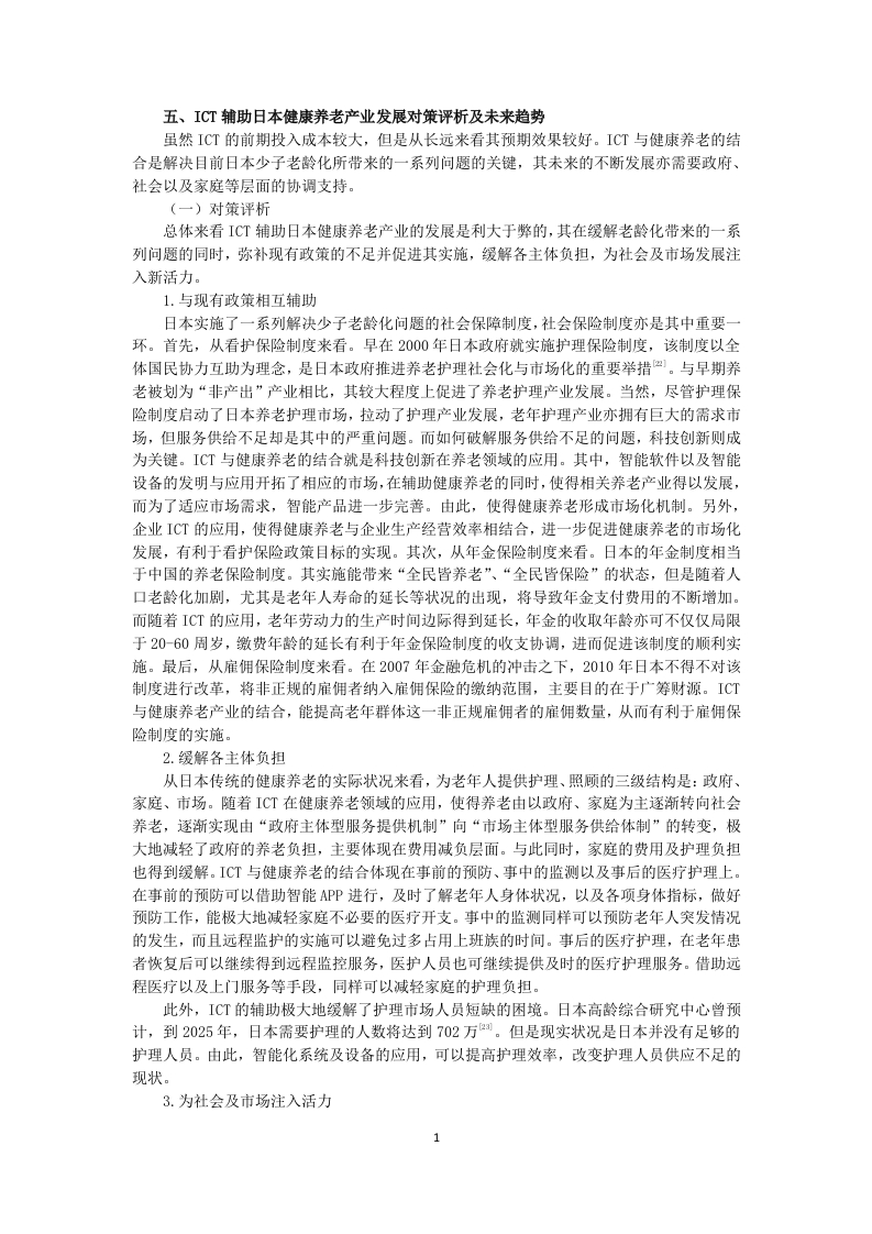 五、ICT轴助日本健康养老产业发展对策评析及未来趋势虽然ICT的前期投入成本较大,但是从长远来看其预期效果较好。ICT与健康养老的结合是解决目前日本少子老龄化所带来的一系列问题的关键,其未来的不断发展亦需要政府、社会以及家庭等层面的协调支持。(一)对策评析总体来看ICT辅助日本健康养老产业的发展是利大于弊的,其在缓解老龄化带来的一系列问题的同时,弥补现有政策的不足并促进其实施,缓解各主体负担,为社会及市场发展注入新活力。1.与现有政策相互辅助日本实施了一系列解决少子老龄化问题的社会保障制度,社会保险制度亦是其中重要一环。首先,从看护保险制度来看。早在2000年日本政府就实施护理保险制度,该制度以全体国民协力互助为理念,是日本政府推进养老护理社会化与市场化的重要举措四。与早期养老被划为“非产出”产业相比,其较大程度上促进了养老护理产业发展。当然,尽管护理保险制度启动了日本养老护理市场,拉动了护理产业发展,老年护理产业亦拥有巨大的需求市场,但服务供给不足却是其中的严重问题。而如何破解服务供给不足的问题,科技创新则成为关键。ICT与健康养老的结合就是科技创新在养老领域的应用。其中,智能软件以及智能设备的发明与应用开拓了相应的市场,在辅助健康养老的同时,使得相关养老产业得以发展,而为了适应市场需求,智能产品进一步完善。由此,使得健康养老形成市场化机制。另外,企业ICT的应用,使得健康养老与企业生产经营效率相结合,进一步促进健康养老的市场化发展,有利于看护保险政策目标的实现。其次,从年金保险制度来看。日本的年金制度相当于中国的养老保险制度。其实施能带来“全民皆养老”、“全民皆保险”的状态,但是随着人口老龄化加剧,尤其是老年人寿命的延长等状况的出现,将导致年金支付费用的不断增加。而随着ICT的应用,老年劳动力的生产时间边际得到延长,年金的收取年龄亦可不仅仅局限于20-60周岁,缴费年龄的延长有利于年金保险制度的收支协调,进而促进该制度的顺利实施。最后,从雇佣保险制度来看。在2007年金融危机的冲击之下,2010年日本不得不对该制度进行改革,将非正规的雇佣者纳入雇佣保险的缴纳范围,主要目的在于广筹财源。ICT与健康养老产业的结合,能提高老年群体这一非正规雇佣者的雇佣数量,从而有利于雇佣保险制度的实施。2.缓解各主体负担从日本传统的健康养老的实际状况来看,为老年人提供护理、照顾的三级结构是:政府、家庭、市场。随着ICT在健康养老领域的应用,使得养老由以政府、家庭为主逐渐转向社会养老,逐渐实现由“政府主体型服务提供机制”向“市场主体型服务供给体制”的转变,极大地减轻了政府的养老负担,主要体现在费用减负层面。与此同时,家庭的费用及护理负担也得到缓解。ICT与健康养老的结合体现在事前的预防、事中的监测以及事后的医疗护理上。在事前的预防可以借助智能APP进行,及时了解老年人身体状况,以及各项身体指标,做好预防工作,能极大地减轻家庭不必要的医疗开支。事中的监测同样可以预防老年人突发情况的发生,而且远程监护的实施可以避免过多占用上班族的时间。事后的医疗护理,在老年患者恢复后可以继续得到远程监控服务,医护人员也可继续提供及时的医疗护理服务。借助远程医疗以及上门服务等手段,同样可以减轻家庭的护理负担。此外,ICT的辅助极大地缓解了护理市场人员短缺的困境。日本高龄综合研究中心曾预计,到2025年,日本需要护理的人数将达到702万。但是现实状况是日本并没有足够的护理人员。由此,智能化系统及设备的应用,可以提高护理效率,改变护理人员供应不足的现状。3.为社会及市场注入活力2018年,日本老龄人口比例已达人▣总数的28.10%,据相关数据预测2030年将达到31.20%。若是大量老年人单纯地接受社会的养老,较少地从事经济活动,从短期来看,会加重各方养老负担。从长期来看,整个社会以及市场的活力将丧失。ICT辅助健康养老可以带动社会及市场的活力。ICT社区的建立,使社区活动多样化,跨区域的活动也会不断开展。社区内部以及跨区域的系统联动作用,会提高整个社会的活力。与此同时,老年人可以利用[CT扩大自己的活动领域,特别是在社交网络上,运用老年人所积累的知识和经验与年轻人进行交流,对于推进地区化等社会参与具有重要意义。另外,ICT辅助老年人进行再就业,会获得一定的收入,收入的增长会影响整个市场的消费能力,进而使整个市场的活力增强。否则,老年人的消费结构仅仅局限于水、电、煤气等领域,造成整个市场消费的乏力,从而极大地降低市场活力。ICT辅助健康养老在提供再就业的同时,进行产业结构的延展。产业结构的新气象可为整个市场经济的发展注入新活力。综上,ICT辅助日本健康养老产业发展在促进现有养老政策实施、减轻各方负担、为市场发展注入活力的同时,也为日本经济发展带来新的经济增长点,该经济增长点与日本现实情况相结合,顺应日本社会及经济发展的需求。(二)未来趋势目前日本ICT辅助健康养老己经取得一定的成果,并且成效显著。但是从宏观层面来看,其当前发展仅仅是处于“点、线”结合的状态,主要表现为智能软件以及智能设备的应用,而系统性的ICT辅助仅仅在一些试点地区开展