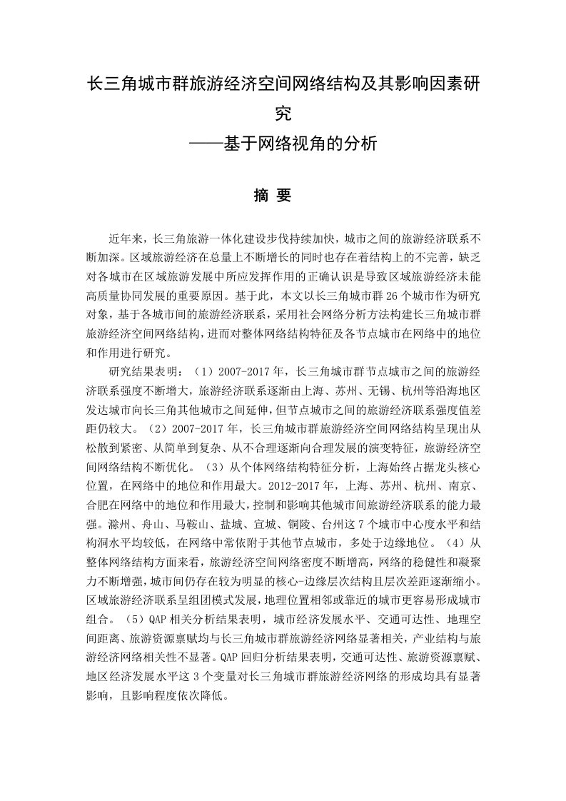 长三角城市群旅游经济空间网络结构及其影响因素研究基于网络视角的分析摘要近年来,长三角旅游一体化建设步伐持续加快,城市之间的旅游经济联系不断加深。区域旅游经济在总量上不断增长的同时也存在着结构上的不完善,缺乏对各城市在区域旅游发展中所应发挥作用的正确认识是导致区域旅游经济未能高质量协同发展的重要原因。基于此,本文以长三角城市群26个城市作为研究对象,基于各城市间的旅游经济联系,采用社会网络分析方法构建长三角城市群旅游经济空间网络结构,进而对整体网络结构特征及各节点城市在网络中的地位和作用进行研究。研究结果表明:(1)2007-2017年,长三角城市群节点城市之间的旅游经济联系强度不断增大,旅游经济联系逐渐由上海、苏州、无锡、杭州等沿海地区发达城市向长三角其他城市之间延伸,但节点城市之间的旅游经济联系强度值差距仍较大。(2)2007-2017年,长三角城市群旅游经济空间网络结构呈现出从松散到紧密、从简单到复杂、从不合理逐渐向合理发展的演变特征,旅游经济空间网络结构不断优化。(3)从个体网络结构特征分析,上海始终占据龙头核心位置,在网络中的地位和作用最大。2012-2017年,上海、苏州、杭州、南京、合肥在网络中的地位和作用最大,控制和影响其他城市间旅游经济联系的能力最强。滁州、舟山、马鞍山、盐城、宣城、铜陵、台州这7个城市中心度水平和结构洞水平均较低,在网络中常依附于其他节点城市,多处于边缘地位。(4)从整体网络结构方面来看,旅游经济空间网络密度不断增高,网络的稳健性和凝聚力不断增强,城市间仍存在较为明显的核心-边缘层次结构且层次差距逐渐缩小。区域旅游经济联系呈组团模式发展,地理位置相邻或靠近的城市更容易形成城市组合。(5)QP相关分析结果表明,城市经济发展水平、交通可达性、地理空间距离、旅游资源禀赋均与长三角城市群旅游经济网络显著相关,产业结构与旅游经济网络相关性不显著。QP回归分析结果表明,交通可达性、旅游资源禀赋、地区经济发展水平这3个变量对长三角城市群旅游经济网络的形成均具有显著影响,且影响程度依次降低。关键词:旅游经济网络结构:社会网络分析:长三角城市群AbstractIn recent years,the pace of Yangtze river delta tourism integration continues toaccelerate,and the tourism economic ties between cities continue to deepen.While theregional tourism economy keeps growing in total volume,there are also structuralimperfections,and the lack of proper understanding of the role of each city in thedevelopment of regional tourism is an important reason for the failure of regionaltourism economy to develop in a coordinated way with high quality.Based on this,this paper takes 26 cities in the Yangtze river delta city cluster as the researchobject.,and based on the tourism economic connections among cities,this paper adoptsthe social network analysis method to construct the spatial network structure oftourism economy in the Yangtze river delta city clusters,and then studies thecharacteristics of the overall network structure and the status and role of each nodecity in the network.The results show that:(1)From 2007 to 2017,the intensity of tourism economiclinks between the node cities in the Yangtze river delta city clusters has beenincreasing,and the tourism economic links have gradually extended from thedeveloped cities in the coastal areas such as Shanghai,suzhou,wuxi and hangzhou toother cities in the Yangtze river delta.However,there is still a large gap in theintensity of tourism economic links between the node cities.(2)From 2007 to 2017,the spatial network structure of tourism economy in the Yangtze river delta cityclusters showed the characteristics of evolution from loose to close,from simple tocomplex,and from unreasonable to reasonable,and the spatial network structure oftourism economy was constantly optimized.(3)From the analysis of individualnetwork structure characteristics,Shanghai has always occupied the leading coreposition and played the largest role in the network.From 2012 to 2017,Shanghai,suzhou,hangzhou,nanjing and hefei played the largest role in the network and hadthe strongest ability to control and influence the tourism economic links among othercities.Chuzhou,zhoushan,ma On Shan,yancheng,xuancheng,tongling and taizhouare all at a low level of centrality and structure holes.They are often attached to othernode cities in the network and are mostly in a marginal position.(4)From the overallnetwork structure,the spatial network density of tourism economy is continuouslyincreasing,the robustness and cohesion of the network are constantly enhanced,andthere is still a relatively obvious core-edge hierarchy among cities and the hierarchygap is gradually narrowing.The regional tourism economic relation develops in theform of group,and the cities near or adjacent to each other are more likely to form acity combination.(5)The results of QAP correlation analysis show that the level ofurban economic development,traffic accessibility,geographic spatial distance andtourism resource endowment are significantly correlated with the tourism economicnetwork of the Yangtze river delta city clusters,while the industrial structure is notsignificantly correlated with the tourism economic network.The results of QAPregression analysis show that three variables,namely traffic accessibility,tourismresource endowment and regional economic development level,all have significantinfluence on the formation of tourism economic network in Yangtze river delta cityclusters,and the influence degree decreases in turn.Key Words:Tourism economic network structure ;Social network analysis;TheYangt
