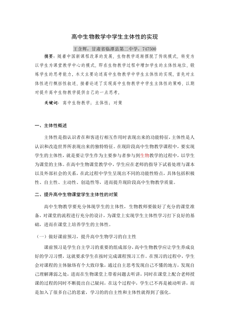 高中生物教学中学生主体性的实现王含辉,甘肃省临潭县第二中学,747500摘要:随着中国新课程改革的发展,生物教学逐渐摆脱了传统模式,转变为以学生为课堂教学中心的模式,即在生物教学过程中增加学生的主体性地位,锻炼学生的思考能力。本文主要论述高中生物教学中学生主体性的实现,首先对主体性进行概括性叙述,接着论述了实现高中生物教学中学生主体性的策略,以期对提升高中生物教学提供自己的一点思考。关健词:高中生物教学;主体性;对策一、主体性概述主体性是指认识者在和客进行相互作用时表现出来的功能特征,主体性是人认识和改造世界所表现出来的独特特征。在现阶段高中生物教学课程中,要实现学生的主体性,就是要让学生作为主要参与者参与到生物教学的过程中,以学生为课堂的主体。在高中生物课堂教学中,学生应在老师的指导下试着处理与课本以及外部社会的关系,在此过程中学生呈现出不同的功能性特点,具体包括积极性、自主性、主动性、创造性等,进而提升现阶段高中生物教学质量。二、提升高中生物课堂学生主体性的对策高中生物教学要充分体现学生的主体性,生物教师要做好了充分的课堂准备,对课堂的流程进行充分的设计,为课堂上实现学生主体性学习打下良好的基础,进而在课堂上培养学生的主体性。(一)做好课前预习,提升高中生物学习的自主性课前预习是学生自主学习的重要的组成部分,高中生物教学应让学生养成良好的学习习惯,这就要求学生在按时完成课程预习工作。在预习的过程中,学生会对课程的主体脉络有个大致印象,通过自主思考发现自己不懂的地方,发现自己理解薄弱之处,进而在生物课堂上带着问题去听讲,同时在课堂上配合老师授课的过程的同时不断提出自己疑问,在这个过程中,学生已不再是被动听讲,而是加入了很多自己的思索,学习的的自主性和主体性就得到了强化。(二)利用角色扮演,提升高中生物学习的主动性近年来角色扮演成为一种常用的教学方法,是指培养学生自己发现问题,然后在扮演的过程中解决问题,这也是一种很好的生物教学方法。在上课的过程中,教师可以让学生来当“老师”,安排学生来扮演自己的角色,一方面充分调动他们思维的创新性,让学生在感情方面增强了自己的责任感,通过换位思考提升学生的主动性,让学生对知识的理解更加深刻。例如,学习染色体的时候,可以让学生自己先思考一下从哪里入手进行授课,染色体的作用和重要性,怎样解释不同染色体之间的关系等,回答问题的也是学生,讲台上授课的是学生,学生的主体作用就会得到鲜明的表现。另一方面,增强了课堂的魅力和吸引力,也将会鼓励其他的学生来参与其中,当然,仍然要强调这种角色扮演不意味着生物教师对学生撒手不管,教师仍然要提供建设性的意见。主要包括对学生给予感情激励和客观的评价。以完善了学生的知识结构,提升学习生物学的主动性,提升高中生物课堂的效率。(三)利用分组讨论和课堂实验,提升高中生物学习的有效性高中生物实验教学长期以来是中学教学中的一个薄弱环节,但是在整个生物教学中具有非常重要的地位,对提升高中生物学习的积极性也有较大作用。当前生物课程的实验方法仍主要实行验证性实验,学生往往是被动接受,完全没有发挥学生自己的主体性功能,探索性实验在实际教学中还是很少使用,不利于学生的主动参与,而且,当前的高中生物实验教学对过程关注不够,更加侧重于对结果关注,分组讨论与课堂实验相结合的方法能改进当前的现状,教师可以首先让学生自由分组讨论问题的解决方案,让大家可以畅所欲言,调动每个人的主观能动性,创新思想也可以在激烈讨论中得以进发,再次基础上,让小组自行设计操作方式和实验步骡,让学生感到生物课中主人公的感觉,学生的生物实验自主性也就得到了发挥。(四)利用课后兴趣小组,培养高中生物学习的创造性教师应该可以让学生自由选择团队成员和根据学生的不同特点组成团队,鼓励学生开展课外生物活动小组的建立,利用课后兴趣小组培养高中生物学习的创造性。这样做有很多好处,一方面能发展每个人的特长,培养学生的兴趣,对不同的课堂内容和生物实验进行进一步积极的探究,不断提升学生的学习能力和动手能力,但是这个过程中教师的指导和帮助也是必不可少的,教师可以指导学生开辟实验基地,组建动物养殖和植物栽培小组,让学生动手设计实验,另一方面生物兴趣小组的建立会培养自学能力,极大地夯实学生的基础知识,提升了学生学习生物的主体性,促进知识基础较好的学生的进一步学习,为未来国家培养生物方面的高尖端人才打下基础。三、结论在经济持续发展和教育改革大背景下,高中生物应该尽快转变教学方式,摆脱过去僵化的教学方法,培养学生的主体性,通过培养学生的动手能力、实践能力和学习兴趣,丰富高中生物课堂的教学方法,实现学生在生物课堂教学中的主体作用,从而提升高中生物教学水平。参考文献[1]毕华林,姬广敏.高中生化学方程式认知结构发展水平的测查研究[)化学教育.2011(02)[2]陆珺,喻平.对我国生物认知结构研究的反思)数学教育学报.2010(02)[3]阁光才.关于教育评价及其风险).教育科学研究.2010(04)[4)孙继成.论高中生物学习不良者的外显行为及其认知结枸问题诊断与教学策略的