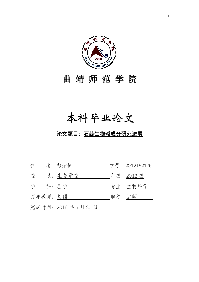 2000曲靖师范学院本科毕业论文论文题目:石蒜生物碱成分研究进展作者:徐荣恒学号:2012162136院系:生食学院年级:2012级学科:理学专业:生物科学指导教师:胡疆职称:讲师完成时间:2016年5月20日曲靖师范学院本论文(设计)经答辩小组全体成员审查,确认符合曲靖师范学院本科(学士学位)毕业论文(设计)质量要求。答辩小组签名主姓名工作单位职称席成员答辩日期:原创性声明本人声明:所呈交的论文(设计)是本人在指导教师指导下进行的研究工作成果。除了文中特别加以标注和致谢的地方外,论文(设计)中不包含其他人己发表或撰写过的研究成果。参与同一工作的其他同志对本研究所作的任何贡献己在论文(设计)中作了明确的说明并表示了谢意。签名:日期:论文(设计)使用授权说明本论文(设计)作者完全了解曲靖师范学院有关保留、使用毕业(学位)论文(设计)的规定,即学校有权保留论文(设计)及送交论文(设计)复印件,允许论文(设计)被查阅和借阅:学校可以公布论文(设计)的全部或部分内容。签名:指导教师签名:日期: