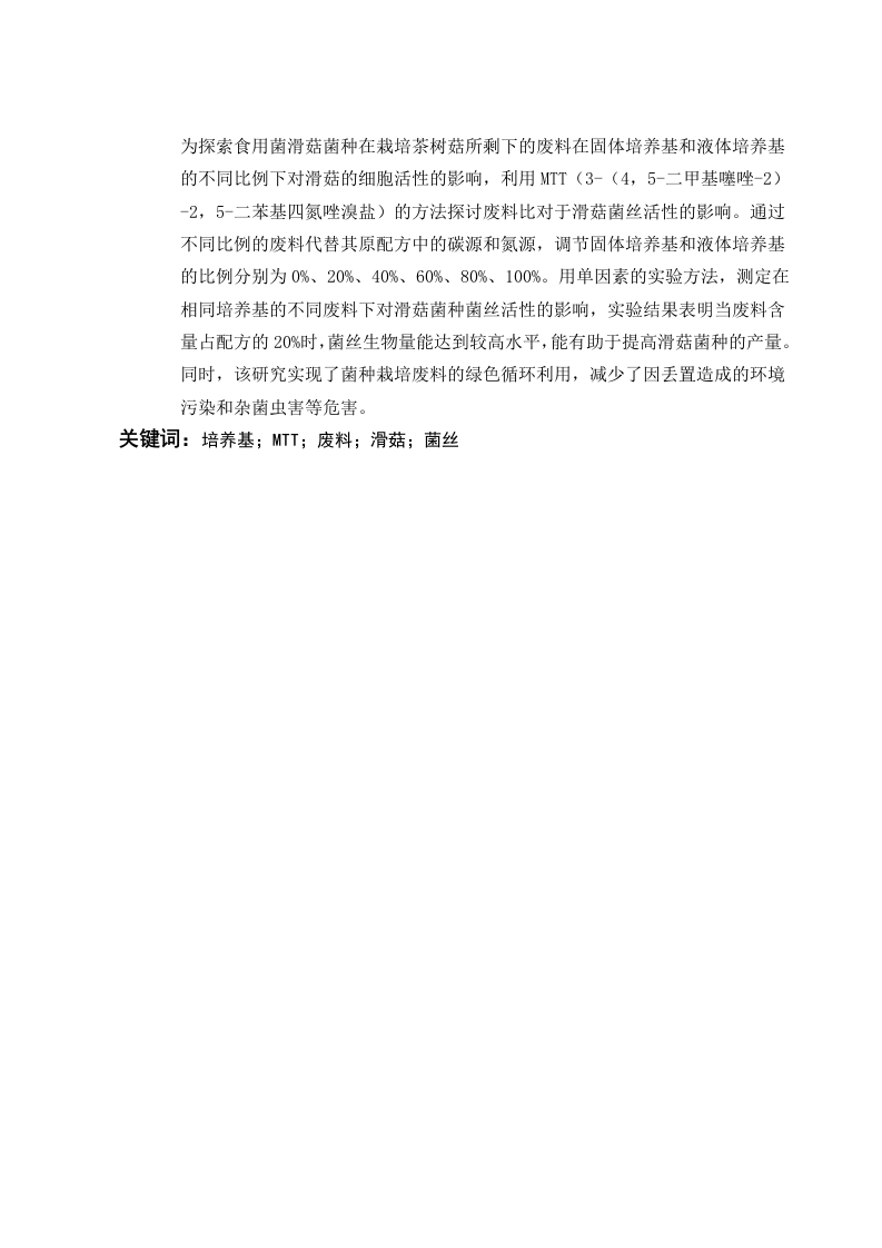 为探索食用菌滑菇菌种在栽培茶树菇所剩下的废料在固体培养基和液体培养基的不同比例下对滑菇的细胞活性的影响,利用MTT(3-(4,5-二甲基噻唑-2)-2,5-二苯基四氮唑溴盐)的方法探讨废料比对于滑菇菌丝活性的影响。通过不同比例的废料代替其原配方中的碳源和氮源,调节固体培养基和液体培养基的比例分别为0%、20%、40%、60%、80%、100%。用单因素的实验方法,测定在相同培养基的不同废料下对滑菇菌种菌丝活性的影响,实验结果表明当废料含量占配方的20%时,菌丝生物量能达到较高水平,能有助于提高滑菇菌种的产量。同时,该研究实现了菌种栽培废料的绿色循环利用,减少了因丢置造成的环境污染和杂菌虫害等危害。关键词:培养基;MTT;废料;滑菇;菌丝AbstractIn order to explore the influence of the waste materials left by the cultivationof Agrocybe chaxingu on the cell activity of pholiota nameko in differentproportion of solid medium and liquid medium,the method of MTT (3-(4,5-dimethylthiazol-2)-2,5-diphenyltetrazolium bromide)was used toexplore the influence of waste materials ratio on the mycelial activity ofpholiota nameko.The carbon and nitrogen sources in the original formula arereplaced by different proportions of waste.The proportion of solid medium andliquid medium was 0%,20%,40%,60%,80%and 100%,respectively.Thesingle factor experiment method was used to determine the effect of differentwaste materials on the mycelial activity of shiitake.The results showed thatwhen the waste materials accounted for 20%of the formula,the mycelialbiomass could reach a higher level,which could help to improve the yield ofpholiota nameko.At the same time,the research realized the green recycling ofthe culture waste,and reduced the environmental pollution and other hazardscaused by the waste disposal.Key words:culture medium;MTT;waste material;pholiota nameko hyphae目录1.1食用菌滑菇及其应用现状1.2食用菌废料的应用....12材料和方法..…22.1材料22.1.2仪器设备...2.1.3药品32.2.1菌种的活化以及扩种32.2.3灭菌2.2.4接种及培养2.2.5MTT的测定..2.2.7采样样品菌丝浓度的计算2.2.8固体培养基菌丝日均生长速度测量2.2.9固体菌丝每天生长量的测定与计算2.2.10数据处理773.2培养基不同废料比例对菌丝生物量的影响93.2.2固体培养基菌丝每天生长速度103.2.3固体培养基菌丝SDH活性...103.2.4固体培养基每天菌丝生长量11