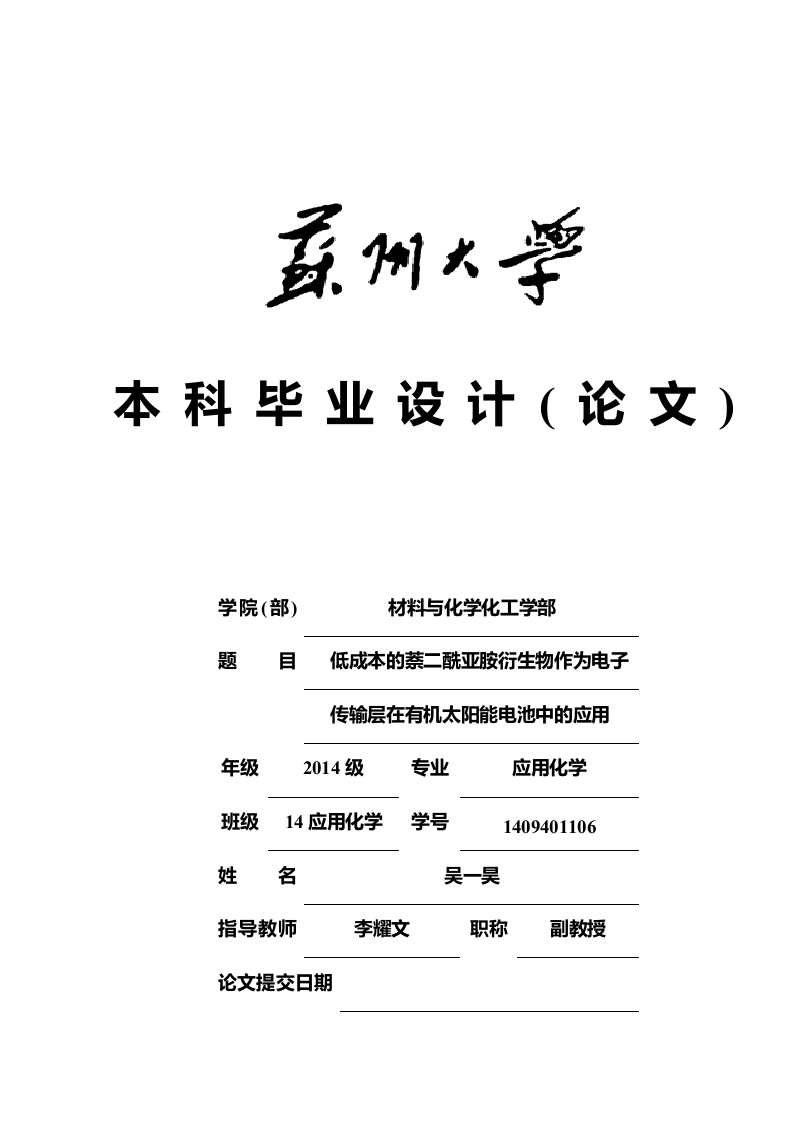 本科毕业设计(论文)学院(部)材料与化学化工学部题目低成本的萘二酰亚胺衍生物作为电子传输层在有机太阳能电池中的应用年级2014级专业应用化学班级14应用化学学号1409401106姓名指导教师李耀文职称副教授论文提交日期苏州大学本科生毕业设计(论文)目录Abstract.......2第草前言3第1.1节有机太阳能电池第1.2节有机太阳能电池的反向结构及其工作原理第1.3节有机太阳能电池的界面材料第1.4节本文的设计思想6第二章实验部分.第2.1节药品及试剂信息第2.2节仪器与设备…第2.3节器件的制备.…8第2.3.1节NDN及其衍生物的合成8第2.3.2节器件制备.8第2.4节性能测试及表征9第三章实验结果及数据分析11第3.1节不同电子传输层对器件性能的影响11第3.2节不同浓度对器件性能的影响13第3.3节器件暗电流的表征..16第3.4节材料电子迁移率的表征,.16第3.5节对器件光强依赖性的表征17第3.6节成本分析18第3.7节合成数据18第四章结论21参考文献22致谢…23苏州大学本科生毕业设计(论文)摘要自从有机太阳能电池被首次成功制备以来,至今已得到了巨大的发展。而相对于无机硅太阳能电池来说,有机太阳能电池有着成本更低、制备效率更高以及轻量化等优点,引起了科学界的广泛关注。在本论文中,我们采用低成本的萘二酰亚胺衍生物NDIN与NDN-MeI代替了传统的ZnO材料作为电子传输层,并将NDIN与NDN-MeI进行对比,比较结构差异对器件性能的影响。当NDN溶液浓度为2mgmL时,该器件的效率达到了最高,为7.16%,其中FF-52.06%,Voc-0.75V,Jsc-18.32mA/cm2。当NDN-MeI溶液浓度为1mg/mL时,该器件的效率达到了7.50%,其中FF-52.98%,Voc-0.71V,Jsc=19.89mA/cm2。相比于传统的以Zn0为电子传输层的器件,电流得到了显著提升,因此以萘二酰亚胺衍生物作为电子传输层制备有机太阳能电池有着很大的研究价值。关键词:有机太阳能电池、反向结构、NDN、NDN-MeI、能量转换效率作者:吴一昊指导教师:李耀文副教授1