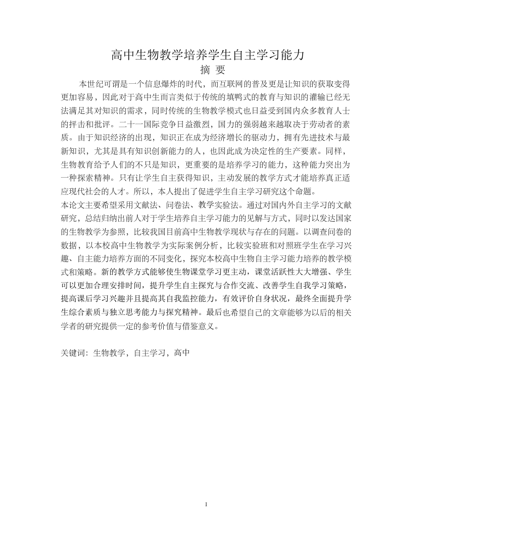 高中生物教学培养学生自主学习能力摘要本世纪可谓是一个信息爆炸的时代,而互联网的普及更是让知识的获取变得更加容易,因此对于高中生而言类似于传统的填鸭式的教育与知识的灌输已经无法满足其对知识的需求,同时传统的生物教学模式也日益受到国内众多教育人士的抨击和批评。二十一国际竞争日益激烈,国力的强弱越来越取决于劳动者的素质。由于知识经济的出现,知识正在成为经济增长的驱动力,拥有先进技术与最新知识,尤其是具有知识创新能力的人,也因此成为决定性的生产要素。同样,生物教育给予人们的不只是知识,更重要的是培养学习的能力,这种能力突出为一种探索精神。只有让学生自主获得知识,主动发展的教学方式才能培养真正适应现代社会的人才。所以,本人提出了促进学生自主学习研究这个命题。本论文主要希望采用文献法、问卷法、教学实验法。通过对国内外自主学习的文献研究,总结归纳出前人对于学生培养自主学习能力的见解与方式,同时以发达国家的生物教学为参照,比较我国目前高中生物教学现状与存在的问题。以调查问卷的数据,以本校高中生物教学为实际案例分析,比较实验班和对照班学生在学习兴趣、自主能力培养方面的不同变化,探究本校高中生物自主学习能力培养的教学模式和策略。新的教学方式能够使生物课堂学习更主动,课堂活跃性大大增强、学生可以更加合理安排时间,提升学生自主探究与合作交流、改善学生自我学习策略,提高课后学习兴趣并且提高其自我监控能力,有效评价自身状况,最终全面提升学生综合素质与独立思考能力与探究精神。最后也希望自己的文章能够为以后的相关学者的研究提供一定的参考价值与借鉴意义。关键词:生物教学,自主学习,高中目录Abstract.…第1章选题依据…1.1我国目前高中生物教学现状…11.1.1教育思想观念落后.…1.1.2人们对生物学科缺乏足够的重视21.1.3教学方法手段落后1.2选题背景、研究目的和意义1.2.1选题背景.1.2.2目的与意义.1.2.3创新性1.3自主学习必要性.…1.3.1社会需求51.3.2学生未来成长重要因素51.4自主学习的特征及含义….61.4.2自主学习的特征.…61.5自主学习研究综述…81.5.1国内研究现状…81.5.2国外研究现状.81.5.3我国生物教育未来发展方向…9第2章本校高中学生自主学习现状调查与分析2.1本校高中学生自主学习现状问卷调查102.2调查结果及分析..102.2.1学生对自己学习目标的确定102.2.2学生自我学习计划制定.112.2.3学生的学习方式122.2.4学生的学习自觉性13第3章本校高中学生生物学科自主学习能力培养及策略…153.1课前准备,告知目标一一课前问题式导学案.153.2创设情境,探究式教学模式培养学生自主学习能力163.2.1设疑教学是科学精神最重要的内涵之一3.2.2营造探究氛围是开展探究式课堂教学的重要条件173.3优化课堂结构,强化自主性学习能力的培养3.4学生自主、合作学习一引导学生掌握自主学习的方法3.5课后留新颖作业,激励学生自主学习.183.5.1留课外阅读的作业3.5.2留想象的作业.3.6提高学生的自我效能感19第4章高中生物自主学习能力培养的课堂教学实践214.1高中生物自主学习能力培养的课堂教学实践.214.1.1课前预习,告知目标一问题式导学案的编写214.1.2创设情境一引发学生自主学习的兴趣和求知欲…224.1.3学生自主-合作学习一引导学生掌握自主学习的方法244.1.4课后作业预留实例…264.2小结27第5章结果与讨论285.1实验结果5.1.1目标设定显著提升…5.1.2自我学习计划制定稳定上升.…285.1.3学习方式显著改善.295.1.4学习热情有效改善.305.2讨论315.2.1目标明确,课堂学习更主动,课堂活跃性大大增强.315.2.2合理安排时间,提升探究与合作精神325.2.3改善学习策略,提高课后学习兴趣325.2.4改善自我监控能力,有效评价自身状况…33第6章结论34