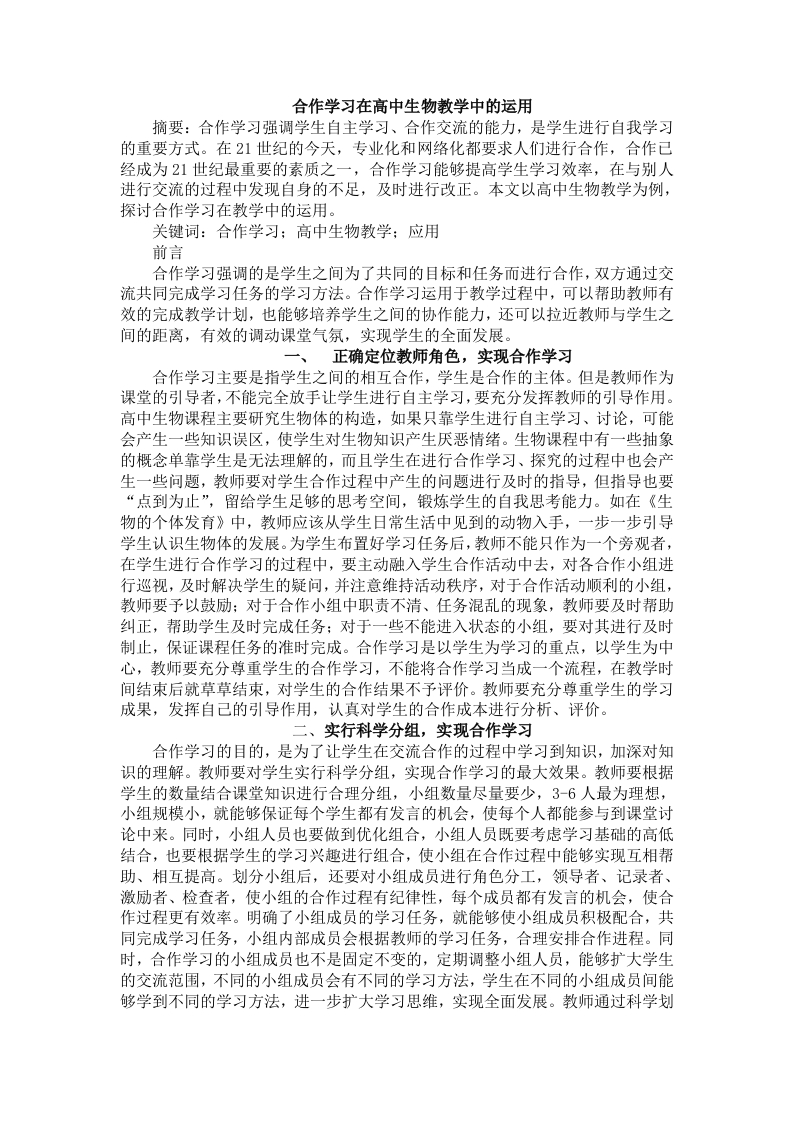 合作学习在高中生物教学中的运用摘要:合作学习强调学生自主学习、合作交流的能力,是学生进行自我学习的重要方式。在21世纪的今天,专业化和网络化都要求人们进行合作,合作已经成为21世纪最重要的素质之一,合作学习能够提高学生学习效率,在与别人进行交流的过程中发现自身的不足,及时进行改正。本文以高中生物教学为例,探讨合作学习在教学中的运用。关键词:合作学习:高中生物教学:应用前言合作学习强调的是学生之间为了共同的目标和任务而进行合作,双方通过交流共同完成学习任务的学习方法。合作学习运用于教学过程中,可以帮助教师有效的完成教学计划,也能够培养学生之间的协作能力,还可以拉近教师与学生之间的距离,有效的调动课堂气氛,实现学生的全面发展。一、正确定位教师角色,实现合作学习合作学习主要是指学生之间的相互合作,学生是合作的主体。但是教师作为课堂的引导者,不能完全放手让学生进行自主学习,要充分发挥教师的引导作用。高中生物课程主要研究生物体的构造,如果只靠学生进行自主学习、讨论,可能会产生一些知识误区,使学生对生物知识产生厌恶情绪。生物课程中有一些抽象的概念单靠学生是无法理解的,而且学生在进行合作学习、探究的过程中也会产生一些问题,教师要对学生合作过程中产生的问题进行及时的指导,但指导也要“点到为止”,留给学生足够的思考空间,锻炼学生的自我思考能力。如在《生物的个体发育》中,教师应该从学生日常生活中见到的动物入手,一步一步引导学生认识生物体的发展。为学生布置好学习任务后,教师不能只作为一个旁观者,在学生进行合作学习的过程中,要主动融入学生合作活动中去,对各合作小组进行巡视,及时解决学生的疑问,并注意维持活动秩序,对于合作活动顺利的小组,教师要予以鼓励:对于合作小组中职责不清、任务混乱的现象,教师要及时帮助纠正,帮助学生及时完成任务:对于一些不能进入状态的小组,要对其进行及时制止,保证课程任务的准时完成。合作学习是以学生为学习的重点,以学生为中心,教师要充分尊重学生的合作学习,不能将合作学习当成一个流程,在教学时间结束后就草草结束,对学生的合作结果不予评价。教师要充分尊重学生的学习成果,发挥自己的引导作用,认真对学生的合作成本进行分析、评价。二、实行科学分组,实现合作学习合作学习的目的,是为了让学生在交流合作的过程中学习到知识,加深对知识的理解。教师要对学生实行科学分组,实现合作学习的最大效果。教师要根据学生的数量结合课堂知识进行合理分组,小组数量尽量要少,3-6人最为理想,小组规模小,就能够保证每个学生都有发言的机会,使每个人都能参与到课堂讨论中来。同时,小组人员也要做到优化组合,小组人员既要考虑学习基础的高低结合,也要根据学生的学习兴趣进行组合,使小组在合作过程中能够实现互相帮助、相互提高。划分小组后,还要对小组成员进行角色分工,领导者、记录者、激励者、检查者,使小组的合作过程有纪律性,每个成员都有发言的机会,使合作过程更有效率。明确了小组成员的学习任务,就能够使小组成员积极配合,共同完成学习任务,小组内部成员会根据教师的学习任务,合理安排合作进程。同时,合作学习的小组成员也不是固定不变的,定期调整小组人员,能够扩大学生的交流范围,不同的小组成员会有不同的学习方法,学生在不同的小组成员间能够学到不同的学习方法,进一步扩大学习思维,实现全面发展。教师通过科学划分合作学习小组,让学生接触不同的学习氛围,在合作过程中,充分发挥学生的主动作用,使学生相互学习,发现自己学习的不足之处,努力向别人学习,实现学生之间的相互激励,让学习积极性高的学生带动积极性低的学生,实现共同进步。三、选择合适内容,实现合作学习合作学习是学生就一个学习任务进行共同探讨的过程,学生在这一过程中,能够充分发挥自己的学习思维能力和问题解决能力,并调动以前的知识点进行相互联系,共同解决问题。所以教师在制定学习任务的时候,要充分结合课本知识,找出适合学生进行合作学习的内容,内容既有可讨论性,又有前后联系性:既能调动学生的积极性,引发学生的学习兴趣,又必须是课堂内容,与课本知识向联系。如在《人类遗传病与优生》一课中,教师就可以结合当前的“试管婴儿”让学生讨论“试管婴儿”是否会有遗传病?这跟基因有关系吗?将课本知识与社会热门话题相结合,使合作内容有吸引力,能够引发学生的学习兴趣,提高课堂效率。教师在设置合作学习的学习任务时,要深入了解学生的学习兴趣,活动的设置要能够调动学生的学习积极性。教师还可以充分利用多媒体技术,从网上搜集相关知识点,为学生展示一些图片、视频,并结合各种课外资料,精选课堂知识点,使合作学习的知识点有吸引力。将多媒体运用于生物教学,能够丰富教学手段,使生物知识更具有魅力。教师利用多媒体有效的调动学生注意力,活跃学生思维,再结合多媒体内容提出合作学习任务,学生能够在这样的学习氛围中,有效调动大脑中的知识点,提高学习效率。只有选择适合学生进行合作的课堂知识,才能充分发挥合作学习的效果,如果合作学习的内容没有深度,学生的讨论活动也就没有了意义,如果内容过于