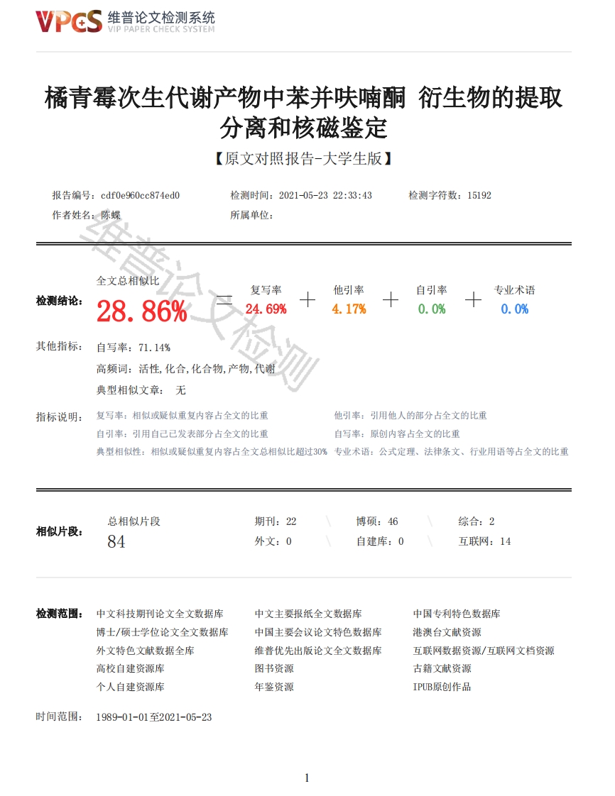 维普论文检测系统VIP PAPER CHECK SYSTEM橘青霉次生代谢产物中苯并呋喃酮衍生物的提取分离和核磁鉴定【原文对照报告-大学生版】报告编号:cdf0e960cc874ed0检测时间:2021-05-2322:33:43检测字符数:15192作者姓名:陈蝶所属单位:全文总相似比复写率他引率自引率专业术语检测结论:28.86%24.69%4.17%0.0%0.0%其他指标:自写率:71.14%高频词:活性,化合,化合物,产物,代谢典型相似文章:无指标说明:复写率:相似或疑似重复内容占全文的比重他引率:引用他人的部分占全文的比重自引率:引用自己已发表部分占全文的比重自写率:原创内容占全文的比重典型相似性:相似或疑似重复内容占全文总相似比超过30%专业术语:公式定理、法律条文、行业用语等占全文的比重总相似片段期刊:22博硕:46综合:2相似片段:84外文:0自建库:0互联网:14检测范围:中文科技期刊论文全文数据库中文主要报纸全文数据库中国专利特色数据库博士/硕士学位论文全文数据库中国主要会议论文特色数据库港澳台文献资源外文特色文献数据全库维普优先出版论文全文数据库互联网数据资源/互联网文档资源高校自建资源库图书资源古籍文献资源个人自建资源库年鉴资源IPUB原创作品时间范围:1989-01-01至2021-05-23维普论文检测系统VIP PAPER CHECK SYSTEM原文对照颜色标注说明:■自写片段■复写片段(相似或疑似重复)口引用片段(引用)■专业术语(公式定理、法律条文、行业用语等)本科毕业论文题目:橘青霉次生代谢产物中苯并呋喃酮衍生物的提取分离和核磁鉴定学院:医学院专业:药学学号:201709157014学生姓名:陈蝶指导教师:刘娟杨曦亮日期:二O二一年五月摘要目的通过对内生真菌橘青霉次生代谢产物的提取分离、纯化和波谱解析的深入研究,确定其次生代谢产物的结构,以期发现新的活性。方法①菌株的发酵:从PDA斜面培养基挑取橘青霉菌株,接种到100m1PDB培养基中,恒温,摇床培养2天,按5%接种量转移到发酵培养基中进行大规模发酵:②次生代谢产物的提取:在得到发酵液后,加入等体积的乙酸乙酯萃取,经旋转蒸发仪蒸发浓缩后得棕色粗提取物:③分离:粗提取物经葡聚糖凝胶L止20,用甲醇洗脱,合并相同部分得到6个组份,组份3经硅胶柱层析洗脱分离又得到8个组份:④纯化:将得到的组份进RP-PLC,以乙腈-水(20%-100%)洗脱得单体化合物:⑤结构鉴定:通过解析1H-MR、13C-MR等谱图,与参考文献对照确定结构。结果通过柱层析分离及高效液相色谱纯化等方法,从橘青霉次生代谢产物中得到一白色结晶状化合物,利用核磁共振等方法确定该化合物为7-Hydroxy-5-me thoxy-4,6-dimethylisobenzofuran-l(3)-one。结论7-Hydroxy-5-methoxy-4,6-dimethylisobenzofuran-l(3H)-one为内生菌橘青霉次生代谢产物中的一种成分,在橘青霉中首次发现,其活性还需进行深入研究。关键词:橘青霉:次生代谢产物:提取分离:结构鉴定:波谱解析2维普论文检测系统VIP PAPER CHECK SYSTEMAbstractObjective To determine the structure of the secondary metabolites of endophytic fungusPenicillium citrus through in-depth study on the extraction,purification and spectral analysis ofthe secondary metabolites of Penicillium citrus,in order to find new natural active components.Methods Ofermentation of strain Penicillium citrus was selected from PDA slant culture medium,inoculated into 100 mlPDB medium,incubated in constant temperature shaker for 2 days,andtransferred to fermentation medium for large-scale fermentation according to 5%inoculum.2extraction of secondary metabolites:the same volume of ethyl acetate was added to thefermentation broth,and the crude brown extract was evaporated and concentrated by rotaryevaporator.3separation:the crude extract was eluted with methanol by dextran gel LH-20,and 6components were obtained by merging the same part,and 8 components were obtained by silica gelcolumn chromatography.4purification:the obtained components were eluted with acetonitrile-water(20%100%)to obtain monomer compounds.5structure identification:the structure wasdetermined byanalyzing IH-NMR and 13C-NMR spectra and comparing with the references.Results A white crystalline compound was obtained from the secondary metabolites of Penicilliumby column chromatography and high performance liquid chromatography.The compound was identified as7-hydroxy-5-methoxy-4-dimethylisobenzofuran-1 (3H)-one by NMR.Conclusion 7-hydroxy-5-methoxy-4-methoxy-6-dimethylisobenzofuran-1 (3H)-one is one of thesecondary metabolites of endophytic Penicillium citrus,which is the first in Penicillium citrus,and its activity needs to be further studied.Key words:Penicillium citrus;Secondary metabolites;Extraction and separation:Structureidentification;Spectrum analysis目录前言11实验材料及仪器41.1实验菌株41.2培养基41.3实验耗材41.4实验仪器42实验方法及步骤52.1橘青霉的发酵52.2次生代谢产物的提取52.3次生代谢产物的分离52.3.1硅胶柱分离52.3.1.1拌样、装柱及上样52.3.1.2梯度洗脱52.3.2凝胶柱分离62.4纯化62.5化合物的波谱解析与结构鉴定62.5.1化合物的NMR谱图解析62.5.1.113C-MR谱图解析62.5.1.2DEPT谱图解析92.5.1.31H-NR谱图解析102.6结构分析123结果讨论144结论与展望15参考文献163