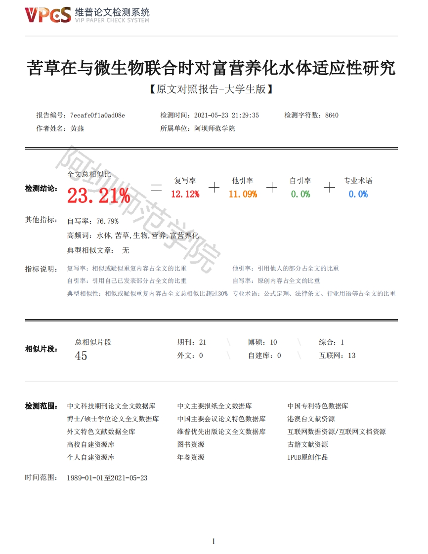 维普论文检测系统/IP PAPER CHECK SYSTEM苦草在与微生物联合时对富营养化水体适应性研究【原文对照报告-大学生版】检测时间:2021-05-2321:29:35检测字符数:8640作者姓名:黄燕所属单位:阿坝师范学院全文总相似比复写率他引率自引率专业术语检测结论:23.21%12.12%11.09%0.0%0.0%其他指标:自写率:76.79%高频词:水体,苦草,生物,营养,富营养化典型相似文章:无指标说明:复写率:相似或疑似重复内容占全文的比重他引率:引用他人的部分占全文的比重自引率:引用自己已发表部分占全文的比重自写率:原创内容占全文的比重典型相似性:相似或疑似重复内容占全文总相似比超过30%专业术语:公式定理、法律条文、行业用语等占全文的比重总相似片段期刊:21博硕:10综合:1相似片段:45外文:0自建库:0互联网:13检测范围:中文科技期刊论文全文数据库中文主要报纸全文数据库中国专利特色数据库博士/硕士学位论文全文数据库中国主要会议论文特色数据库港澳台文献资源外文特色文献数据全库维普优先出版论文全文数据库互联网数据资源/互联网文档资源高校自建资源库图书资源古籍文献资源个人自建资源库年鉴资源IPUB原创作品时间范围:1989-01-01至2021-05-23维普论文检测系统VIP PAPER CHECK SYSTEM原文对照颜色标注说明:■自写片段■复写片段(相似或疑似重复)口引用片段(引用)■专业术语(公式定理、法律条文、行业用语等)A BA TEACHERS UNIVERSITY本科毕亚论文(设计)题目苦草在与微生物联合时对富营养化水体适应性研究二级学院资源与环境学院专业年级生物(本)2017-02班学生姓名黄燕学号20177569指导教师梁剑职称教授完成时间:2021年5月17日阿坝师范学院本科毕业论文原创性声明本人郑重声明:所呈交的毕业论文,是本人在指导教师的的指导下,独立进行研究工作所取得的成果。除文中已经注明引用的内容外,本论文不含任何其他个人或集体已经发表或撰写过的作品或成果。对本文的研究做出重要贡献的个人和集体,均已在文中以明确方式标明。本人完全意识到本声明的法律结果由本人承担。毕业论文作者签名:日期:年月日关于论文使用授权的声明毕业论文作者完全了解阿坝师范学院有关保留和使用毕业论文的规定,即:本科生在校学习期间论文工作的知识产权单位属阿坝师范学院。学校有权保留并向国家有关部门或机构送交论文的复印件和电子版,允许毕业论文被查阅和借阅:学校可以公布论文的全部或部分内容,可以采用影印、缩印或其它复制手段保存、汇编毕业论文。保密的毕业论文在解密后遵守此规定。2维普论文检测系统VIP PAPER CHECK SYSTEM本人签名:日期:指导教师签名:日期:目录摘要1关键词1AbstractlKey words2前言21实验材料及方法31.1实验材料3◆1.2实验过程及方法41.2.1驯化植物41.2.2苦草与微生物联合培养41.2.3模拟中度富营养化水体条件41.2.4取水样51.2.5测定植物指标51.2.6测定水体中的pH值52结果分析52.1植物测定结果与分析52.1.1对苦草株高的影响6范学院2.1.2对苦草根长的影响62.1.3对苦草鲜重的影响72.1.4对苦草可溶性蛋白质含量的影响82.1.5对苦草内还原糖含量的影响82.2pH测定结果与分析93讨论与结论93.2结论103.3展望10参考文献11致谢12苦草在与微生物联合时对富营养化水体适应性研究生物科学专业黄燕指导教师梁剑教授摘要:为了探究如何提高植物对富营养化水体的适应性,修复富营养化水体,实验以苦草为研究材料,加入光合细菌和枯草芽孢杆菌进行联合培养。实验测定了在实验终期的苦草在清水(CK)、富营养化水体(C1)、微生物+富营养化水体(C2)中的苦草的株高、根长、鲜重、可溶性蛋白质含量、还原糖含量等生物量指标及水体的H值。实验结果表明,3个组苦草的株高与还原糖含量中C2处理组的还原糖含量与株高最高。可溶性蛋白质含量C1处理组最高,C2处理组有所下降,C2处理组更利于苦草生长。关键词:苦草;光合细菌:枯草芽孢杆菌:污染水体:适应性Study on Adaptability of Vallisneria to eutrophic water when combined with microorganismBioscience Huang YanInstructor Liang Jian ProfessorAbstract:In order to explore how to improve the adaptability of plants to the eutrophic waterand repair the eutrophic water,the experiment took Vallisneria as the research material,and addedphotosynthetic bacteria and Bacillus subtilis for co culture.The plant height,root length,fresh3