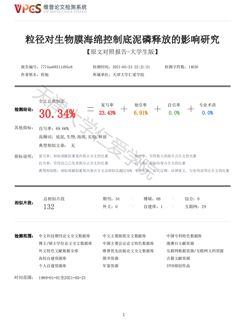 维普论文检测系统/IP PAPER CHECK SYSTEM粒径对生物膜海绵控制底泥磷释放的影响研究【原文对照报告-大学生版】报告编号:7774ae68211d95e8检测时间:2021-05-2322:21:21检测字符数:14030作者姓名:程旭所属单位:天津大学仁爱学院全文总相似比复写率他引率自引率专业术语检测结论:30.34%23.43%6.91%0.0%0.0%其他指标:自写率:69.66%高频词:底泥,生物,海绵,实验,释放典型相似文章:无指标说明:复写率:相似或疑似重复内容占全文的比重引用他人的部分占全文的比重自引率:引用自己已发表部分占全文的比重自写率:原创内容占全文的比重典型相似性:相似或疑似重复内容占全文总相似比超过30%专业术语:公式定理、法律条文、行业用语等占全文的比重总相似片段期刊:34博硕:68综合:0相似片段:132外文:0自建库:1互联网:29检测范围:中文科技期刊论文全文数据库中文主要报纸全文数据库中国专利特色数据库博士/硕士学位论文全文数据库中国主要会议论文特色数据库港澳台文献资源外文特色文献数据全库维普优先出版论文全文数据库互联网数据资源/互联网文档资源高校自建资源库图书资源古籍文献资源个人自建资源库年鉴资源IPUB原创作品时间范围:1989-01-01至2021-05-23维普论文检测系统VIP PAPER CHECK SYSTEM原文对照颜色标注说明:■自写片段■复写片段(相似或疑似重复)口引用片段(引用)■专业术语(公式定理、法律条文、行业用语等)津大毕业设计(论文)说明书COLLEGE题目:粒径对生物膜海绵控制底泥磷释放的影响研究系名建筑工程系专业给排水科学与工程学号6017207177学生姓名程旭指导教师刘霄2021年5月21日摘要水体富营养化是全球重要水质难题,其中磷是导致水体富营养化的主要因素之一。在外源磷得到有效控制下,控制底泥磷释放是治理水体富营养化的重要措施。通过室内底泥释放模拟试验,分析底泥磷的释放规律。利用原位覆盖技术,探究不同粒径的活性覆盖材料一生物膜海绵对控制底泥磷释放的影响,确定最佳粒径的生物膜海绵进行活性覆盖。选择三种粒径的聚氨酯海绵:0.5-1m、1-2m、2-4m进行培养,得到生物膜海绵。实验结果表明,三种粒径的生物膜海绵对磷的吸附效果为:0.5-1m>1-2m>2-4m,对总磷的吸附率分别为59.8%、49%、32%,说明在覆盖厚度一定的情况下,材料粒径越小对底泥中污染物的阻隔和吸附作用越强。环境因子对底泥磷释放也有影响:升高温度、D0浓度低都可以加速底泥中磷的释放:中性条件有利于对磷的吸附,过酸过碱条件都会加速磷的释放。ABSTRACT2维普论文检测系统VIP PAPER CHECK SYSTEMWater eutrophication is an important water quality problem in the world,among which phosphorusis one of the main factors leading to water eutrophication,and the release of phosphorus fromsediment will aggravate water quality deterioration.Under the effective control of exogenousphosphorus,it is an important measure to control eutrophication of water body to control phosphorusrelease from sediment.Through the indoor sediment release simulation test,the phosphorus release law of sediment wasanalyzed.In situ mulching technology was used to explore the influence of biofilm sponge withdifferent particle sizes on controlling phosphorus release from sediment,and the best particle sizebiofilm sponge was determined for active mulching.Three sizes of polyurethane sponge were selected:0.5-1mm,1-2mm and 2-4mm for culture,and the biofilm sponge was obtained.The experimental resultsshowed that the adsorption efficiency of the three particle sizes of biofilm sponges for phosphoruswas 0.5-1mm 2-4mm 1-2mm,and the adsorption rates of total phosphorus were 59.8%,49%,32%.Itshows that the smaller the particle size of the material,the stronger the barrier and adsorption ofpollutants in the sediment under the condition of a certain covering thickness.Environmental factorsalso have an effect on the release of phosphorus from sediment.Increasing temperature and low DOconcentration can accelerate the release of phosphorus from sediment.Neutral conditions arefavorable to the adsorption of phosphorus,and excessive acid and alkali conditions will acceleratethe release of phosphorus.Key words:Biofilms ponge;Particlesize:Water eutrophication;Endogenous phosphorus:Sediment目录第一章绪论11.1研究背景11.2磷在底泥中的存在形式及其去除途径11.3国内外研究现状21.4研究意义3第二章研究内容与测定方法4爱学院2.1主要内容及技术路线42.2实验材料来源及性质72.3实验仪器及试剂82.4实验项目92.5测定方法12第三章结果及分析153.1活性污泥性能的分析153.2分析数据163.3上覆水磷含量数据分析173.4上覆水的水质指标203.5底泥磷含量数据分析24第四章结论与展望284.1结论284.2展望28参考文献29第一章绪论1.1研究背景水体富营养化是全球重要水质难题,其中磷是导致水体富营养化的主要因素之一,底泥磷的释放会加剧水质恶化。近年来,我国经济发展带来的环境问题越来越严重,许多城市的河流湖泊水体出现富营养化。水体富营养化对城市的环境造成了严重的影响,不但影响城市容貌,更影响周围的生态环境和居民的生活健康。富营养化会影响水体的水质,产生水华现象,降低了水的透明度,植物无法利用太阳光进行光合作用。就可能3