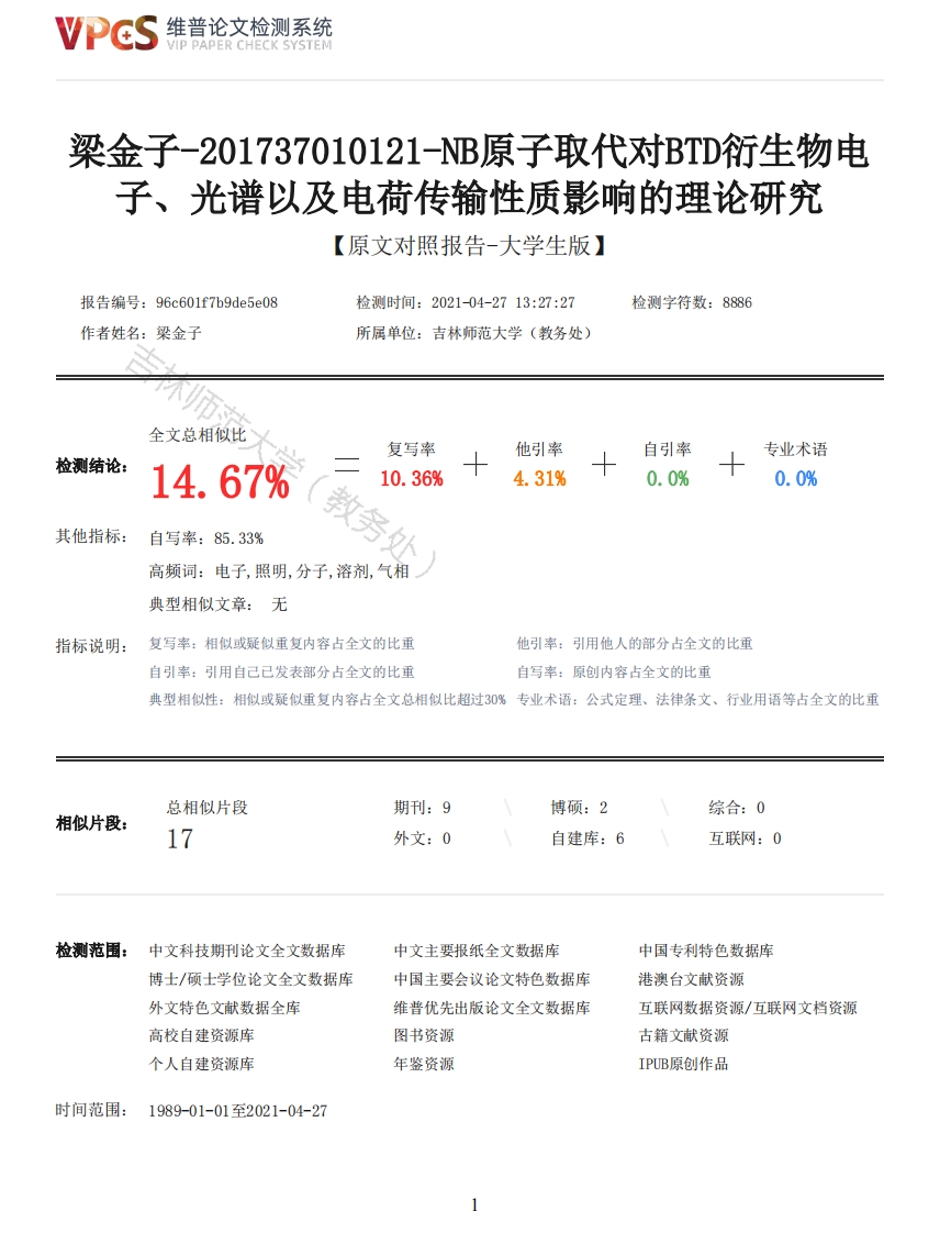 维普论文检测系统VIP PAPER CHECK SYSTEM梁金子-201737010121-NB原子取代对BTD衍生物电子、光谱以及电荷传输性质影响的理论研究【原文对照报告-大学生版】报告编号:96c601f7b9de5e08检测时间:2021-04-2713:27:27检测字符数:8886作者姓名:梁金子所属单位:吉林师范大学(教务处)全文总相似比复写率他引率自引率专业术语检测结论:14.67%10.36%4.31%0.0%0.0%其他指标:自写率:85.33%教务处高频词:电子,照明,分子,溶剂,气相典型相似文章:无指标说明:复写率:相似或疑似重复内容占全文的比重他引率:引用他人的部分占全文的比重自引率:引用自己已发表部分占全文的比重自写率:原创内容占全文的比重典型相似性:相似或疑似重复内容占全文总相似比超过30%专业术语:公式定理、法律条文、行业用语等占全文的比重总相似片段期刊:9博硕:2综合:0相似片段:17外文:0自建库:6互联网:0检测范围:中文科技期刊论文全文数据库中文主要报纸全文数据库中国专利特色数据库博士/硕士学位论文全文数据库中国主要会议论文特色数据库港澳台文献资源外文特色文献数据全库维普优先出版论文全文数据库互联网数据资源/互联网文档资源高校自建资源库图书资源古籍文献资源个人自建资源库年鉴资源IPUB原创作品时间范围:1989-01-01至2021-04-27维普论文检测系统VIP PAPER CHECK SYSTEM原文对照颜色标注说明:■自写片段■复写片段(相似或疑似重复)口引用片段(引用)■专业术语(公式定理、法律条文、行业用语等)吉林师范大学毕业论文(设计论文分类号:064密级:无论文(设计)题目NB原子取代对BTD衍生物电子、光谱以及电荷传输性质影响的理论研究学院、专业:化学学院化学专业学生姓名:梁金子年级、班、学号:2017级1班201737010121指导教师及职称:胡波副教授2021年4月28日目录摘要1引言21计算方法32结果与讨论32.1电子性质32.2光谱性质52.3重组能73结论7参考文献8N/B原子取代对BTD衍生物电子、光谱以及电荷传输性质影响的理论研究摘要:采用量子化学方法研究N/B原子取代对BTD衍生物电子、光谱以及电荷传输性质影响。通过气相与溶剂相得到的数据,与母体分子进行比较可知,在分子上进行N/B原子取代后,最高占据分子轨道的能量(HOM0)明显降低,最低空分子轨道的能量(ELUMO)同时降低,导致能隙(Eg)变大:最大吸收波长(bs)和最大发射波长(em)向蓝波方向大幅度移动:电子传输性能提高。关键词:0LDs:BTD衍生物:电子性质:光谱性质:电荷传输性质Theoretical Study on the Effects of N/B Substitution on the Electronic,Spectral and ChargeTransport Properties of BTD DerivativesAbstract:The effects of N/B substitution on the electronic,spectral and charge transferproperties of BTD derivatives were studied by quantum chemistry methods.Comparing the data obtainedfrom gas phase and solvent phase with the pristine molecule,it can be seen that after N/B2维普论文检测系统VIP PAPER CHECK SYSTEMsubstitution on the molecule,the energy of the highest occupied molecular orbit is significantlyreduced,and the energy of the lowest unoccupied molecular orbit is reduced simultaneously,whichleads to the increase of energy gap,and the maximum absorption wavelength and maximum emissionwavelength blue shift greatly.The electron transport is improved.Key words:OLEDs:BTD derivatives;Electronic properties;Optical properties;Charge transferproperties引言有机发光二极管是一种有机电致发光器件,因其具有节能、亮度高、使用寿命长等优点,在电子、工业等领域有着极高的关注度[1]。有机电致发光器件作为一种面光源,具有自发光、全固化显示、响应快、耗能低、体型小并且能柔性显示等一系列优点,在显示与照明领域展现出巨大的市场价值[2]。对于当前的0LED产业情况来说,0LD材料向着尺寸增大与性能提高的方向一步步向前发展[3]。0LED是一种绿色的健康的有机光源,终将变成照明设备界的研究开发的热门方向之一[4幻。在信息化时代,显示技术作为机交互最重要的手段在们的生活中随处可见且不可或缺。柔性0LED拥有许多特点,包括可折叠、体型轻薄、成本低廉、照明性能好的特点,采用喷墨打印等方式可以大规模制备开发。它在穿戴设备、折叠电子设备等领域前景很广[5]。另外近十年来,0LED很大程度地丰富了照明与信息显示方式。0LD照明光源还有性柔和型薄的优点,与传统照明方式相比较之下,它可以应用到更广泛的领域中。除此之外,OLED照明既低温,也不发热,在节省能耗能源方面拥有更好的表现。因此如果能利用有机材料制备出一种绿色环保、节能高效的0LED,来作为汞光源的替代物,就可以减少汞对环境的污染6]。自从1987年首次实现了三明治结构的OLED器件以来,OLED技术近些年取得了很大的成就,效率和寿命得到了巨大的提高,从而推动了0LED技术的发展和产业化[2]。作为新一代的显示及照明技术,小型0LD显示器逐步商业化,大型0LD电视和照明等家用设备也相继有产品诞生,但是0LED生活用件在穿戴、电子等方面的应用依然处于漫漫求索期[7]。对于0LD技术来说,其发光功能实现相应的发光材料是核心内容,而这种材料的形成同样也是有着多种变化的[8]。大众化的电子生活产品对于0LD材质的韧性要求比较低,0LED独特的性质也决定了材料在照明设备方面的广泛应用,OLD对比LCD具有厚度薄、可视角度广、反应速度快等特点[9]。在不远的未来,当今流行的LD设备将会被0LED照明设备所逐渐取代,它的未来的发展前景很美好。但若想完全让市面上所有的照明工