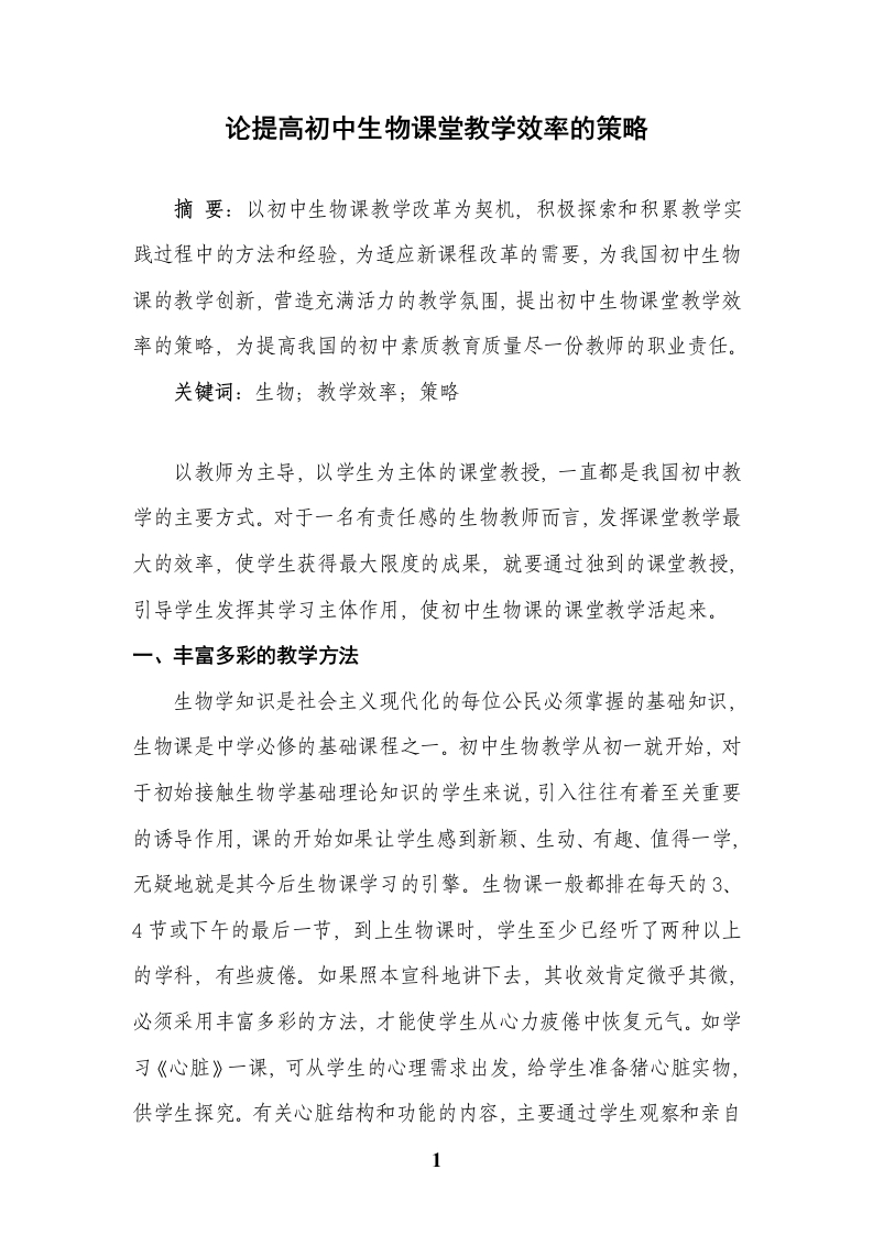 论提高初中生物课堂教学效率的策略摘要:以初中生物课教学改革为契机,积极探索和积累教学实践过程中的方法和经验,为适应新课程改革的需要,为我国初中生物课的教学创新,营造充满活力的教学氛围,提出初中生物课堂教学效率的策略,为提高我国的初中素质教育质量尽一份教师的职业责任。关键词:生物;教学效率;策略以教师为主导,以学生为主体的课堂教授,一直都是我国初中教学的主要方式。对于一名有责任感的生物教师而言,发挥课堂教学最大的效率,使学生获得最大限度的成果,就要通过独到的课堂教授,引导学生发挥其学习主体作用,使初中生物课的课堂教学活起来。一、丰富多彩的教学方法生物学知识是社会主义现代化的每位公民必须掌握的基础知识,生物课是中学必修的基础课程之一。初中生物教学从初一就开始,对于初始接触生物学基础理论知识的学生来说,引入往往有着至关重要的诱导作用,课的开始如果让学生感到新颖、生动、有趣、值得一学,无疑地就是其今后生物课学习的引擎。生物课一般都排在每天的3、4节或下午的最后一节,到上生物课时,学生至少已经听了两种以上的学科,有些疲倦。如果照本宣科地讲下去,其收效肯定微乎其微,必须采用丰富多彩的方法,才能使学生从心力疲倦中恢复元气。如学习《心脏》一课,可从学生的心理需求出发,给学生准备猪心脏实物,供学生探究。有关心脏结构和功能的内容,主要通过学生观察和亲自1动手操作形成认识、发现问题,学生由旁观者变为操作者,由被动接受者变为主动探究者,这样学生的积极性就调动起来了,学生合作探究的过程,也能很好地去除教师唱独角戏的现象,学生成了课堂的中心,学生自主学习的空间变大了。解剖猪心脏,观察心脏内部结构,共同讨论分析:“为什么从动脉灌水灌不进去?”共同比较四个部分的壁厚薄有何区别等等。边接受知识边探究知识,学生不再是孤立的学习者,而是有学习“伙伴,他们之间产生心灵的共振、思维碰撞的火花;使他们的知识、技能互相促进,共同提高。二、饶有趣味的阅读阅读是人的心理需求在行为上的实现,初中学生的知识获取和积累,也要通过大量的阅读活动才得实现,正确引导和指导学生的阅读活动,学习和获取必需的生物学基础知识并进行有效的积累和应用,是生物教师应尽的职责和义务。阅读是一个由形式到内容,由内容到形式,反复多次逐步加深理解的过程,对阅读材料的选择尽量短小、简练,阅读方式尽可能多样化、多元化,充分利用现代信息技术、多媒体技术,使课堂阅读妙趣横生,让学生对各种生物知识文献的阅读兴趣,时常保持在意犹未尽的状态并能促发其课外阅读的潜力。在讲解人体血液循环路线图时,发现有的学生打起了呵欠,眼神开始游离,随时按键一点屏幕切换成事先准备好的一则阅读材料:“有个人在抬商双臂、伸直颈部、呼吸扩胸、伸展腰部、活动关节、放松脊柱。怎么样?感觉很轻松吧?”其实,这是一种有益的保健方法。现代医学认为,离心脏较远的静脉血管,非常需要靠肌肉的收缩来加速血液流回2心脏。由于伸懒腰时,可引发大部分肌肉收缩,这将淤积血液赶回心脏,从而达到加速血液循环的目的,在学习之余,如果经常伸懒腰,能不断增加对大脑的刺激作用,使颈部血管舒畅地把血液输送到脑子里,让大脑得到充足的营养,消除疲劳;能使全身神经、肌肉得以舒展,促进机体平衡;能增加吸氧量,促进机体新陈代谢;能消除腰肌过度紧张,防止腰肌劳损,而且能及时纠正脊柱过度向前弯曲,保持健美体型。伸懒腰是一种简单而易行的活动,它不受时间和空间的限制。在你学习感到疲劳、精神差的时候,不妨把学习停下来,伸几次懒腰,让精神振作起来,大家一起伸个懒腰,放松一下吧!这时学生马上兴奋起来,纷纷效仿短文内容,接连伸了几个懒腰,这招真灵,学生眼睛开始熠熠生辉,精神劲儿一下子高涨,而且对血液循环内容有了更深刻的理解,一举两得。三、画龙点睛的讲解讲解是初中生物教学常用的重要形式。讲解就是教师向学生说明、解释事实和论证原理,进行科学、有论据的逻辑推理,着重培养学生的抽象逻辑思维。初中生物学中有关生理功能、遗传变异等知识的教学,常应用讲解法。教师是生物课讲解的主体,学生是听讲的对象。教师的讲解,不仅只是为了解惑和授予学习的方法,还要启迪学生学习生物知识的兴趣,激发其自主学习的潜能。如在讲解“肾单位”这个知识点时,我适时从讲台下变戏法般地拿出准备好的道具毛线团,果然,学生的眼球刷的全部集中到我手中的毛线团上,心急的学生快言快语“老师你拿毛线千什么,教我们织毛衣吗?”我故作神秘地3