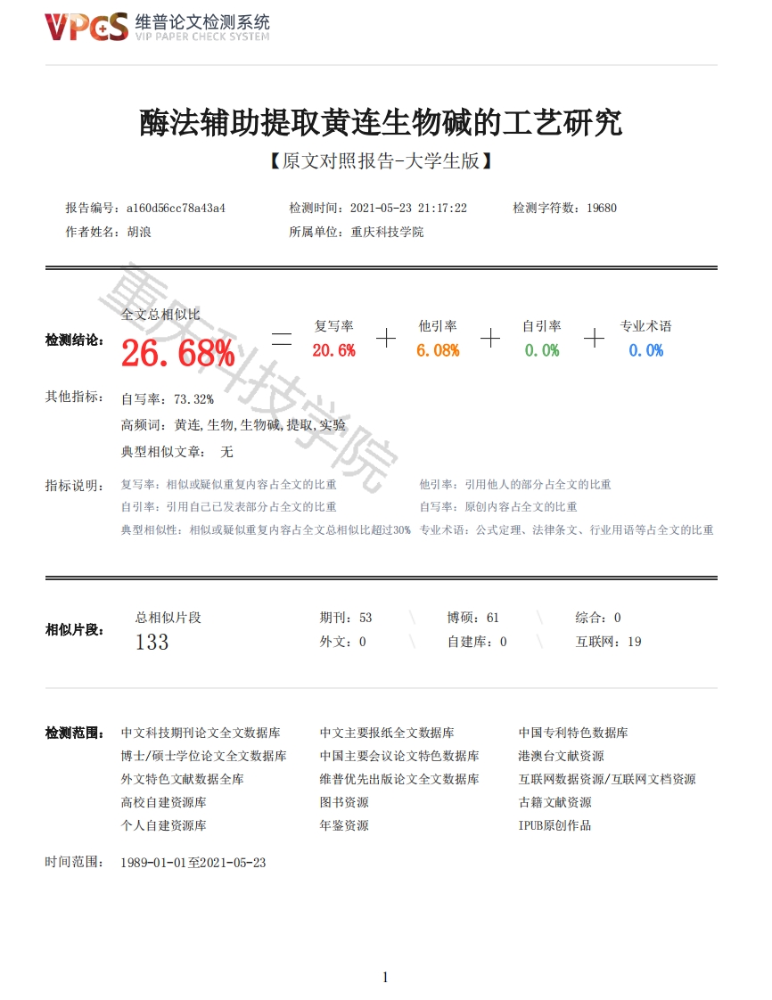 维普论文检测系统VIP PAPER CHECK SYSTEM酶法辅助提取黄连生物碱的工艺研究【原文对照报告-大学生版】报告编号:a160d56cc78a43a4检测时间:2021-05-2321:17:22检测字符数:19680作者姓名:胡浪所属单位:重庆科技学院全文总相似比复写率他引率自引率专业术语检测结论:26.68%20.6%6.08%0.0%0.0%其他指标:自写率:73.32%高频词:黄连,生物,生物碱,提取,实验典型相似文章:无指标说明:复写率:相似或疑似重复内容占全文的比重他引率:引用他人的部分占全文的比重自引率:引用自己已发表部分占全文的比重自写率:原创内容占全文的比重典型相似性:相似或疑似重复内容占全文总相似比超过30%专业术语:公式定理、法律条文、行业用语等占全文的比重总相似片段期刊:53博硕:61综合:0相似片段:133外文:0自建库:0互联网:19检测范围:中文科技期刊论文全文数据库中文主要报纸全文数据库中国专利特色数据库博士/硕士学位论文全文数据库中国主要会议论文特色数据库港澳台文献资源外文特色文献数据全库维普优先出版论文全文数据库互联网数据资源/互联网文档资源高校自建资源库图书资源古籍文献资源个人自建资源库年鉴资源IPUB原创作品时间范围:1989-01-01至2021-05-23维普论文检测系统VIP PAPER CHECK SYSTEM原文对照颜色标注说明:■自写片段■复写片段(相似或疑似重复)口引用片段(引用)■专业术语(公式定理、法律条文、行业用语等)重庆科技学院1951毕业设计(论文)题目酶法辅助提取黄连生物碱的工艺研究院(系)化学化工学院专业班级制药工程专升本2017-01学生姓名胡浪学号2019520367指导教师陈楠职称讲师评阅教师陈笈职称讲师2021年5月25日注意事项1.设计(论文)的内容包括:1)封面(按教务处制定的标准封面格式制作)2)原创性声明3)中文摘要(300字左右)、关键词4)外文摘要、关键词5)目次页(附件不统一编入)6)论文主体部分:引言(或绪论)、正文、结论7)参考文献8)致谢9)附录(对论文支持必要时)2.论文字数要求:理工类设计(论文)正文字数不少于1万字(不包括图纸、程序清单等),文科类论文正文字数不少于1.2万字。2维普论文检测系统VIP PAPER CHECK SYSTEM3.附件包括:任务书、开题报告、外文译文、译文原文(复印件)。4.文字、图表要求:1)文字通顺,语言流畅,书写字迹工整,打印字体及大小符合要求,无错别字,不准请他人代写2)工程设计类题目的图纸,要求部分用尺规绘制,部分用计算机绘制,所有图纸应符合国家技术标准规范。图表整洁,布局合理,文字注释必须使用工程字书写,不准用徒手画3)毕业论文须用A4单面打印,论文50页以上的双面打印4)图表应绘制于无格子的页面上5)软件工程类课题应有程序清单,并提供电子文档5.装订顺序1)设计(论文)2)附件:按照任务书、开题报告、外文译文、译文原文(复印件)次序装订3)其它学生毕业设计(论文)原创性声明本人以信誉声明:所呈交的毕业设计(论文)是在导师的指导下进行的设计(研究)工作及取得的成果,设计(论文)中引用他(她)人的文献、数据、图件、资料均已明确标注出,论文中的结论和结果为本人独立完成,不包含他人成果及为获得重庆科技学院或其它教育机构的学位或证书而使用其材料。与我一同工作的同志对本设计(研究)所做的任何贡献均已在论文中作了明确的说明并表示了谢意。毕业设计(论文)作者(签字):年月日摘要中草药黄连中含有丰富的生物碱,生物碱具有广泛的药理作用,为提高资源利用率,优化现有的提取方法以提高生物碱得率是黄连开发过程中的关键问题。本课题使用酶法辅助提取黄连生物碱,并采用响应面法优化黄连生物碱提取工艺。论文的主要结果有:(1)建立了紫外分光光度法测定黄连生物碱的方法。以盐酸小檗碱为对照品,外标法建立标准曲线,得到盐酸小檗碱的线性方程为Y=0.0741X+0.0375,相关系数R2=0.9988,在1.768-10.608μg/m1范围内线性关系良好。(②)用单因素实验探究酶解温度、酶解时间、纤维素酶用量、复合酶配比四个因素,得出影响黄连生物碱得率的前三个因素为酶解时间、酶解温度、纤维素酶用量。(3)用响应面法进行三因素三水平实验设计,建立回归模型并对其进行分析,确定了酶法辅助提取黄连生物碱的最佳条件:在纤维素酶用量为0.9%,酶解温度为45℃,酶解时间2.438时黄连生物碱的提取得率最高。在此条件下,黄连生物碱的理论得率为3.742%(重量百分比),验证实验得到黄连生物碱的平均得率为3.57%(重量百分比),相对误差为0.046,小于1说明通过响应面法得到的实验数据有可信性和使用价值。关键词:酶法辅助提取黄连生物碱紫外分光光度法响应面法ABSTRACTCoptis chinensis is rich in alkaloids,and alkaloids have a wide range of pharmacologicaleffects.In order to improve the utilization of resources,optimizing the existing extractionmethods to improve the yield of alkaloids is the key issue in the development of Coptis chinensis.In this study,Coptis chinensis alkaloids were extracted by enzymatic method,and the extractionprocess of Coptis chinensis alkaloids was optimized by response surface methodology.The main results of this paper are as follows (1)A method for the determination of coptisalkaloids by ultraviolet spectrophotometry was established.Taking berberine hydrochloride asreference substance,the standard curve was established by external standard method.The linearequation of berberine hydrochloride was Y=0.0741X+0.0375,the correlation coefficient R2=0.9988,andthe linear relationship of berberine hydrochloride was good in
