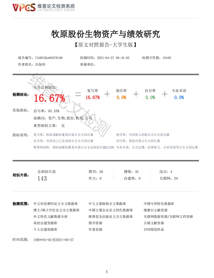 维普论文检测系统/IP PAPER CHECK SYSTEM牧原股份生物资产与绩效研究【原文对照报告-大学生版】报告编号:74d8fd3a66978190检测时间:2021-04-2706:34:03检测字符数:16160作者姓名:冯加铃所属单位:全文总相似比复写率他引率自引率专业术语检测结论:16.67%16.67%0.0%0.0%0.0%其他指标:自写率:83.33%高频词:资产,生物,股份,牧原,公司典型相似文章:无指标说明:复写率:相似或疑似重复内容占全文的比重他引率:引用他人的部分占全文的比重自引率:引用自己已发表部分占全文的比重自写率:原创内容占全文的比重典型相似性:相似或疑似重复内容占全文总相似比超过30%专业术语:公式定理、法律条文、行业用语等占全文的比重总相似片段期刊:65博硕:45综合:4相似片段:143外文:0自建库:0互联网:29检测范围:中文科技期刊论文全文数据库中文主要报纸全文数据库中国专利特色数据库博士/硕士学位论文全文数据库中国主要会议论文特色数据库港澳台文献资源外文特色文献数据全库维普优先出版论文全文数据库互联网数据资源/互联网文档资源高校自建资源库图书资源古籍文献资源个人自建资源库年鉴资源IPUB原创作品时间范围:1989-01-01至2021-04-27维普论文检测系统VIP PAPER CHECK SYSTEM原文对照颜色标注说明:■自写片段■复写片段(相似或疑似重复)■引用片段(引用)■专业术语(公式定理、法律条文、行业用语等)本科毕业论文牧原股份生物资产与绩效研究冯加铃201723280107指导教师董丽副教授学院名称经济管理学院专业名称会计学(ACCA方向)论文提交日期2021年4月27日论文答辩日期2021年4月29日摘要本文以牧原食品股份有限公司(以下简称牧原股份)作为案例公司,选取牧原股份2014-2019年作为案例研究的时间跨度,首先分析了公司的生物资产情况,然后分别用营业收入、净利润、日收盘价和经济附加值EVA来计量公司绩效,分析了牧原股份生物资产与绩效,试图发现其生物资产平均账面价值与绩效之间的关系。本文将牧原股份生物资产平均账面价值的变动情况与公司绩效的变动情况进行对比后发现,2014-2019年,牧原股份生产性生物资产平均账面价值、消耗性生物资产平均账面价值、生物资产合计平均账面价值与营业收入均保持持续增长。这说明牧原股份生物资产平均账面价值与营业收入同方向增长。同时,2014-2019年,牧原股份消耗性生物资产平均账面价值仅占营业成本的25.6%41.6%,这说明牧原股份能用较少的消耗性生物资产创造出高额的营业收入,这主要得益于公司较高的存货周转率。牧原股份年报披露前一交易日的日收盘价均高于年报披露后一交易日的日收盘价,表明生物资产平均账面价值增长的信息与提升投资者信心具有一定相关性。本文没有发现生物资产平均账面价值与经济附加值EVA之间的关系。2维普论文检测系统VIP PAPER CHECK SYSTEM为了更好地体现出牧原股份生物资产与公司绩效的关系,实现公司的持续发展,本文提出以下建议:第一,合理增加生物资产的投入,促进营业收入的增长:第二,适度提高存货周转率,降低生猪存栏量:第三,适度多元化,抵抗生猪价格波动风险:第四,不断完善和增强疫病防控管理体系,抵御非洲猪瘟的风险。关键词:牧原股份生物资产公司绩效The Impact of Muyuan Foods Co.,Ltd.'s Biological Assets on Company PerformanceFeng Jialing(College of Economics and Management,South China Agricultural University,Guangzhou 510642,China)Abstract:This paper takes Muyuan Foods Co.,Ltd.(hereinafter referred to as Muyuan)as the case company,and selects 2014 to 2019 as the time span of the case study.First,this paper analyzes the company's biological assets,and then uses operating revenue,net profit,the daily closing price and EVA(Economic Value Added)to measure the company's performance,and then analyzes the biologicalassets and company performance of Muyuan,and tries to find the relationship between the averagebook value of its biological assets and company performance.This article compares the changes in the average book value of Muyuan's biological assets withthe changes in the company performance and finds that from 2014 to 2019,the average book value ofMuyuan's productive biological assets,the average book value of consumptive biological assets,theaverage book value of total biological assets and operating revenue maintain continuous growth,which shows that the average book value of Muyuan's biological assets grows in the same direction asits operating revenue.At the same time,from 2014 to 2019,the average book value of theconsumptive biological assets of Muyuan only accounts for 25.6%-41.6%of the operating costs,whichshows that Muyuan can create high operating revenue with less consumptive biological assets.This ismainly due to the company's high inventory turnover.The daily closing price of the trading day before the disclosure of the annual report of Muyuanis higher than the daily closing price of the trading day after the disclosure of the annual report,indicating that the information on the growth of the average book value of biological assets has acertain correlation with increasing investor confidence.This article does not find the relationshipbetween the average book value of biological assets and EVA.In order to better reflect the relationship between Muyuan's biological assets and company'sperformance,and to realize the company's sustainable development,this article puts forward thefollowing suggestions:First,reasonably increase the input of biological assets to promote thegrowth of operating revenue;second,moderately increase the inventory turnover and reduce thenumber of live pigs;third,appropriat