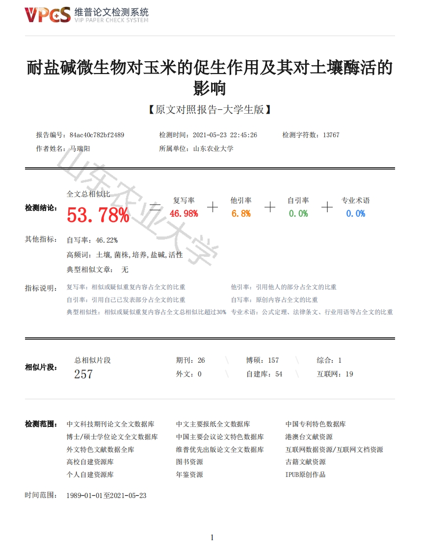 维普论文检测系统/IP PAPER CHECK SYSTEM耐盐碱微生物对玉米的促生作用及其对土壤酶活的影响【原文对照报告-大学生版】报告编号:84ac40c782bf2489检测时间:2021-05-2322:45:26检测字符数:13767作者姓名:马瑞阳所属单位:山东农业大学全文总相似比复写率他引率自引率专业术语检测结论:53.78%46.98%6.8%0.0%0.0%其他指标:自写率:46.22%高频词:土壤,菌株,培养,盐碱,活性典型相似文章:无指标说明:复写率:相似或疑似重复内容占全文的比重他引率:引用他人的部分占全文的比重自引率:引用自己已发表部分占全文的比重自写率:原创内容占全文的比重典型相似性:相似或疑似重复内容占全文总相似比超过30%专业术语:公式定理、法律条文、行业用语等占全文的比重总相似片段期刊:26博硕:157综合:1相似片段:257外文:0自建库:54互联网:19检测范围:中文科技期刊论文全文数据库中文主要报纸全文数据库中国专利特色数据库博士/硕士学位论文全文数据库中国主要会议论文特色数据库港澳台文献资源外文特色文献数据全库维普优先出版论文全文数据库互联网数据资源/互联网文档资源高校自建资源库图书资源古籍文献资源个人自建资源库年鉴资源IPUB原创作品时间范围:1989-01-01至2021-05-23维普论文检测系统VIP PAPER CHECK SYSTEM原文对照颜色标注说明:■自写片段■复写片段(相似或疑似重复)口引用片段(引用)■专业术语(公式定理、法律条文、行业用语等)1.前言1.1盐碱地概况土壤是一个国家农业发展的重要资源[1],是人类生存所必须。现如今,世界人口正在增加,预计2050年将达到89亿人[2],耕地资源面临着严重的挑战,再加上人类不合理的利用和开发,土地资源将面对各种各样潜在的巨大威胁。土地盐碱化已经成为其中一个较为严重的问题,不仅影响农耕用地的面积,而且对农作物各个阶段的生长均有影响,从种子萌发到作物成熟,盐碱均会造成不同成度的损伤。1.1.1盐碱地特征盐碱地是盐类积累的一个种类,是指土壤中的盐含量对作物正常生长的影响。土壤的盐碱化是因为土壤中含有大量的可溶性盐,有两个主要原因:一是初生盐渍化,二是次生盐渍化。初生盐渍化的成因是大自然自主形成的[3],主要原因是由于泥土中可溶性的盐在水冲、风吹以及自然地沉积等长期作用下造成的海盐沉积[4]。而在目前,土壤次生盐渍化的主要原因是灌溉不合理等不合理的利用。盐碱土壤被水淹后,碱性过大,导致土壤腐殖质流失,土壤结构遭到破坏。当土壤潮湿、有粘性、干燥坚硬时,土壤表面往往会出现白色盐分沉积,通气、透水性下降,植物就会枯萎、中毒,根就会腐烂、死亡。1.1.2我国盐碱地分布概况土地盐碱化是一个全球性问题,世界约有五分之一的灌溉土地受到土壤盐碱化的危害[5]。根据世界粮农组织统计,我国的盐碱地面积占世界总盐碱地面积的十分之一[6],是受盐碱迫害最为严重的国家之一。且世界盐碱地的面积由于人类的不恰当行为仍在持续扩大,预计到本世纪中叶世界上受盐碱影响的耕地面积可达全球耕地面积的一半以上[7]。在我国,具有农业发展潜力的盐碱地面积达2亿亩,但是被开发利用的只有20%左右,剩余的都没有得到合理的开发使用[8]。盐碱地的合理开发利用对于解决我国粮食问题至关重要。盐碱地在我国各个地区均有不同程度的分布。主要分布在西北干旱半干旱地区,东部黄淮海半干旱、半湿润地区,东部农业较为发达的平原及地势较低的半干旱、半湿润地区等[9]。1.1.3盐碱地的治理措施随着经济的发展和人类社会活动的进步,开发盐碱地资源也越来越受到人类的关注,对盐碱地进行合理的改良利用,可以改善人类生存环境,扩大粮食生产,丰富植物的种类和数量,维持生态平衡,促进地区经济、社会、生态的可持续发展。为了克服碱性土壤贫瘠、盐含量高、碱度高、物理结构弱、地表植物不足的缺点[10],采取了改善碱性土壤的措施,具体可以分为三种:物理改良措施、化学改良措施、生物改良措施[11]。物理改良措施主要是在碱性土壤中改变盐分和水分的分布,改变碱性土壤的物理结构,确保植物的正常生长。物理改良措施具体可以分为水利工程措施和物理措施两种[12]。水利工程措施就是“灌水洗盐”,土壤盐渍可以随水深入土壤,降低表层土壤的盐含量[13]。物理措施主要有平整土地、添加覆盖物、添加土壤改良剂等措施。通常盐碱地中的盐分分布受到地形的影响,盐分一般倾向于地势较高的地区,有的甚至会呈现斑块状的盐碱化,这种地区盐碱分布差异显著,通过平整土地,可以使该地区脱盐均匀,提升洗盐的效果,避免盐分洗脱不均导致部分地区2维普论文检测系统VIP PAPER CHECK SYSTEM盐分聚积[14]。化学措施是通过酸碱中和原理提高土壤性质的一种化学改良剂,可以降低土壤的酸度和盐含量,碱性土壤修理,有促进植物生长效果[15]。常见的化学改良剂有石膏、脱硫石膏、硫酸铝、硫磺、硫酸亚铁、泥碳、醋渣和高分子化合物等。生物措施是利用生物材料改良碱性地,是最有效的生态措施,有稳定、持续的脱盐效果,土壤结构增加土壤渗透性,增加土壤有机质和土壤肥沃度,有利于维持水土和生态平衡[16]。生物改良措施分为植物改良措施和微生物改良措施两种。植物改良措施成本低,适用范围广,具有较高的经济效益和环境效益。微生物种类繁多,它们的足迹可以遍布土壤的各个角落,土壤