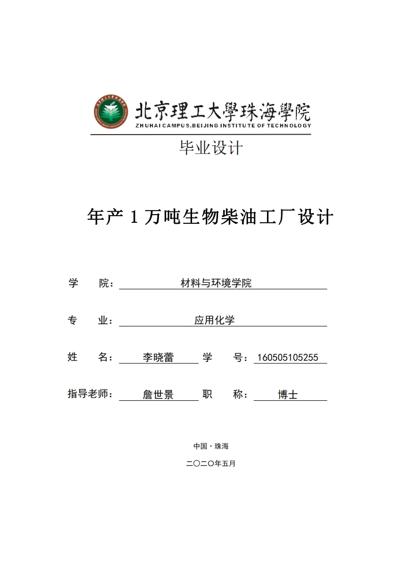 北京理工大學珠海學院ZHUHAICAMPUS.BEIJING INSTITUTE OF TECHNOLOGY毕业设计年产1万吨生物柴油工厂设计学院:材料与环境学院专业:应用化学姓名:李晓蕾学号:160505105255指导老师:詹世景职称:博士中国·珠海北京理工大学珠海学院2020届本科生毕业设计诚信承诺书本人郑重承诺:本人承诺呈交的毕业论文《年产1万吨生物柴油工厂设计》是在指导教师的指导下,独立开展研究取得的成果,文中引用他人的观点和材料,均在文后按顺序列出其参考文献,设计使用的数据真实可靠。本人签名:日期:年月日北京理工大学珠海学院2020届本科生毕业设计年产1万吨生物柴油工厂设计摘要生物柴油是一种相比普通柴油更绿色环保,更清洁且对环境更友好的一种可再生能源,对解决近年来日益严重的能源枯竭问题具有十分重要的作用。本论文设计的生物柴油生产是基于化工基础知识,利用互联网上的资料进行对比,还和有关厂家取得联系并与指导老师进行讨论,最后做出了年产1万吨生物柴油工厂设计的相关生产设计。本论文设计利用回收的动植物油作为原料,采用前处理废油精炼、预酯化、醇解酯化、离心分离等一系列操作生产,最后对生物柴油产品性能进行检测。此外本论文设计醇解酯化操作选用DYD催化剂提高生产效率及产量,并且对醇解酯化、分离操作的反应釜及储罐进行计算选取最合适的数值,最后采用废气处理设备和紫外光除臭等设备进行三废处理,最终得出采取10批生产反应釜进行同时生产来达到生产产量要求。本设计降低了生产成本,提高了生产效率,最终得出了品质合格的生物柴油产品。关键词:回收的动植物油:DYD催化剂;醇解酯化