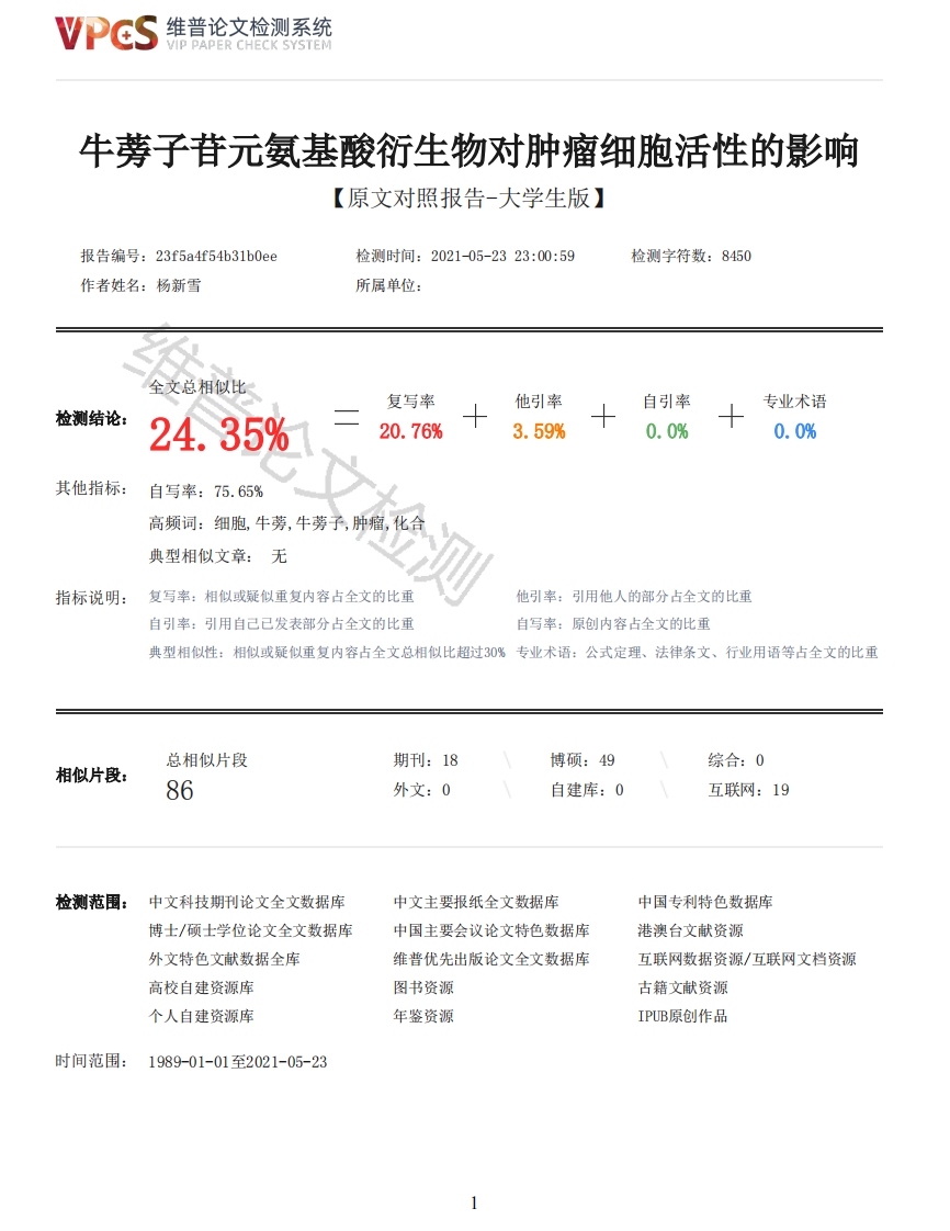 维普论文检测系统VIP PAPER CHECK SYSTEM牛蒡子苷元氨基酸衍生物对肿瘤细胞活性的影响【原文对照报告-大学生版】报告编号:23f5a4f54b31b0ee检测时间:2021-05-2323:00:59检测字符数:8450作者姓名:杨新雪所属单位:全文总相似比复写率他引率自引率专业术语检测结论:24.35%20.76%3.59%0.0%0.0%其他指标:自写率:75.65%高频词:细胞,牛蒡,牛蒡子,肿瘤,化合典型相似文章:无指标说明:复写率:相似或疑似重复内容占全文的比重他引率:引用他人的部分占全文的比重自引率:引用自己已发表部分占全文的比重自写率:原创内容占全文的比重典型相似性:相似或疑似重复内容占全文总相似比超过30%专业术语:公式定理、法律条文、行业用语等占全文的比重总相似片段期刊:18博硕:49综合:0相似片段:86外文:0自建库:0互联网:19检测范围:中文科技期刊论文全文数据库中文主要报纸全文数据库中国专利特色数据库博士/硕士学位论文全文数据库中国主要会议论文特色数据库港澳台文献资源外文特色文献数据全库维普优先出版论文全文数据库互联网数据资源/互联网文档资源高校自建资源库图书资源古籍文献资源个人自建资源库年鉴资源IPUB原创作品时间范围:1989-01-01至2021-05-23维普论文检测系统VIP PAPER CHECK SYSTEM原文对照颜色标注说明:■自写片段■复写片段(相似或疑似重复)口引用片段(引用)■专业术语(公式定理、法律条文、行业用语等)牛蒡子苷元氨基酸衍生物对肿瘤细胞活性的影响姓名:杨新雪专业:中药学指导教师:蔡恩博摘要:目的:研究讨论牛蒡子苷元氨基酸酯衍生物对肿瘤细胞活性的影响。方法:采用CCK-8检测法对牛蒡子苷元氨基酸酯衍生物进行人前列腺癌细胞PC-3M、人乳腺癌细胞MCF-7、人非小细胞肺癌细胞A549、人肝癌细胞HepG2、人血管瘤内皮细胞HemECs.五种肿瘤细胞的活性筛选,并按照相应的公式计算IC50值,绘制出直方图。采用流式细胞术检测细胞分布周期和细胞凋亡。此外,运用DPI(4,6-二脒基-2-苯基吲哚)染色法对PC-3M细胞进行染色,在荧光显微镜下观察细胞核的形态变化。结果:牛蒡子苷元氨基酸酯衍生物对肿瘤细胞增殖均有不同程度的抑制作用:与空白组相比,牛蒡子苷元BoC-L-缬氨酸酯能够阻滞P℃-3M细胞于GO/G1期并且能够诱导P℃-3M细胞凋亡,高剂量组更为明显。结论:牛蒡子苷元氨基酸酯衍生物对五种肿瘤细胞增殖具有一定的抑制作用,其中牛蒡子苷元B0C一L~缬氨酸酯作用效果较佳,可能与影响细胞周期、细胞凋亡有关。关键词:牛蒡子苷元缬氨酸酯:增殖:调亡:细胞周期:肿瘤活性Effect of Arctium lappa Amino Acid Derivatives on the Activity of Tumor CellsName:Yang XinxueMajor:Traditional Chinese MedicineTutor:Cai EnboAbstract:Objective:to study the effect of Arctigenin Amino acid ester derivatives on theactivity of tumor cells.Methods:CCK-8 method was used to screen the activities of Arctigenin Aminoacid ester derivatives in human prostate cancer cell Pc-3m,human breast cancer cell MCF-7,humannon-small-cell Lung Carcinoma Cell A549,human liver cancer cell HEPG2 and Human Hemangiomaendothelial cell HemECs,the IC50 value is calculated according to the corresponding formula and thehistogram is drawn.The cell distribution cycle and apoptosis were measured by Flow cytometry.Inaddition,the PC-3M cells were stained by DAPI (4',6-diamino-2-phenyl Indole)staining,and themorphological changes of PC-3M nuclei were observed under Fluorescence microscope.Results:Arctigenin Amino acid ester derivatives inhibited the proliferation of tumor cells in differentdegrees,compared with blank group,Arctigenin Boc-L-valine could block PC-3M cells in g 0/g 1 phaseand induce apoptosis of PC-3M cells,especially in high dose group.Conclusion:the Amino acid esterderivatives of Arctigenin can inhibit the proliferation of five kinds of tumor cells to some extent,and the effect of Arctigenin Boc-L-valine Ester is better,which may be related to cell cycle andapoptosis.Keywords:Arctigenin-Valine:Proliation:Apoptosis:Cell cycle:Tumor activity2维普论文检测系统VIP PAPER CHECK SYSTEM1前言1.1肿瘤概况肿瘤,是我们生活中经常提到的一种疾病,临床上可以定义为,由于原发组织中局部细胞的生长,不能正常调节,在多种肿瘤因子的作用下形成的一种新的有机体。之所以可以称之为肿瘤,是因为这种新生物在大多数的情况下表现为站立块突起。近年来,在各种因素的影响下,我国恶性肿瘤患者的数量与日俱增。恶性肿瘤对我们构成了很大的威胁,其中包括生命安全、健康安全和财产安全。恶性肿瘤也因此成为了医学上的难题,根据世界卫生组织最新公布的数据,全球2021年癌患人数已经达到了两千万人左右,致死率达到了60%[1]。肿瘤严重的威胁着我们健康和生命,那么寻找到有效的抗癌药物以及方法也是世界医疗的一项重要任务。我国传统中药是一种预防疾病的有力武器,尤其在今年的新冠肺炎疫情中,中医药全程起效,能够提高治愈率,降低病死率,缓解临床症状,减少并发症等等,恢复期中西医结合并配合化疗,彰显了中药的独特优势和作用,许多研究工作也从不同方面揭示了各种中药的抗肿瘤,抗病毒和免疫增强作用[2]。1.2常见的恶性肿瘤前列腺癌,男性泌尿系统最常见的恶性肿瘤之一。传统上,激素失衡、家族遗传、饮食和营养、年龄、地域等是前列腺癌发生的普遍原因。据报道,在2021年的美国癌症协会对癌症患者的调查研究中,男性患癌病例中最多的就是前列腺癌,大多数人为此也失去了生命。同样在我国,患有前列腺癌的男性也不在少数。随着我国