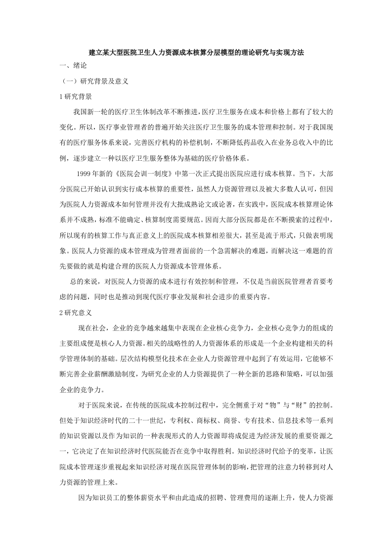 建立某大型医院卫生人力资源成本核算分层模型的理论研究与实现方法一、绪论(一)研究背景及意义1研究背景我国新一轮的医疗卫生体制改革不断推进,医疗卫生服务在成本和价格上都有了较大的变化。所以,医疗事业管理者的普遍开始关注医疗卫生服务的成本管理和控制。对于我国现有的医疗服务体系来说,完善医疗机构的补偿机制,不断降低药品收入在业务总收入中的比例,逐步建立一种以医疗卫生服务整体为基础的医疗价格体系。1999年新的《医院会训一制度》中第一次正式提出医院应进行成本核算。当下,大部分医院己开始认识到实行成本核算的重要性,虽然人力资源管理以及被大多数人认可,但因为医院人力资源成本如何管理并没有大批成熟论文或论著,在实践中,医院成本核算理论体系并不成熟,标准不能确定、核算制度需要规范。因而大部分医院都是在不断摸索的过程中,所以现有的核算工作与真正意义上的医院成本核算相差很大,甚至是流于形式,只做表明现象。医院人力资源的成本管理成为管理者面前的一个急需解决的难题,而解决这一难题的首先要做的就是构建合理的医院人力资源成本管理体系。总的来说,对医院人力资源的成本进行有效控制和管理,不仅是当前医院管理者首要考虑的问题,同时也是推动到现代医疗事业发展和社会进步的重要内容。2研究意义现在社会,企业的竞争越来越集中表现在企业核心竞争力,企业核心竞争力的组成的主要组成便是核心人力资源。相关的战略性的人力资源体系的形成是一个企业构建相关的科学管理体制的基础。层次结构模型化技术在企业人力资源管理中起到了有效运用,它能够不断完善企业薪酬激励制度,为研究企业的人力资源提供了一种全新的思路和策略,可以加强企业的竞争力。对于医院来说,在传统的医院成本控制过程中,完全侧重于对“物”与“财”的控制。但处于知识经济时代的二十一世纪,专利权、商标权、商誉、专有技术、信息技术等一系列的知识资源以及作为知识的一种表现形式的人力资源即将成促进为经济发展的重要资源之一,它决定了在知识经济时代医院能否在竞争中取得胜利。知识经济时代给予的变革,让医院成本管理逐步重视起来知识经济对现在医院管理体制的影响,把管理的注意力转移到对人力资源的管理上来。因为知识员工的整体薪资水平和由此造成的招聘、管理费用的逐渐上升,使人力资源成本逐步上升,这些对医院的整体运营造成诸多影响。医院的人员队伍越庞大,其人力资源成本越多,有许多医院的直接人力资源成本都超过了1个亿。对此,现代医院有效控制人力资源成本,不仅能够节约费用、降低成本,还能够增强医院市场竞争、扩大市场范围,为医院的长期发展带来无限多的经济效益。所以说是否有效地控制医院的人力资源成本,决定了医院能否继续生存下去。(二)国内外研究状态1国外研究现状现代西方人力资本理论兴起于二十世纪五六十年代,通常来说,现在都以舒尔茨在1960年美国经济学会上的名为“人力资本投资”的演讲作为现代人力资本理论产生的标志,同时也是人力资本概念被正式纳入主流经济学的标志。主要理论有西奥多·舒尔茨的人力资本理论、明赛尔对人力资本理论的贡献、贝克尔的人力资本理论等对于分层研究来说,国外大部分从价值性、独特性、责任承担和工作性质等一些角度进行。工作任务与职责不同,美国学者斯芬·P·罗宾斯将企业的人力资源分为管理者与操作者,同时垂直方向上将管理者分为高、中和基层,也叫做战略层、管理层、技术操作层。也有学者将企业人力资源划分为战略高层、直线中层、工作核心层、技术专家和辅助人员。与此同时,也有人提出按工作能力进行分层,像工程技术类的分层:高级工程师、工程师和助理工程师。2国内研究现状自80年代以后,我国才开始介绍研究人力资源成本会计。1986年陈仁栋翻译弗兰霍尔的《人力资源会计》一书中,第一次系统地介绍了人力资源成本会计的内容。此后,报刊上的相关文章逐渐增多,人力资源成本成为了中国会计学会“七五科研规划”和《会计研究》的主要课题,有关词条也开始出现在了会计词典中。到了90年代以后,人力资源成本不单单是介绍也开始转向研究,相关文章逐渐发表在《会计研究》等重要杂志上。1999年5月8日到9日,中国会计学会在首都经济大学举办了第一届“人力资源会计理论与方法”专题研讨会。这次研讨会对今后人力资源成本会计的研究将起到相当大的推动作用。各国人力资源管理理论研究和实践工作不断深入和发展,人们纷纷明白一定要对各项人力资源活动进行精确的计量核算,才能对工作的经济结果还有实际工作效率做出相应的评价,才能提高人力资源活动的效率,让它在我国的经济发展和企业生产经营中发挥作用。(三)研究思路及方法1研究目标研究建立医院卫生人力资源成本核算分层模型的理论与实现方法研究建立医院卫生人力资源成本核算智能化分析数学模型2.研究思路本文分为五部分。其中:第一部分简要地介绍了企业人力资源成本核算问题所涉及的基本概念,包括人力资源成本的定义、范围、分类及具体内容等,阐明了企业人力资源成本管理的内涵及特点:并集中介绍了医院人力资源成本核算分层模型的概念:第二部分阐述了