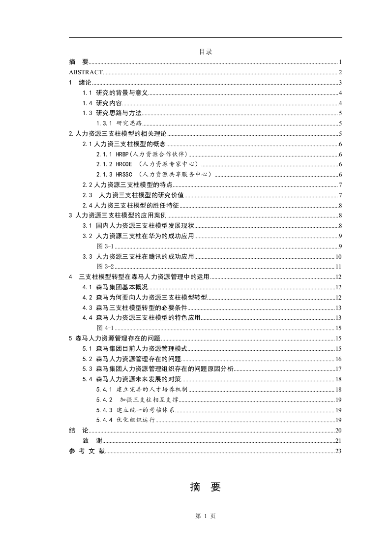 目录摘要…ABSTRACT.…21绪论31.1研究的背景与意义...................1.4研究内容.41.3研究思路与方法…51.3.1研究思路.52.人力资源三支柱模型的相关理论…2.1人力资三支柱模型的概念…62.1.1HRBP(人力资源合作伙伴)2.1.2HRC0E(人力资源专家中心)62.1.3 HRSSC(人力资源共享服务中心)2.2人力资源三支柱模型的特点.…72.3人力资三支柱模型的研究价值2.4人力资三支柱模型的胜任特征83人力资源三支柱模型的应用案例…83.1国内人力资源三支柱模型发展现状…83.2人力资源三支柱在华为的成功应用…993.3人力资源三支柱在腾讯的成功应用10图3-24三支柱模型转型在森马人力资源管理中的运用,..24.1森马集团基本概况.4.2森马为何要向人力资源三支柱模型转型4.3森马三支柱模型转型的必要条件…134.4森马人力资源三支柱模型的特色应用…55森马人力资源管理存在的问题…5.1森马集团目前人力资源管理模式155.2森马人力资源管理存在的问题…5.3森马集团人力资源管理组织存在的问题原因分析5.4森马人力资源未来发展的对策185.4.1建立完善的人才培养机制.5.4.2加强三支柱相互支撑5.4.3建立统一的考核体系…195.4.4优化组织运行….2023摘要第1页随着创新时代的到来、共享经济的发展、产业结构的不断改进,企业间的竞争日益激烈,受到外部环境因素的影响,传统的人力资源管理体系已经不能支撑其发展,改革创新迫在眉睫。为了符合其自身的发展特点,又能够满足时代发展的浪潮,企业只有变被动为主动,积极顺应这些变化去吸收新的模式和知识。企业纷纷引进人力资源三支柱模型,但是能够成功运行的企业少之又少。如何将人力资源三支柱模型在企业中成功的运行,这是众多学术研究的重点,更是本文研究的意义。本文通过对文献大量阅读的基础上,再将理论和实际相结合。首先是研究的背景和意义,在这大环境下再对基础理论研究,后面部分是对实际案例的探究分析,通过对国内标杆型企业成功运用的分析,来说明人力资源三支柱在不同企业会有其独特的发展模式。最后详细介绍了三支柱在森马中的应用。关键词:人力资源三支柱模型HRSSC HRCOE HRBP人力资源管理ABSTRACTWith the arrival of a new era,the development of a shared economy,continuous第2页improvement of industrial structure,the increasingly fierce competition betweenenterprises,affected by external environmental factors,the traditional human resourcemanagement system has been unable to support its development,reform andinnovation is imminent.In order to meet the development of its own characteristics,but also to meet the development of the times tide of enterprise the only change frompassive to active,actively adapt to these changes to absorb new patterns andknowledge.Human resources companies have introduced the three pillar model,but tothe successful operation of the enterprise less.How will the three pillar of humanresources in the enterprise operation model,this is a large number of academicresearch The key point is the significance of this studyBased on reading a lot of literature on the combination of theory and practice.The first is the background and significance of the research,in this environment andon the basis of theoretical research,the back part is on the analysis of actual cases,through the analysis of successful use of domestic benchmark enterprise,to illustratethe three pillars of human resources with its unique mode of development in differententerprises.Finally this paper describes the application of the three pillars in Semir.1绪论第3页