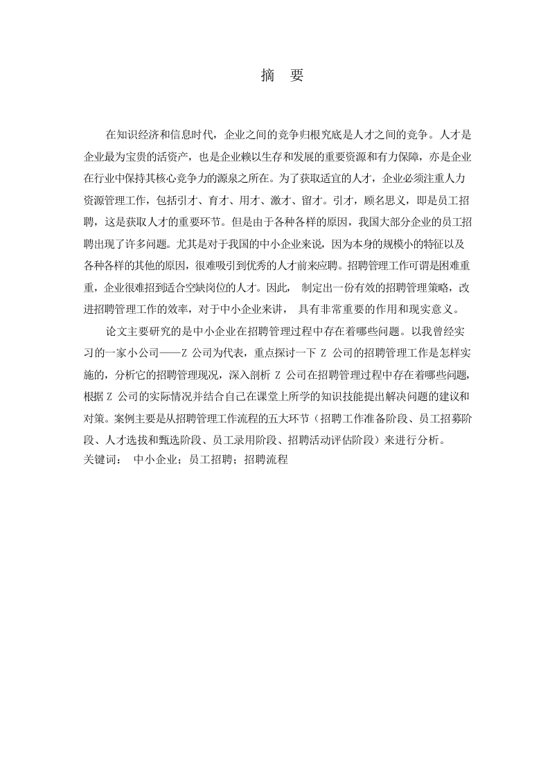 摘要在知识经济和信息时代,企业之间的竞争归根究底是人才之间的竞争。人才是企业最为宝贵的活资产,也是企业赖以生存和发展的重要资源和有力保障,亦是企业在行业中保持其核心竞争力的源泉之所在。为了获取适宜的人才,企业必须注重人力资源管理工作,包括引才、育才、用才、激才、留才。引才,顾名思义,即是员工招聘,这是获取人才的重要环节。但是由于各种各样的原因,我国大部分企业的员工招聘出现了许多问题。尤其是对于我国的中小企业来说,因为本身的规模小的特征以及各种各样的其他的原因,很难吸引到优秀的人才前来应聘。招聘管理工作可谓是困难重重,企业很难招到适合空缺岗位的人才。因此,制定出一份有效的招聘管理策略,改进招聘管理工作的效率,对于中小企业来讲,具有非常重要的作用和现实意义。论文主要研究的是中小企业在招聘管理过程中存在着哪些问题。以我曾经实习的一家小公司一Z公司为代表,重点探讨一下Z公司的招聘管理工作是怎样实施的,分析它的招聘管理现况,深入剖析Z公司在招聘管理过程中存在着哪些问题,根据Z公司的实际情况并结合自己在课堂上所学的知识技能提出解决问题的建议和对策。案例主要是从招聘管理工作流程的五大环节(招聘工作准备阶段、员工招募阶段、人才选拔和甄选阶段、员工录用阶段、招聘活动评估阶段)来进行分析。关键词:中小企业:员工招聘:招聘流程ABSTRACTIn this knowledge-economy and information oriented era,the keyelement of the competition among the companies is finally attributed tothe competition of talents.Talent is the most valuable living assets ofenterprises,which is not only an important resource and effectivesafeguard for the enterprises to survive and develop in the market,but alsoacts as the source of keeping core competitiveness in the industry.In orderto obtain the appropriate talent,enterprises must pay more attention tohuman resources management in attracting,training,using,encouragingand preserving talents.Attracting talents,as the name suggests,is the staffrecruitment,which is an important link of talent acquisition.However,due to various reasons,there are a lot of problems with the staffrecruitment of most enterprises in our country.Especially for the smalland medium-sized enterprises of our country,because of its small size ofthe feature and a variety of other reasons,it is difficult to attract the besttalents to come to apply for.Recruitment management is beset withdifficulties,and it is difficult for companies to recruit suitable talentsfor the available jobs.Therefore,it isof great importance and practicalsignificance for the small and medium-sized enterprises to formulate aneffective recruitment management strategy and improve the efficiency ofrecruitment management.This paper mainly studies the problems that exist in the process ofrecruitment management in the small and medium-sized enterprises.Withregarding a small company -Z company I used to practice as arepresentative,we will focus the discussion on how to implement itsrecruitment management work,and analyze its recruitment managementpresent situation and deeply dissect Z company,what problems exist in theprocess of recruitment management,even puts forward some suggestionsand countermeasures to solve the problems according to the actual situationof Z company and combining the knowledge and skills I learned in class.The case mainly analyzes the five links of recruitment managementworkflow (Recruitment preparation phase,Personnel recruitment phase,Personnel selection phase,Employee recruitment phase,Recruitmentactivity evaluation phase).Key words:Small and medium-sized enterprises;Staff recruitment;Recruitmentprocess