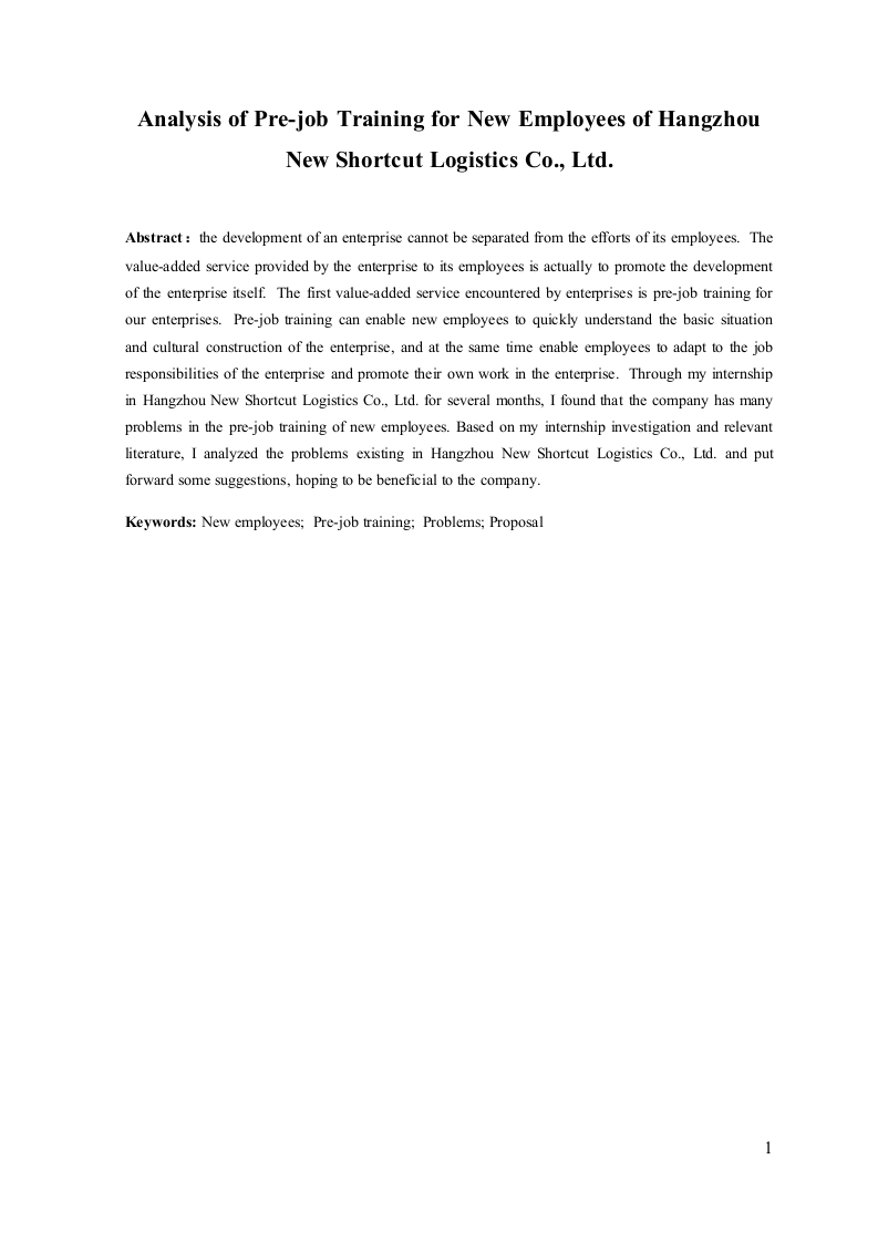 Analysis of Pre-job Training for New Employees of HangzhouNew Shortcut Logistics Co.,Ltd.Abstract:the development of an enterprise cannot be separated from the efforts of its employees.Thevalue-added service provided by the enterprise to its employees is actually to promote the developmentof the enterprise itself.The first value-added service encountered by enterprises is pre-job training forour enterprises.Pre-job training can enable new employees to quickly understand the basic situationand cultural construction of the enterprise,and at the same time enable employees to adapt to the jobresponsibilities of the enterprise and promote their own work in the enterprise.Through my internshipin Hangzhou New Shortcut Logistics Co.,Ltd.for several months,I found that the company has manyproblems in the pre-job training of new employees.Based on my internship investigation and relevantliterature,I analyzed the problems existing in Hangzhou New Shortcut Logistics Co.,Ltd.and putforward some suggestions,hoping to be beneficial to the company.Keywords:New employees;Pre-job training;Problems;Proposal1目录71.1研究背景及意义71.1.1课题背景71.1.2课题意义....1.3研究方法及技术路线...1.3.1研究方法....1.3.2技术路线.…8102.2国内外岗前培训研究概述...·.102.2.1国外关于培训的研究概述...102.2.2国内关于培训的研究概述....12133.1.1公司简介.13133.2.2满意度调查结果分析.......3.3存在问题分析.·..143.3.1缺乏合理的岗前培训战略计划...153.3.2缺乏针对性的岗前培训内容....153.3.3缺乏有效的岗前培训评估体系..15第四部分杭州新捷径物流有限公司岗前培训改进措施·164.1制定合理的岗前培训安排计划......1624.1.1立足于新员工岗位特性的培训场地及时间安排计划.......16164.3建立有效的反馈评估体系.1718参考文献…1920附录1:新员工岗前培训满意度调查...21附录2:杭州新捷径现阶段岗前培训内容.·.·