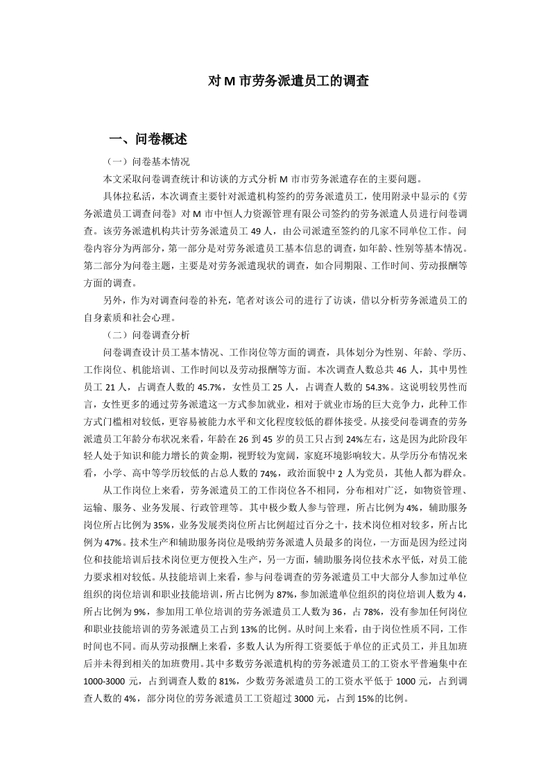 对M市劳务派遣员工的调查一、问卷概述(一)问卷基本情况本文采取问卷调查统计和访谈的方式分析M市市劳务派遣存在的主要问题。具体拉私活,本次调查主要针对派造机构签约的劳务派遣员工,使用附录中显示的《劳务派造员工调查问卷》对M市中恒人力资源管理有限公司签约的劳务派遣人员进行问卷调查。该劳务派造机构共计劳务派造员工49人,由公司派遣至签约的几家不同单位工作。问卷内容分为两部分,第一部分是对劳务派造员工基本信息的调查,如年龄、性别等基本情况。第二部分为问卷主题,主要是对劳务派遣现状的调查,如合同期限、工作时间、劳动报酬等方面的调查。另外,作为对调查问卷的补充,笔者对该公司的进行了访谈,借以分析劳务派遣员工的自身素质和社会心理。(二)问卷调查分析问卷调查设计员工基本情况、工作岗位等方面的调查,具体划分为性别、年龄、学历、工作岗位、机能培训、工作时间以及劳动报酬等方面。本次调查人数总共46人,其中男性员工21人,占调查人数的45.7%,女性员工25人,占调查人数的54.3%。这说明较男性而言,女性更多的通过劳务派遣这一方式参加就业,相对于就业市场的巨大竞争力,此种工作方式门槛相对较低,更容易被能力水平和文化程度较低的群体接受。从接受问卷调查的劳务派遣员工年龄分布状况来看,年龄在26到45岁的员工只占到24%左右,这是因为此阶段年轻人处于知识和能力增长的黄金期,视野较为宽阔,家庭环境影响较大。从学历分布情况来看,小学、高中等学历较低的占总人数的74%,政治面貌中2人为党员,其他人都为群众。从工作岗位上来看,劳务派造员工的工作岗位各不相同,分布相对广泛,如物资管理、运输、服务、业务发展、行政管理等。其中极少数人参与管理,所占比例为4%,辅助服务岗位所占比例为35%,业务发展类岗位所占比例超过百分之十,技术岗位相对较多,所占比例为47%。技术生产和辅助服务岗位是吸纳劳务派遣人员最多的岗位,一方面是因为经过岗位和技能培训后技术岗位更方便投入生产,另一方面,辅助服务岗位技术水平低,对员工能力要求相对较低。从技能培训川上来看,参与问卷调查的劳务派造员工中大部分人参加过单位组织的岗位培训和职业技能培训,所占比例为87%,参加派遣单位组织的岗位培训人数为4,所占比例为9%,参加用工单位培训的劳务派遣员工人数为36,占78%,没有参加任何岗位和职业技能培训的劳务派造员工占到13%的比例。从时间上来看,由于岗位性质不同,工作时间也不同。而从劳动报酬上来看,多数人认为所得工资要低于单位的正式员工,并且加班后并未得到相关的加班费用。其中多数劳务派遣机构的劳务派遣员工的工资水平普遍集中在1000-3000元,占到调查人数的81%,少数劳务派遣员工的工资水平低于1000元,占到调查人数的4%,部分岗位的劳务派遣员工工资超过3000元,占到15%的比例。(三)访谈结果分析访谈中主要针对劳务派遣这种用工模式,从劳务派遣员工从自身角度出发,评价劳务派遣的用工模式,并提出这种用工模式的优缺点。大多数受访人表示,劳务派遣在一定程度上增加了他们就业的机会,但在方便就业的同时,自身权益无法保障。特别是劳动时间和劳动报酬及福利上无法保障。此外,在访谈过程中,笔者发现劳务派造员工本身法律意识和出现劳务纠纷问题后维权意识相对淡薄,对派造单位基本没有归属感,工作责任意识较低。劳务派遣员工中大部分人不清楚都有哪些具体权益,在自身利益受到损害后清楚权益维护的具体流程。本章以M市中恒人力资源管理有限公司为具体的研究对象,通过问卷调查和深度访谈,进一步了解了劳务派造人员群体的现状。结果显示,劳务派造人员在劳务派遣员工的年龄以刚步入成年人阶段的年轻人和有过失业经历的中年人为主,文化程度普遍偏低,多为高中及以下,个人能力和专业技能不高,接受的岗位和技能培训相对较少。他们对劳务派遣这种用工模式有肯定的一面,同时也承认自身权益在一定程度上受损,但却缺少维权意识。二、M市劳务派遣存在的问题(一)经营地位不明确在这个整个的劳动力应用过程中,起到中间主导作用的是劳务派遣公司,他实际起到的是一个中介作用,但是与中介也不完全相同,因为他需要对劳动力进行负责。也就是说,劳动力与这个公司签订一定的关系,在应用的时候,他们是作为这个公司派遣人员来进行工作,从事他们客户所需要的岗位工作,但是目前来说,对于这种派遣机构并没有明文规定他是属于何种性质,如果认为它只是一个中介机构实际上是错误的,因为它并不符合中介机构的性质,法律上缺乏明文规定使得经营中缺乏相应的规范,如果他们进行的活动出现问题,但是缺乏相关的法律进行约束,这也使得双方的权益不能够得以保障,对于劳动者的合法权利,没有法律给予保障,对于客户的合法权利,这种派遺公司也无法给予保障(二)经营资质缺乏严格审批这些机构是属于什么样的经营企业,目前来说法律上对他们并没有明确界定,既然这样他们归属于哪一个行业就没有办法确定,这次行业监督对于他们是无效的,许多监督部门无法对他们进行工作,这就导致出现了监督真空状态。另外对于审批方面也不能够确定,没有明确性质就无法知道哪一个部门可以给予审批,这样就会为具体的工作带来一系列麻烦,有可能