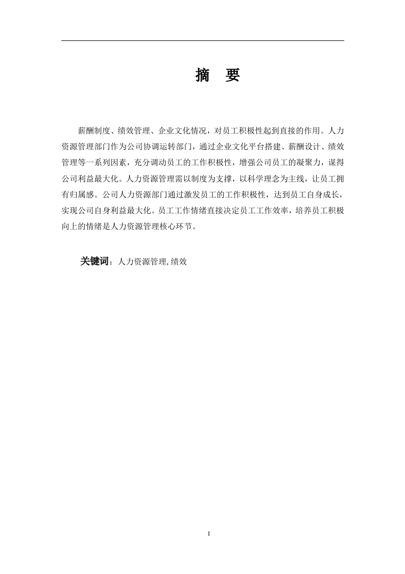 摘要薪酬制度、绩效管理、企业文化情况,对员工积极性起到直接的作用。人力资源管理部门作为公司协调运转部门,通过企业文化平台搭建、薪酬设计、绩效管理等一系列因素,充分调动员工的工作积极性,增强公司员工的凝聚力,谋得公司利益最大化。人力资源管理需以制度为支撑,以科学理念为主线,让员工拥有归属感。公司人力资源部门通过激发员工的工作积极性,达到员工自身成长,实现公司自身利益最大化。员工工作情绪直接决定员工工作效率,培养员工积极向上的情绪是人力资源管理核心环节。关键词:人力资源管理,绩效大丰新源果醋公司人力资源管理研究目录摘要第一章引言…1.1研究背景1.2研究目的1.3研究方法第二章人力资源管理理论概述32.1人力资源管理的含义32.2人力资源研究内容…32.3人力资源研究重要性…2.4人力资源管理的新发展.…3第三章大丰新源果醋公司简介53.1大丰新源果醋公司的历史沿革,53.2大丰新源果醋公司经营现状,5第四章大丰新源果醋公司人力资源管理存在的问题74.1绩效考核目标不明确4.2员工培训没有得到应有的重视.…74.3员工激励形式单一84.3.1平均主义.84.3.2奖励不公平84.3.3激励方法单一9第五章加强大丰新源果醋公司人力资源管理的对策建议…105.1明确绩效目标….105.1.1认识绩效的重要性105.1.2加强部门间的沟通105.2高度重视员工培训.5.3建立多种激励机制.115.3.1公平考核.5.3.2奖罚分明.125.5.3多种激励第六章结束语…参考书籍…大丰新源果醋公司人力资源管理研究第一章引言1.1研究背景全球的经济一体化发展速度有质的飞跃是在上世纪八十年代开始这种状况直接加剧了市场竞争。在这种形势的要求下,企业的绩效管理在企业的竞争中所发挥的作用越来越重要。绩效管理具有十分多的优点,诸如员工的工作态度、工作思路等都有一定程度的提高,并能刺激企业的激励机制,促进员工不断的发挥自己的作用,增进凝聚力,能够激发员工充分发挥出自己员工的潜能,在保证员工自身绩效的基础上,提升群体绩效。但是我国目前的企业中的绩效管理体系还不健全,实践中也有很多不足之处,这就不能有效的管理企业。因此,要想改变这一现状,就必须加强企业的绩效管理,并使其与企业的相关管理相适应,从而促进企业长远发展。本文的目的是分析研究大丰市新源企业内部的绩效管理的相关方面,剖析新源果醋在实施绩效管理中所面临的一些问题,并通过研究,找出对策。1.2研究目的一个部门或是组织人员的参与度,职员的培训和人员工作的积极性在很大程度上影响着部门和组织的发展。早在20世纪80年代,学术界和事业界就将目光转移到了人力资源的管理上。很多企业,也不惜出大价钱,专门请培训机构组织员工活动,为的是培养员工的工作热情和默契度:此外,给员工提供好的住宿条件使得员工的生活得以保障,工作积极性大大提高。假定,存在最佳的人力资源管理办法,组织的运行效率将得到最大优化。本文通过分析大丰市新源果醋企业人力资源管理存在的问题,指出企业人力资源管理普遍存在的问题,并提出了相应对策,从而能够为其他企业人力资源管理提供思路。