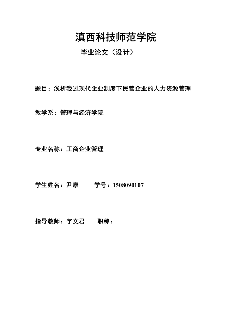 滇西科技师范学院毕业论文(设计)题目:浅析我过现代企业制度下民营企业的人力资源管理教学系:管理与经济学院专业名称:工商企业管理学生姓名:尹康学号:1508090107指导教师:字文君职称:dian浅析我国现代企业制度下民营企业的人力资源管理目录一.企业及企业制度概述(一)企业概述1.企业的定义2.企业分类.3.民营企业.…(二)现代企业制度概述1.现代企业制度的概念及构成2.现代企业制度的现状…二我国民营企业现状及人力资源管理困境分析(一)我国民营企业的现状3(二)民营企业人力资源管理困境分析31.人力资源管理及其现状.32.困境分析三.我国民营企业人力资源的管理的发展战略5(一)顺应企业发展潮流灵活运用现代企业人力资源管理,建立现在企业制度5(二)建立科学的合理的人力资源战略规划…(三)合理规划好人力资源的需求并做好人力准备6(四)运用科学有效的激励机制激发员工劳动积极性6(五)坚持以人为本的管理理念,促进企业与员工融为一体.7参考文献,