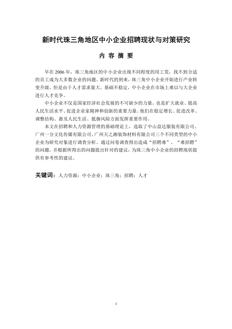 新时代珠三角地区中小企业招聘现状与对策研究内容摘要早在2006年,珠三角地区的中小企业出现不同程度的用工荒,找不到合适的员工成为大多数企业的问题。新时代的到来,珠三角中小企业开始进行产业转变升级,但是由于人才需求量大,基础不稳定,中小企业在市场上难以与大企业进行人才竞争。中小企业不仅是国家经济社会发展的不可缺少的力量,也是扩大就业、提高人民生活水平、促进企业家精神和创新的重要力量。他们在稳定增长、促进改革、调整结构、惠及人民生活、抵御风险方面发挥重要作用。本文在招聘和人力资源管理的基础理论上,选取了中山益达服装有限公司、广州一分文化传媒有限公司、广州天之湘装饰材料有限公司三个不同类型的中小企业为研究对象进行调查分析。通过问卷调查得出造成“招聘难”,“难招聘”的问题,并根据所得出的问题提出针对的建议,为珠三角中小企业的招聘现状提供有参考性的建议。关键词:人力资源;中小企业:珠三角:招聘:人才Research on the Current Situation and Countermeasures ofSME Recruitment in the Pearl River Delta in the New EraAbstractAs early as 2006,small and medium-sized enterprises in the Pearl River Delta regionexperienced varying degrees of labor shortage,and finding suitable employees became a problemfor most enterprises.With the arrival of the new era,small and medium-sized enterprises in thePearl River Delta have begun to undergo industrial transformation and upgrading.However,dueto the large demand for talents and unstable foundations,it is difficult for small and medium-sizedenterprises to compete with large enterprises in the market.Smes are not only an indispensable force for a country's economic and social development,but also an important force for expanding employment,improving people's living standards,andpromoting entrepreneurship and innovation.They have played an important role in stabilizinggrowth,promoting reform,adjusting the economic structure,benefiting the people's livelihood andfending off risks.Based on the basic theories of recruitment and human resource management,this paperselects three different types of small and medium-sized enterprises,namely Zhongshan Yidaclothing co.,LTD.,Guangzhou Yifen culture media co.,LTD.,and Guangzhou Tianzhixiangdecoration material co.,LTD.,as research objects for investigation and analysis.Through thequestionnaire survey,the problems that lead to "difficult recruitment"and "difficult recruitment"are obtained,and Suggestions are put forward according to the problems,so as to providereference Suggestions for the current recruitment situation of small and medium-sized enterprisesin the pearl river delta.Key words:Human Resources:Small and medium enterprises:Pearl River Delta:Recruitment:Talent目录内容摘要II一、绪论…112.研究目的及意义2.国内研究现状2(三)研究思路与方法。32.研究方法.…3二、相关概念和理论叙述3(一)人力资源的含义和作用41.人力资源的含义4(二)中小企业的人才特征.2.中小企业的人才流动比较频繁.·43.选择合适的人才是中小企业人力资源管理的关键4(三)中小企业人员招聘的相关理论45三、三家中小企业人才招聘现状分析…51中山益达服装有限公司.…553.广州天之湘装饰材料有限公司.…5(三)研究对象的员工招聘现状问题及原因分析…10102.招聘问题分析.…13四、珠三角中小企业员工招聘现状及影响因素·14141珠三角中小企业员工招聘计划制定现状…1414(二)珠三角中小企业员工招聘影响因素.·15
