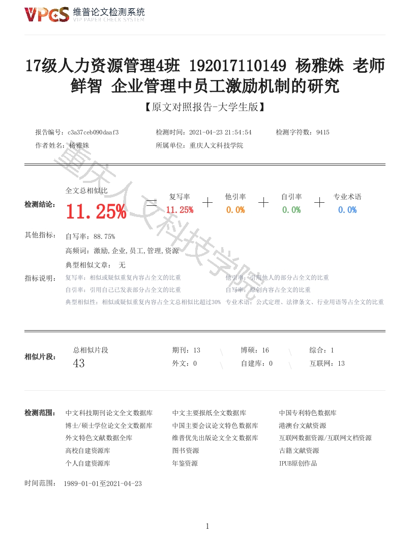 VPCS维普论文检测系统17级人力资源管理4班192017110149杨雅姝老师鲜智企业管理中员工激励机制的研究【原文对照报告-大学生版】报告编号:c3a37ceb090daaf3检测时间:2021-04-2321:54:54检测字符数:9415作者姓名:杨雅姝所属单位:重庆人文科技学院全文总相似比复写率他引率自引率专业术语检测结论:11.25%11.25%0.0%0.0%0.0%其他指标:自写率:88.75%高频词:激励,企业,员工,管理,资源典型相似文章:无指标说明:复写率:相似或疑似重复内容占全文的比重他引事:用他人的部分占全文的比重自引率:引用自己已发表部分占全文的比重自写率:原创内容占全文的比重典型相似性:相似或疑似重复内容占全文总相似比超过30%专业术语:公式定理、法律条文、行业用语等占全文的比重总相似片段期刊:13博硕:16综合:1相似片段:43外文:0自建库:0互联网:13检测范围:中文科技期刊论文全文数据库中文主要报纸全文数据库中国专利特色数据库博士/硕士学位论文全文数据库中国主要会议论文特色数据库港澳台文献资源外文特色文献数据全库维普优先出版论文全文数据库互联网数据资源/互联网文档资源高校自建资源库图书资源古籍文献资源个人自建资源库年鉴资源IPUB原创作品时间范围:198901-01至2021-04-23维普论文检测系统原文对照颜色标注说明:■自写片段■复写片段(相似或疑似重复)引用片段(引用)■专业术语(公式定理、法律条文、行业用语等)Chongqing College of Humanities,Science Technology毕业论文企业管理中员工激励问题的研究一一以A公司为例学院管理学院专业人力资源管理年级2017级学号192017110149姓名指导教师鲜智2021年3月6日企业管理中员工激励问题的研究一一以A公司为例摘要人力资源作为企业发展的关键因素已经成为现代企业的一种战略性资源,在越来越多的企业中变得越来越来重要。人力资源管理各个板块中,激励作为人力资源经常研究的重点问题之一,己经切实成为企业的核心研究问题。人力资源的有效性其直接与激励的效率息息相关。大部分企业有着很多不同的人力资源相关的问题,其中才人才外流现象对企业发展有着深远的具体的详尽的影响。如何有效的留住人才是关乎激励研究的重点课题之一。任何企业都是人的单位的组成,其中人才优势,人才质量,人才效率是决定企业成败的关键因素。因此,对于企业而言,企业的未来发展潜力来自于企业人才的贡献及努力,通过人力资源的有效指导形成企业有效的人才激励。由此可见,企业的人力资源管理核心就是以调动全体员工的积极性、主动性为目的的激励机制。关键词:企业:管理:激励:公司2维普论文检测系统THE STUDY ON THE INCENTIVE OF EMPLOYEES IN ENTERPRISE MANAGEMENT-Take Company A as an ExampleABSTRACTAs a key factor in the development of enterprises,human resources have become a strategicresource in modern enterprises and become more and more important in more and more enterprises.Inthe various sectors of human resource management,motivation,as one of the key issues often studiedby human resources,has actually become the core research issue of enterprises.The effectiveness ofhuman resources is directly related to the efficiency of incentives.Most enterprises have a lot ofdifferent human resources related problems,among which the phenomenon of brain drain has a profound,concrete and detailed impact on the development of enterprises.How to effectively retain talents isone of the key topics related to incentive research.Any enterprise is the composition of humanunits,among which talent advantage,talent quality and talent efficiency are the key factors todetermine the success or failure of an enterprise.Therefore,for the enterprise,the futuredevelopment potential of the enterprise comes from the contribution and efforts of the enterprisetalents,through the effective guidance of human resources to form the enterprise effective talentincentive.Thus it can be seen that the core of human resource management of an enterprise is anincentive mechanism aimed at arousing the enthusiasm and initiative of all employees.KEY WORDS:Enterprise,management,incentive,company目录引言11绪论21.1研究背景21.2研究意义21.3研究内容与思路方法21.3.1研究内容2科技学院1.3.2研究思路与方法22企业使用激励理论的原因32.1企业管理中为什么要引入激励32.1.1激励可以调动员工工作积极性,提高企业绩效32.1.2激励可以挖掘人的潜力,提高人力资源质量32.2激励是以员工需要为基础33A公司背景与现状53.1公司背景53.2主要功能53.3公司现状54A公司如何有效激励员工64.1引入合理的竞争机制64.2设立业绩排行榜64.3树立榜样及优秀经验的交流推广64.4科学的评价体系是激励有效性的保障65A公司员工激励机制中存在的问题75.1薪酬水平较低75.2薪酬结构不完善75.3绩效管理难度较大75.4近期激励问题案例76A公司激励机制问题的解决方案86.1底薪调活机制83