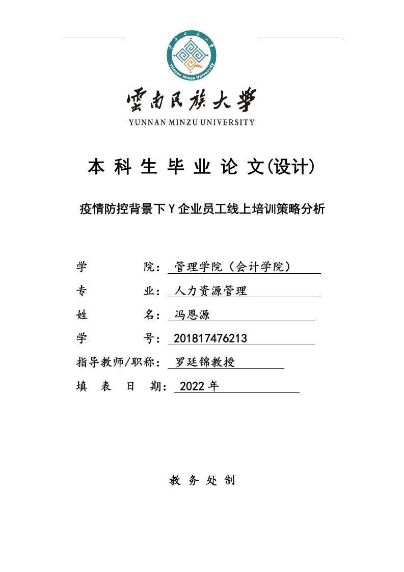 inzu UnYUNNAN MINZU UNIVERSITY本科生毕业论文(设计)疫情防控背景下Y企业员工线上培训策略分析学院:管理学院(会计学院)专业:人力资源管理姓名:冯恩源学号:201817476213指导教师/职称:罗廷锦教授填表日期:2022年教务处制云南民族大学本科毕业论文(设计)原创性声明本人郑重声明:所呈交的毕业论文(设计),是本人在指导教师的指导下进行研究工作所取得的成果。除论文中已经注明引用的内容外,本论文没有抄袭、剽窃他人已经发表的研究成果。本声明的法律结果由本人承担。毕业论文(设计)作者签名:日期:年月日关于毕业论文(设计)使用授权的说明本人完全了解云南民族大学有关保留、使用毕业论文(设计)的规定,即:学校有权保留、送交论文的复印件,允许论文被查阅,学校可以公布论文(设计)的全部或部分内容,可以采用影印或其他复制手段保存论文(设计)。(保密论文在解密后应遵守)指导教师签名:论文(设计)作者签名:日期:年月注:此页放在封面后,目录前目录Abstract一、绪论(一)研究背景及依据..21.研究目的2.课题研究的意义(三)研究内容与方法1.文献研究法…341.国内研究现状…42.国外研究现状3。文献评述.7三、疫情防控背景下,Y企业员工线上培训现状分析.(一)疫情防控背景下,Y企业线上培训存在问题1.线上培训需求分析的针对性不足2。线上培训资源不足103.线上培训内容、教学方法还不尽合理114.线上培训效果跟踪评估雅题.…11(二)疫情防控背景下,Y企业线上培训问题原因分析…11L.缺乏健全的培训体系和制度…122.线上培训资源投入不足.123.培训方式缺乏创新…四、疫情防控背景下,优化Y企业线上培训方式的对策建议(一)优化培训流程14(二)完善培训体系15(三)加大资金力度支持五、结语