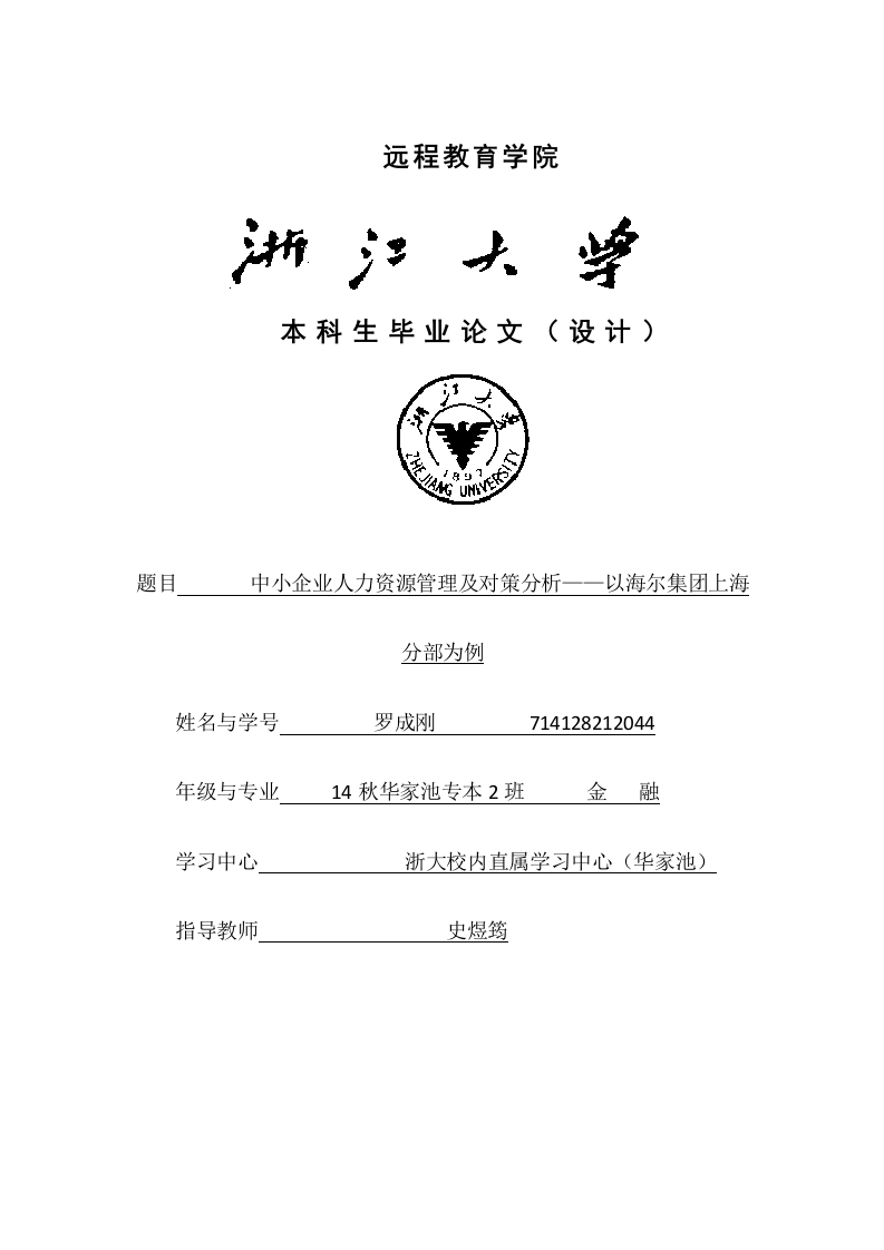 远程教育学院本科生毕业论文(设计)题目中小企业人力资源管理及对策分析一一以海尔集团上海分部为例姓名与学号罗成刚714128212044年级与专业14秋华家池专本2班金融学习中心浙大校内直属学习中心(华家池)指导教师史煜筠浙江大学远程教育学院本科生毕业论文(设计)诚信承诺书1.本人郑重地承诺所呈交的毕业论文(设计),是在指导教师的指导下严格按照学校和学院有关规定完成的。2.本人在毕业论文(设计)中引用他人的观点和参考资料均加以注释和说明。3.本人承诺在毕业论文(设计)选题和研究内容过程中没有抄袭他人研究成果和伪造相关数据等行为。4.在毕业论文(设计)中对侵犯任何方面知识产权的行为,由本人承担相应的法律责任。毕业论文(设计)作者:罗成刚2016年10日论文版权使用授权书本论文作者完全了解浙江大学远程教育学院有权保留并向国家有关部门或机构送交本论文的复印件和电子文档,允许论文被查阅和借阅。本人授权浙江大学远程教育学院可以将论文的全部或部分内容编入有关数据库进行检索和传播,可以采用影印、缩印或扫描等复制手段保存、汇编论文。毕业论文(设计)作者签名:罗成刚2016年10月29日渐江大学远程教育学院本料毕业论文〔设计)摘要摘要人力资源作为一种动态资源,是企业最重要的资源之一,也是其它资源的基础和有效地发挥作用的前提。企业经济效益的大小,最终将取决于其自身的效地运作和科学的管理机制,还取决于对利用劳动力资源合理完善分配的管理机制和科学合理地组织和管理。关键词:人力资源管理:人员流失:工作管理