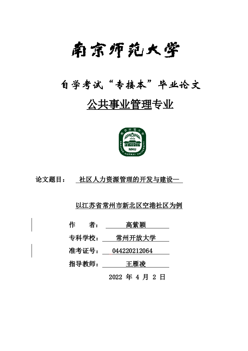 自学考试“专接本”毕业论文公共事业管理专业NNURMAL U论文题目:社区人力资源管理的开发与建设一以江苏省常州市新北区空港社区为例作专科学校:常州开放大学准考证号:044220212064指导教师:王雁凌2022年4月2日毕业论文独创性声明本人郑重声明:1、坚持以“求实、创新”的科学精神从事研究工作。2、本论文是我个人在导师指导下进行的研究工作和取得的研究成果。3、本论文中除引文外,所有实验、数据和有关材料均是真实的。4、本论文中除引文和致谢的内容外,不包含其他人或其它机构已经发表或撰写过的研究成果。5、其他同志对本研究所做的贡献均已在论文中作了声明并表示了谢意。作者签名:日期:目录摘要ABSTRACT2一、江苏省常州市新北区空港社区基本情况.....错误!未定义书签。错误!未定义书签。(二)基本情况……......4二、江苏省常州市新北区空港社区人力资源管理的问题错误!未定义书签。(一)存在严重的身份壁垒…错误!未定义书签。(二)岗位分配不科学(三)人力资源管理理念的落后…错误!未定义书签。(四)考核激励机制不健全错误!未定义书签。(五)市场环境导致人力资源不断流失5三、社区人力资源管理存在问题的原因分析.6(一)市场竞争的挑战因素影响(二)人才需求向综合性方向发展6四、人力资源开发建设策略7错误!未定义书签。错误!未定义书签。3.建立员工旁听重要会议制度。……错误!未定义书签。错误!未定义书签。