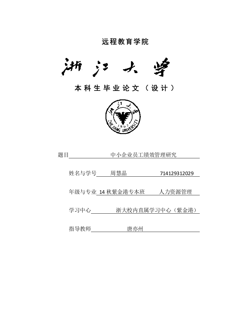 远程教育学院本科生毕业论文(设计)题目中小企业员工绩效管理研究姓名与学号周慧晶714129312029年级与专业14秋紫金港专本班人力资源管理学习中心浙大校内直属学习中心(紫金港)指导教师唐亦州浙江大学远程教育学院本科生毕业论文(设计)诚信承诺书1.本人郑重地承诺所呈交的毕业论文(设计),是在指导教师的指导下严格按照学校和学院有关规定完成的。2.本人在毕业论文(设计)中引用他人的观点和参考资料均加以注释和说明。3.本人承诺在毕业论文(设计)选题和研究内容过程中没有抄袭他人研究成果和伪造相关数据等行为。4.在毕业论文(设计)中对侵犯任何方面知识产权的行为,由本人承担相应的法律责任。毕业论文(设计)作者:周慧晶2016年10月29日论文版权使用授权书本论文作者完全了解浙江大学远程教育学院有权保留并向国家有关部门或机构送交本论文的复印件和电子文档,允许论文被查阅和借阅。本人授权浙江大学远程教育学院可以将论文的全部或部分内容编入有关数据库进行检索和传播,可以采用影印、缩印或扫描等复制手段保存、汇编论文。毕业论文(设计)作者签名:周慧晶2016年10月29日渐江大学远程教育学院本料毕业论文〔设计)摘要摘要科学管理企业的人力资源是提高企业核心竞争力的关键,而绩效管理作为人力资源管理的重要手段,在人员招聘,晋升,培训,奖励等方面发挥巨大作用。但在实施中往往不能落到实处,更为突出的,问题就是绩效管理的合理问题,该问题已成为中小企业改革中的,难点。本文利用对中小企业调研,归纳出绩效管理中的不合理现象,并且对其进行分析,提出解决方案,以期对中小企业绩效改革有所贡献。关键词:中小企业:绩效管理:问题:方案