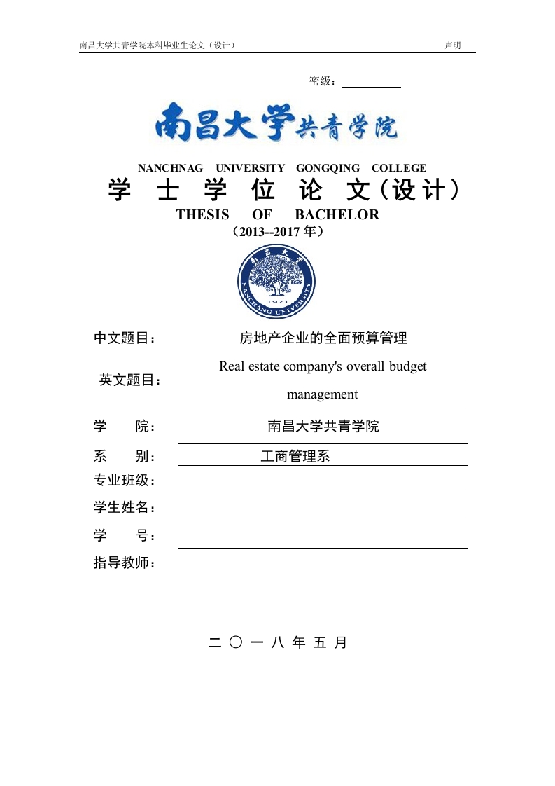 南昌大学共青学院本科毕业生论文〔设计)声明密级:南昌大学共青学院NANCHNAG UNIVERSITY GONGOING COLLEGE学士学位论文(设计)THESIS OF BACHELOR(2013-2017年)中文题目:房地产企业的全面预算管理Real estate company's overall budget英文题目:management学南昌大学共青学院系别:工商管理系专业班级:学生姓名:学号:指导教师:二○一八年五月南昌大学共青学院本科毕业生论文(设计)声明学士学位论文原创性声明本人郑重声明:所呈交的论文(设计)是本人在指导老师的指导下独立进行研究,所取得的研究成果。除了文中特别加以标注引用的内容外,本论文(设计)不包含任何其他个人或集体已经发表或撰写的成果作品。对本文的研究作出重要贡献的个人和集体,均已在文中以明确方式表明。本人完全意识到本申明的法律后果由本人承担。本人签名:日期:南昌大学共青学院本科毕业生论文(设计)摘要摘要随着经济高速发展,市场竞争日益激烈,各界纷纷探索着新型管理模式以适应生存发展的需要。全面预算管理是一种较佳的管理模式,因为全面预算管理具有预算的基本功能,即以数量关系表示企业生产经营各个环节的资源需求,但是弥补了传统预算的缺陷,是一种具有战略概念导向的综合管理工具,具有科学性系统性全面性的特点。房地产行业是我国的支柱产业之一,故而本文中以房地产企业为例,对其全面预算管理问题进行探究。文章首先概述了研究背景、意义、方法等:其次对全面预算管理的概念及特征以及相应的理论进行了概述;再次以M房地产企业为例对其全面预算管理问题进行了分析,并指出其全面预算管理中存在的问题;最后提出了房地产企业全面预算管理水平提升的措施。以期加速房地产企业健康转型,降低运营成本,优化资源配置,实现战略目标,促进其可持续发展。关键词:房企产企业:全面预算管理:制度构建