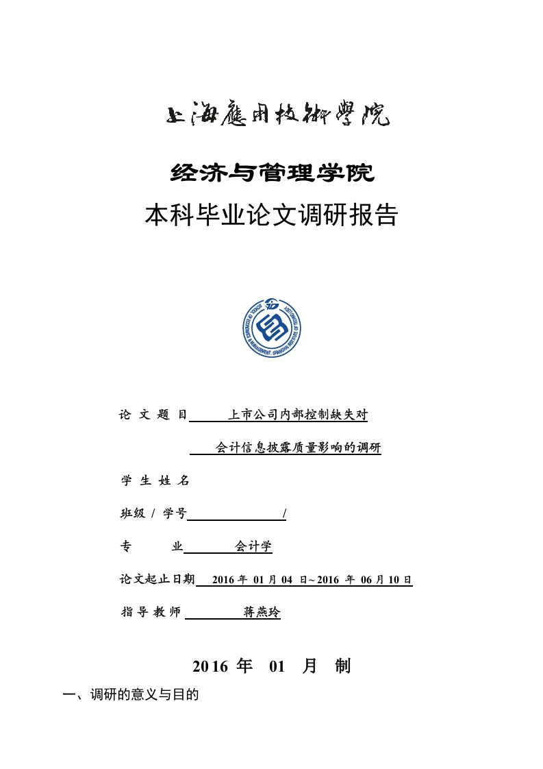 经济与管理学院本科毕业论文调研报告论文题目上市公司内部控制缺失对会计信息披露质量影响的调研学生姓名班级/学号专业会计学论文起止日期2016年01月04日~2016年06月10日指导教师2016年01月制一、调研的意义与目的研究目的:会计信息是政府、投资人等企业利益相关者进行公司决策的一项重要依据,质量差的会计信息会阻碍企业利益相关者做出恰当的决策,产生恶劣的影响,因此提高会计信息质量迫在眉睫。本文拟从内部控制角度出发,对二者之间的相关性进行研究,为企业提供提高会计信息质量的一个途径,为政府、投资者等企业利益相关者提供制定决策的一个参考。本文通过研究上市公司内部控制缺失对会计信息披露质量的影响,力图找出对现有的上市公司内部控制进行合理调整和改进的路径,这有利于提高上市公司会计信息披露质量,保证广大中小投资者利益,促进中国上市公司和资本市场的健康发展。研究意义:我国理论界对内部控制制度等相关问题己进行了很长一段时间的研究,从整体角度看,我国学者对内部控制的相关研究主要在于系统地研究内部控制的理论与实务问题方面,更多的是关注内部控制制度的构建与执行问题。目前,研究内部控制对财务报告的有效保证作用的文献数量相对较少,特别是对本文所研究的内部控制缺失与会计信息披露质量的相关性的文献还不多见,本文关于内部控制缺失与财务报告会计信息披露质量相关性的研究恰好丰富了这方面的文献。本文的研究可使投资者、债权人以及其他利益相关者理解上市公司内部控制报告前后公司财务报告的会计信息质量能否提高且在哪些方面有显著区别。本文的内部控制缺失与会计信息质量相关性研究结果可以为利益相关者正确解读会计信息,更新投资决策理念,指导投资策略提供一定的参考。二、研究方法与内容框架研究方法本文拟以实证研究为主,规范研究与实证研究相结合的方法,研究上市公司内部控制对会计信总披露质量的影响。首先对内部控制和会计信息披露的定义、现状及其成因进行分析,得出内部控制对会计信息披露质量产生的影响。而后在理论分析的基础上,提出本文研究的相关假设,设立解释变量和被解释变量,并将前人研究成果中影响会计信息披露质量的其他因素作为研究的控制变量,以此来规范内部控制对会计信息披露质量影响的结果,之后建立实证分析回归方程。最后运用实证分析软件,对模型进行实证分析,得出内部控制对会计信息披露质量影响的结论,并根据研究结论,提出改进我国上市公司会计信息披露质量的措施。实证研究以2008在深交所上市的公司为基础,选取研究样本,把样本公司2008年年报及内部控制自我评估报告中可以反映公司内部控制建立健全情况的数据进行归集,以此来反映上市公司的内部控制总体水平,进而建立回归模型来检验内部控制对会计信息披露质量的影响:另外,还选取了内部控制缺陷、内部控制审计意见两个因素作为解释变量来进行回归分析,进一步来反映内部控制对会计信息披露质量的影响。(二)内容框架本文分别从理论和实证两个方面进行分析。理论方面,首先对国内外对内部控制和会计信息披露质量及其关系的相关文献进行综述,通过对比国内外的研究,发现我国关于内部控制对会计信息披露质量的研究还处于起步阶段,本文对此进行深入研究,具有理论和现实意义。之后,对内部控制和会计信息披露的定义进行界定,同时阐述两者的现状、成因,并从目标、制度基础、产生动因、运行机理四个方面来揭示内部控制与会计信息披露之间的共性,为实证分析中假设的提出作理论的铺垫。在实证方面,文章首先根据前面介绍的国外研究现状以及理论研究提出了三个假设,然后进行了实证检验。最后得出本文的结论,并针对现有情况提出改进建议。三、调研的数据与分析因为深交所对在该所上市的公司的信息披露进行了评级,这便于相关数据的收集和筛选,所以本文选择用2008年深市上市公司为研究对象。本文从在2008年深市有信息披露评级的所有上市公司中,先剔除ST、PT公司和属于金融保险业的公司以及数据不全的公司后,以余下的595家公司作为本文研究的样本。有关财务数据取自于CSAR数据库:内部控制评分的数据来源于各上市公司2008年的财务报告和内部控制自我评价报告:会计信总披露质量的数据取自深圳证券交易所网站“诚信档案"中的“信息披露考评”栏。相关数据手工录入EXCEL2003,运用SPSS17.0软件进行统计分析。通过对表3.1中内部控制的变量进行描述性统计分析,本文得出如下结论:在本文选取的595家样本公司中,有458家公司的会计信息披露质量被评为优秀或者良好,占总比例的76.79%。上市公司中,大部分企业的会计信息披露质量是处在合格之上的,但是仍存在有的公司被评为不合格,说明我国会计信息披露质量还有待改进。公司聘请注册会计师对内部控制自我评估报告发表审计意见,并出具鉴证报告的有120家公司,占所有样本公司的20.17%,比例偏低。可见,虽然在《企业内部控制基本规范》中规定公司可以聘请审计机构针对内部控制的有效性发表独立的审计意见,但是这一规定并没有得到上市公司足够的重视。我国上市公司内部控制总体水平偏低,ICI的平均得分为26.2050分(总分为33分),ICI的最高为31分,最低只有16分,