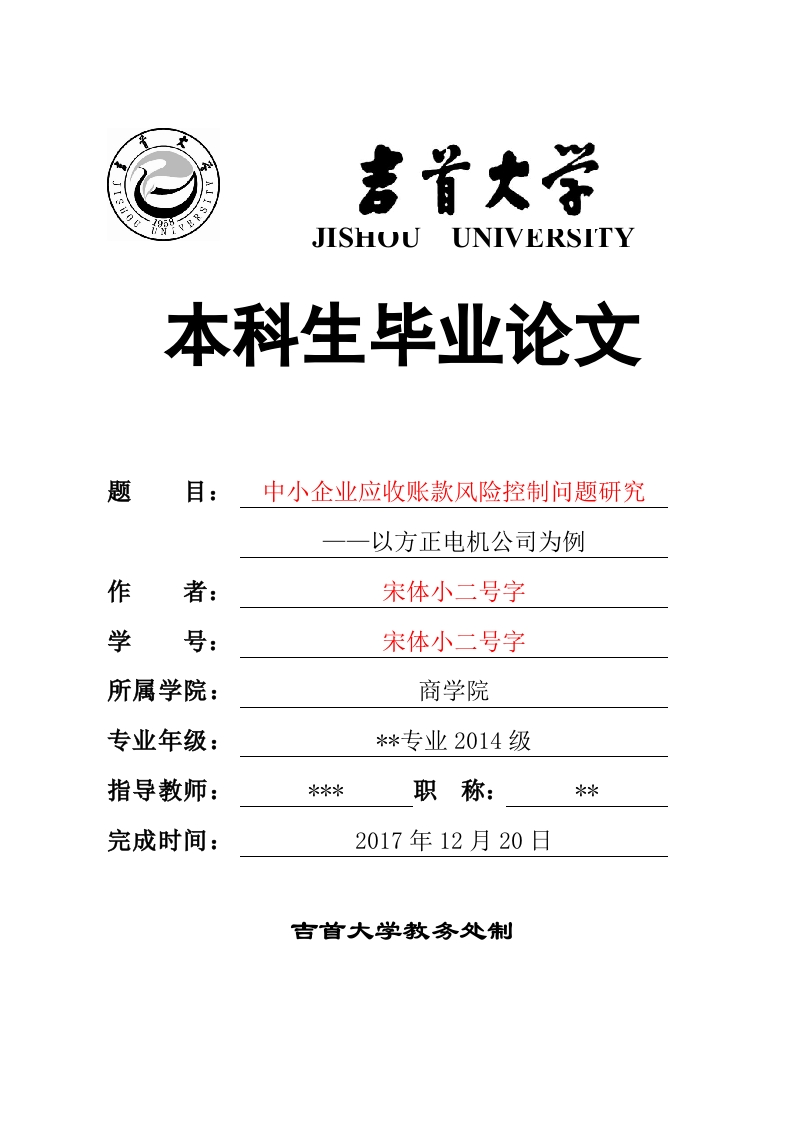 JISHOUUNIVERSITY本科生毕业论文题中小企业应收账款风险控制问题研究以方正电机公司为例作宋体小二号字学号:宋体小二号字所属学院:商学院专业年级:*专业2014级指导教师:职称:完成时间:2017年12月20日吉首大学教务处制中小企业应收账款风险控制问题研究目录Abstract.…、绪论…(一)研究背景及意义.(二)国内外研究综述…1.国外研究综述…2.国内研究综述.3(二)研究内容及方法二、应收账款风险控制相关理论(一)应收账款风险控制的内容与方式.4(二)应收账款风险控制的主要类别及影响因素.4三、方正电机公司应收账款风险控制的现状及存在问题..5(一)方正电机公司应收账款风险控制概况1.方正电机公司简介2.方正电机公司应收账款风险分析…53.应收账款风险控制的措施与成效.…8(二)方正电机公司应收账款风险控制存在的问题.81.销售机制不健全.…2.信用机制不健全.83.现有风险转移措施不全面….9四、方正电机公司应收账款风险控制的完善措施(一)重建销售考核机制.….9中小企业应收账款风险控制问题研究(二)建立系统的客户信用评估体系10(三)对现有风险进行分散或转移10参考文献13