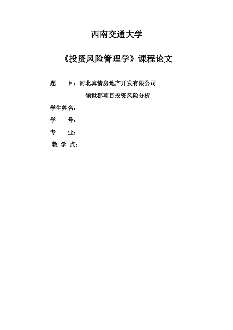 西南交通大学《投资风险管理学》课程论文题目:河北真情房地产开发有限公司领世郡项目投资风险分析学生姓名:学号:专业:教学点:摘要:企业投资中不可避免的会遇到风险,本文以河北真情房地产开发有限公司领世郡项目为例,分析其投资中可能存在的风险。文章首先对领世郡项目进行了概述,其次指出领世郡项目的投资风险,最后针对这些风险提出相应的措施。以期降低企业风险,促进企业的进一步发展。关键词:房地产公司:投资风险:规避措施一、领世郡项目背景河北真情房产在2015年6月中旬投中了领世郡这个项目的地块,并做出如下规划,一地上用地建设238700平方米的建筑,二地下用地94900平方米,一共用地183600平方米,单建筑占333600平方米。此项目位置在天津西青津港路东,地皮是用来建设居民住房的,项目地块占地面积大,四面分别邻近,居住区、津伟道、一片空地和津兴道。此地块未来发展趋势良好,交通便利,即靠近高速路还靠近地铁线,并且周边基础设施完备。现阶段河北真情房产对上述地块抱有极大热情,是着重开发的一个项目,这时就适合用AHP中有关模糊边界、不定量数据,把它们定值,方便计算的方法来评价。最后算出此项目存在很高投资风险,需要公司对这项计划开展防范风险措施。二、领世郡项目的投资风险分析1.和大多数房地产项目一样,其具备有以下共有风险:(1)投资周期长。关于房产投资这一方面,一般来说,开发商对所准备投资的项目开发时间长短,直接影响着投资后收益'。投资一个项目,要从多方面考虑此项目的继续性,如从前期考虑,挖掘机会、项目是否可进行,后期考虑施工时具体需要进行什么样的规划,最后完工后给房屋制定一个合适价位、客户进行购买时买家和卖家之间签订合同制定等。所以所,一个项目需要很长时间来制定,完成这个计划需要更长时间。这样看来如果投资者在制定项目计划时所用时间太长,那么项目在长时间中发生改变的可能性更大,投资者在这种变化下往往无法预测未来变化趋势,容易出差错。并且,如果确定了这个项目,资金快速注入建设,一但出现问题很难调节未来变化情况。(2)投资成本高。房屋是人类的避风港,每个人都需要的物质条件,作为生活中必不可少的产品,虽然它的市场价值很高,但投资的金额也很高,从几百万到上亿元不等。并且,房地产这个项目,在没有建造完之前投资者不仅不能过得利润,还要为中间出现的一些问题进行重新规划,又要投入一大笔钱财。(3)投资项目无法移动和个别性。土地是固定的,它不可能因为位置不好随意变动,无法移动,因为土地的无法移动使得建设在土地上建筑物也无法移动,固定在土地所在位置,总体称为不动产。房地产商投资的就是房屋,而房屋固定性就是它不同于其他产品的特点。2.本文谈论的项目投资过程中有三阶段风险,一是房屋建设,前期,中期和后期。领世郡项目投资风险一般历经三个阶段,分别在建设前期,建设中期和建设后期。1赵立州.房地产企业财务风险预警指标体系研究D]沈阳理工大学,2018.其中前期主要有,融资风险和项目位置风险两种2,中期包括,涉及风险、控制成本最低化风险、管理风险、技术结果是否符合标准风险这四种,后期主要是市场波动风险、销售价格过低无法回本,过高没人买的风险等。前期风险包括融资风险、项目地点风险:建设中期风险包括涉及风险、成本控制风险,管理风险,技术质量风险:建设后期风险包括市场变化风险、销售价格风险等。这三种风险中,据计算表明,前期风险是三种中最危险的一种,并且其中融资阶段的风险大于其他几种前期风险,所以,河北真情房产需要特别关注一下公司融资阶段,注意此阶段是否合理,是否有安全保障,前景预测有没有规划。建设前期风险对整个的投资风险影响程度最大,而在建设前期的风险因素中,根据计算的权重,得出融资风险在建设前期风险中的影响程度最大,因此,河北真情房地产开发有限公司的融资情况需引起投资者的重视。3融资风险:真情房产将自身拥有的资金投入到项目中是不合理的,而且此公司的母企业在后续中没有给予资金帮扶,所以公司只能通过融资的方式取得后续工程所需资金,以保证工程顺利进行下去。真情房产以往大多数工都是先用开发工程预期取得的利润偿还以前项目融资贷款,同时再次用等同价值或者更好价值的地皮作为再次贷款抵押品,这种做法公司从2015年开始,并且2016年再次启用。这说明,如果公司在无法预知未来销售利润的情况下,是不能用自身拥有资金来偿还通过融资方法取得的贷款,这样公司就不能确保方式占比呈现缩小形式,这时公司只能依靠建设项目的预期收入来还融资方式借来的钱。房产这种投资项目相比其他来说经历时间长,这种时间往往也是不确定的,多种不确定因素最终导致真情房产在资金融资方面遇到的麻烦遇到预知,由此可以确定,这家公司存在很大程度的融资风险。4.成本控制风险:预测成本时,往往不能达到准确计算,这也是投资项目无法达到精确核实的原因之一。未来是不可预知的,就算能够通过一些比例计算,风险预计,那也得到的是不稳定预计,我们没有办法想到以后出现的所有情况,同样,真情房产在建安费用中就有这些问题。公司开发每个项目产生的建安费用同时需要追加投资,这其中除去无法预算固定资金需求量外,人