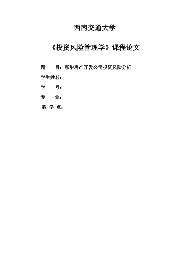 西南交通大学《投资风险管理学》课程论文题目:惠华房产开发公司投资风险分析学生姓名:学号:专业:教学点:摘要:房地产行业作为我国支柱产业之一,近年来发展较快。多数房地产公司为了自身的发展进行大量的投资,然而投资涉及的因素较多,极有可能会产生多种风险,需要采取措施以降低风险。因此本文以惠华房产开发公司为例,分析其投资项目中存在的风险,且提出相应的解决措施。关键词:惠华房产开发公司:投资风险:合理投资一、企业投资项目情况在2020年,惠华房产开发公司明确规划所在城市市每人居住面积35平方米,城市人口总和390万人到现在460万人。根据总人口推算,居住城市人口快速增加,人均新建住宅面积有较大发展空间。此外,此城市距离港,澳城市仅需车程2小时内,目前,部分港澳居民投资眼光转向大陆。此城市商品房,高级别墅更容易受到部分港澳人士青睐。第三,由于大部分海外企业代理公司建立年年递增,则公司需办理优秀员工安置住房。第四,居住此市居民收入水平提高,生活品质也在不断提升,此类用户是该公司潜在顾客。以上原因列出投资目标:2016年3月,向该城市区级政府借款1000元资金作为办公费用,并开始准备工作。2016年10月5日该市市级政府划分土地与外商投资企业贸易合作,签订第一例以外商投资企业建筑新村协议,并在12月动工建立。此后将房产划成三份,平均分给外商出售,拆迁居民安置房,商品房出售。二、投资项目存在的主要风险分析(一)资金风险房地产兑换现金会受到市场一定因素价格变化带来损失称为房地产投资变现风险!。房地产特点是:销售时期长短,价值大小会成为变现能力强弱因素。一般情况下,投资种类变现顺序如下:现金,支票,存款,债券,房地产。但是主要决定房地产投资风险条件是:净现今流量,市场行情走向,黄金地段,房地产施工程度,房产价值。第一、税率变化风险在相关房地产投资,开发,经营中出现资金税率发生改变,将影响房地产开发商品,运行成本,公司带来效应发生改变,该变化叫做房地产税率变化。税率变化则代表我国,各级区域财务制度发生改变,一旦发生改变,则对国家,区域政府财务制度受到影响,所以要将税率风险降到最低,避免严重后果。第二、融资风险融资条件因素方法以及应对办法改变将影响房地产生产与经营者收益成果多少,此变化称为融资条件因素。资金运作主要特征有:非自有资金比重程度,抵押贷款数额,资金运作时间长短,资金运用量大小构成是否决定是资金密集型商品。外部资金起着重要条件,会影响产地产公司能否正常运行带来收益,同时投资着者与非自有资金联系紧密相关。】吴卫星,高申玮.房产投资挤出了哪些家庭的风险资产投资?).东南大学学报(哲学社会科学版),2016,18(04)56-66+147.(二)房地产市场风险任何市场是不断变化的,不稳定的,而且是相对的。但在房地产行业中,房价不仅受到供求关系约束,而且市场环境与市场现状两者影响2。房地产市场风险如下:房地产价格起伏影响风险大小:竞争对手变化,项目开发所带来的市场竞争力:房子投资人士出售,租赁时碰上不良买家,租房者。(三)投资方式的风险房子投资方式如:基本建设,楼盘购买,合作开发与购买股权。投资方法不相同那么获得收益也将有所区别,承受风险也有不同。首先,基本建设式要求开发房地产市场前,要按照建筑规章制度进行报建,建立自身房地产项目也是房地产项目建设重要方式。其次,楼宇购买式要求投资者购买楼盘有一定限制,只能在目前构建完整房地产楼盘中进行选择,无权按照投资者所要楼盘格局与风格购买,未构建楼盘中存在大量购买风险。另外,股权开发式要求投资者有资质好,实力高,资源丰富为条件与开发商合作洽淡,但不并具有开发资质与有关房地产经营许可。以上合作是建立合作投资,合作洽谈并通过合作协议进行投资,是房地产开发项目重要伙伴。最后股权投资者要求股权投资者不管是企业还是个人,在对企业股权,货币,无形资产,其他资产进行购买并投资企业作为股权收益。投资者,向关联公司之间存在对房地产公司产生一定风险,所以在投资人士是间接进行购买拥有房地产权利。三、降低项目风险的措施(一)投资决策阶段风险防范在房地产投资项目中风险较高为投资决策时期,如政策,房地产市场等各项风险把控程度,要有优秀人才培训团队与人才储备队伍确立,对其进行研究价值性,加大市场发展与市场变化趋势预备与研究,掌握该项目影响投资政治,经济,社会大环境中所带的影响与波及程度,构建房地产组织与信心部系统,加强合作保险公司对房地产风险预判以及防护措施,保障投资金万无一失,房地产商户要落实加强房地产风险警报,随时关心房地产市场变化,了解房地产投资者现状需求,采用理性价格举措,从而积极应对市场动态,预防价格风险。(二)房地产市场的风险分析房地产投资要全面对房地产行业进行判断,主要影响房地产行业市场宏观因素深层研究,依据我国以及各地区经济水平特征,来确保该城市经济水平趋势处于上升还是下降趋势。其中研究程序中需要数据有:我国与其他地方GDP数值,增长数度,人均GDP,人口规模,人口结构,居民收入水平,居民就业,产业结构,政治稳定,投资规模程度比例等。投资者深入研讨选择特定开发区域发展水平与城市建设情况。如:铁路,公路,