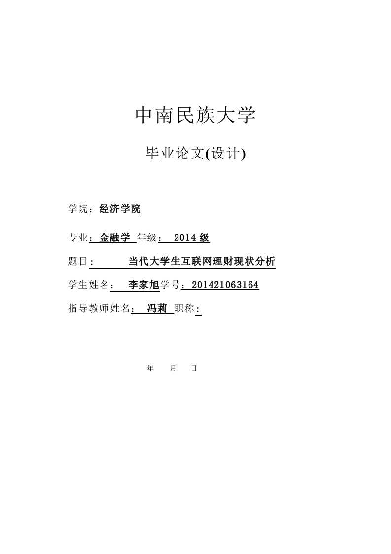 中南民族大学毕业论文(设计)学院:经济学院专业:金融学年级:2014级题目:当代大学生互联网理财现状分析学生姓名:李家旭学号:201421063164指导教师姓名:冯莉职称:年月日中南民族大学本科毕业论文(设计)原创性声明本人郑重声明:所呈交的论文是本人在导师的指导下独立进行研究所取得的研究成果。除了文中特别加以标注引用的内容外,本论文不包含任何其他个人或集体已经发表或撰写的成果作品。本人完全意识到本声明的法律后果由本人承担。作者签名:年月日目录1Abstract…12(二)互联网理财产品介绍.。21.互联网理财产品与传统理财产品对比…2.互联网理财的种类。2(三)互联网的金融的出现对大学生的影响....3(四)文献综述31.国外文献综述.32.国内文献综述3.国内外文献评价.…3二、大学生在互联网理财中体现出来的问题44(二)问卷调查中体现出来的问题..41.大学生的理财观念不强.…42.理财的主动意识不强,缺乏心理准备..44.对自身没有有准确的定位,盲目跟风现象严重…45.风险承担能力不足,可以利用的资金较少,适合的理财产品少..·46.不懂得辨别真伪,容易受金钱诱惑.…5三、对大学生在互联网理财中产生的问题进行分析...55(二)监管体系落后,缺乏监管力度.·55(四)家庭方面5(五)大学生自身变化…1.大学生生活水平发生了变化..…52.大学生心态发生改变…四、对上述问题提出的建议...(一)大学还是呢个互联网理财问题总结…6(二)社会方面…6