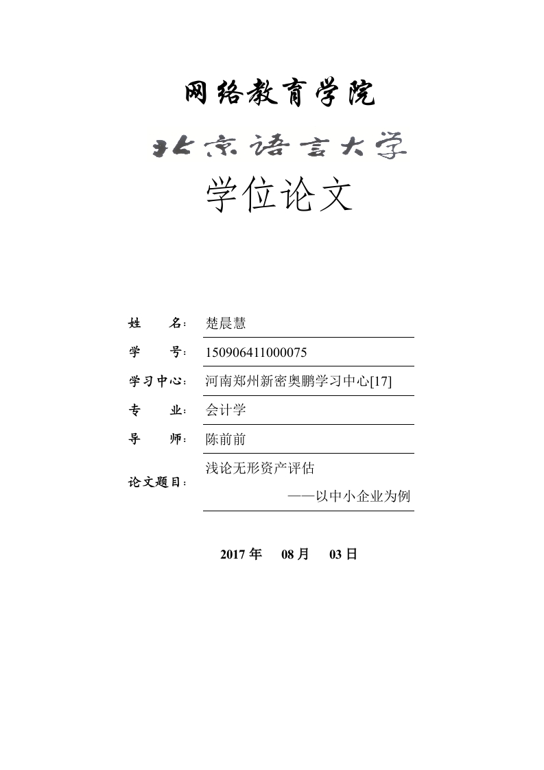 网辂教育学院学位论文姓名:楚晨慧学号:150906411000075学习中心:河南郑州新密奥鹏学习中心[17]专业:会计学导师:陈前前浅论无形资产评估论文题目:一一以中小企业为例2017年08月03日学位论文承诺书提示:根据北京语言大学网络教育学院论文写作的规定,如发现论文有抄袭、网上下载、请人代写等情况,毕业论文一律不及格。同时取消学士学位申请资格。毕业论文不及格者,可申请重写一次,并按重修缴纳费用。本人承诺:本人已经了解北京语言大学的毕业论文写作的有关规定;本人的论文是在指导教师指导下独立完成的研究成果。整篇论文除了文中已注明出处或引用的内容外,绝没有侵犯他人知识产权。对本论文所涉及的研究工作做出贡献的个人和集体,均已在文中以明确方式注明。签名:楚晨慧日期:2017年8月3日摘要无形资产是企业的一项综合性资源,企业人、财、物的管理能力、科学技术的开发能力、国际国内市场的经营能力均可通过无形资产体现出来。当代世界上取得成功的跨国公司无一例外不是与他们拥有大量的专利、专有技术、驰名商标、销售网络等无形资产有关。随着科学技术的发展和知识经济时代的到来,以知识形态为主的无形资产在企业生产经营中的作用越来越引起人们的重视。本文对中小企业无形资产的类别和特征入手,分析我国中小企业无形资产的现实意义,然后分析中小企业无形资产评估过程中存在的问题,提出对应的策略。关键词:中小企业无形资产评估